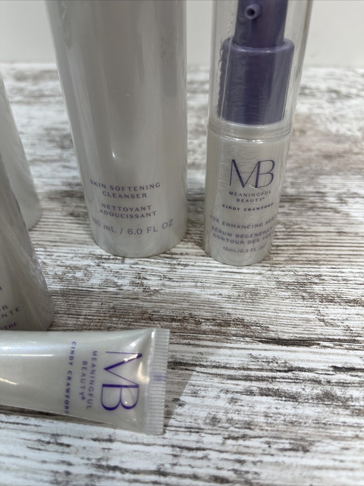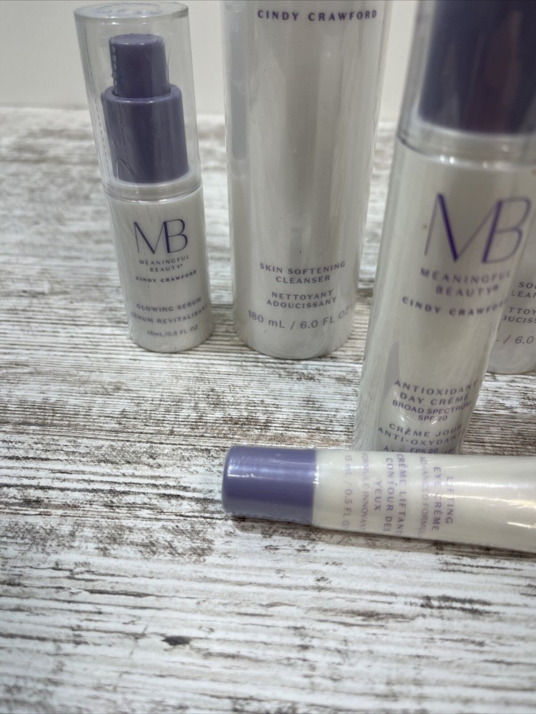 Meaningful Beauty Cindy Crawford Cleanser Glowing Enhancing Serum Day Lifting. You are receiving 1 .5 ounce lifting eye cream, one eye, enhancing serum, one antioxidant, day, cream, 2 skin, softening cleansers, one glowing serum.