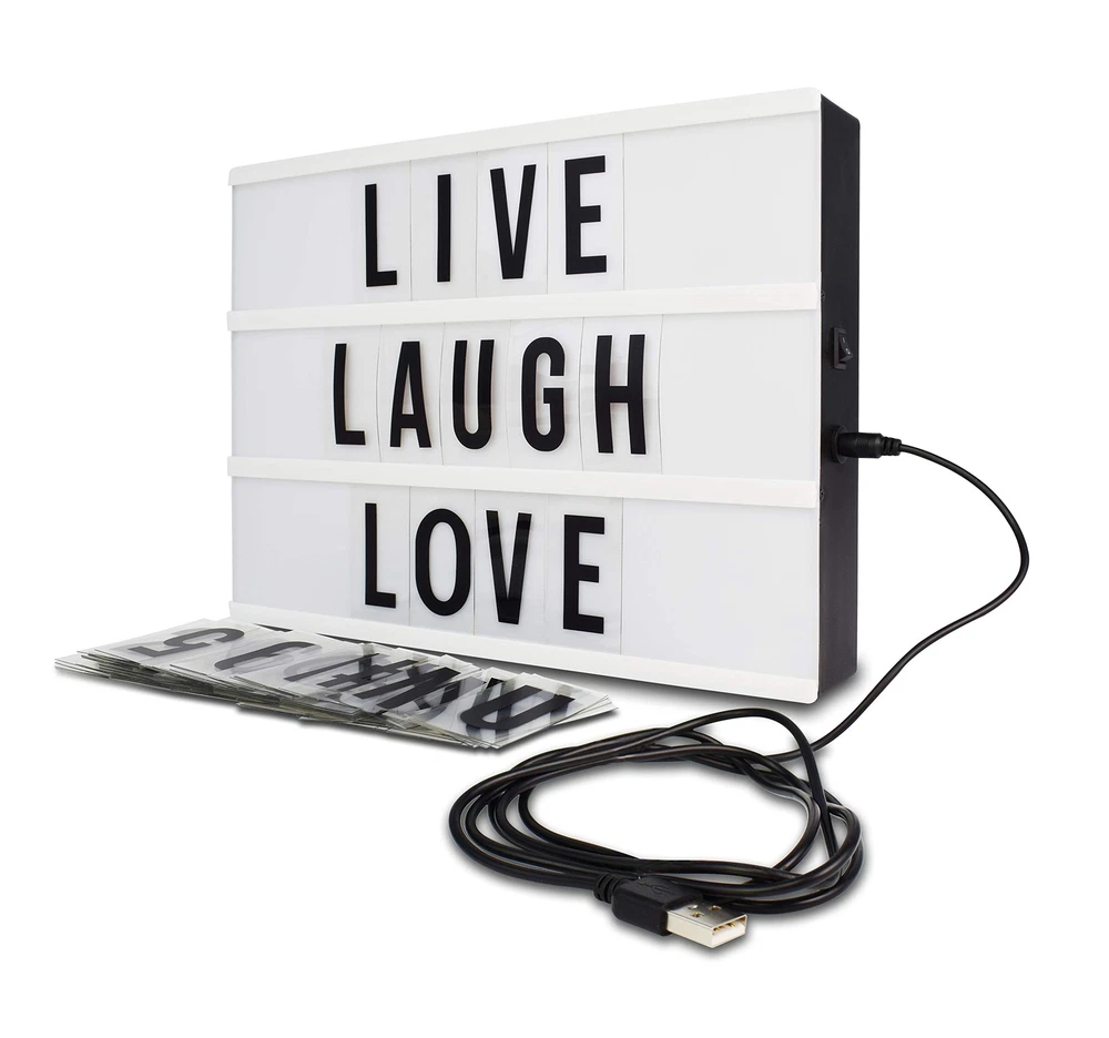 Inspired by old Hollywood vintage cinema, slide interchangeable clear plastic tiles into rails on the front of this sleek light box to create words and phrases. Flip a switch and watch your words light up with life! Great for home décor, wedding décor, birthdays, milestone celebrations, photoshoots, movie nights, and so much more. Set Includes: Led Light Box 109 letters, numbers and symbols. Place it on a tabletop or mount onto a wall and light up your world with fun quotes and phrases. VINTAGE CINEMA STYLE LIGHTBOX: Are you looking for a unique decorative piece with vintage vibes? Then the cinema light box is exactly what you need! The LED light up box is designed to look like those cinema and theater signs that would advertise a movie and share a fun message. You can now write your own fun, inspirational or motivational message on the mini lightbox and create a black-and-white film feel to your space! MORE LETTERS & CHARACTERS: So what message are you planning to write on the cinema lightbox? Thanks to the 109 letters and characters, your options are endless. So be creative and change the message on the light up box as often as you want! The procedure is fast and effortless. DECORATE ANY SPACE YOU WANT: You can decorate any space with the cinema style light up message sign for any occasion. First of all, you can decorate any room of your house and turn on the LED light box once the sun goes down. You can also decorate your office to make it warmer! Finally, you can use the light up box for weddings, Christmas parties and baby milestones. Thanks to the extra long durable USB cable, it won’t be hard to find the perfect spot. USB powered (white USB cable included) or battery operated (6xAA not included)