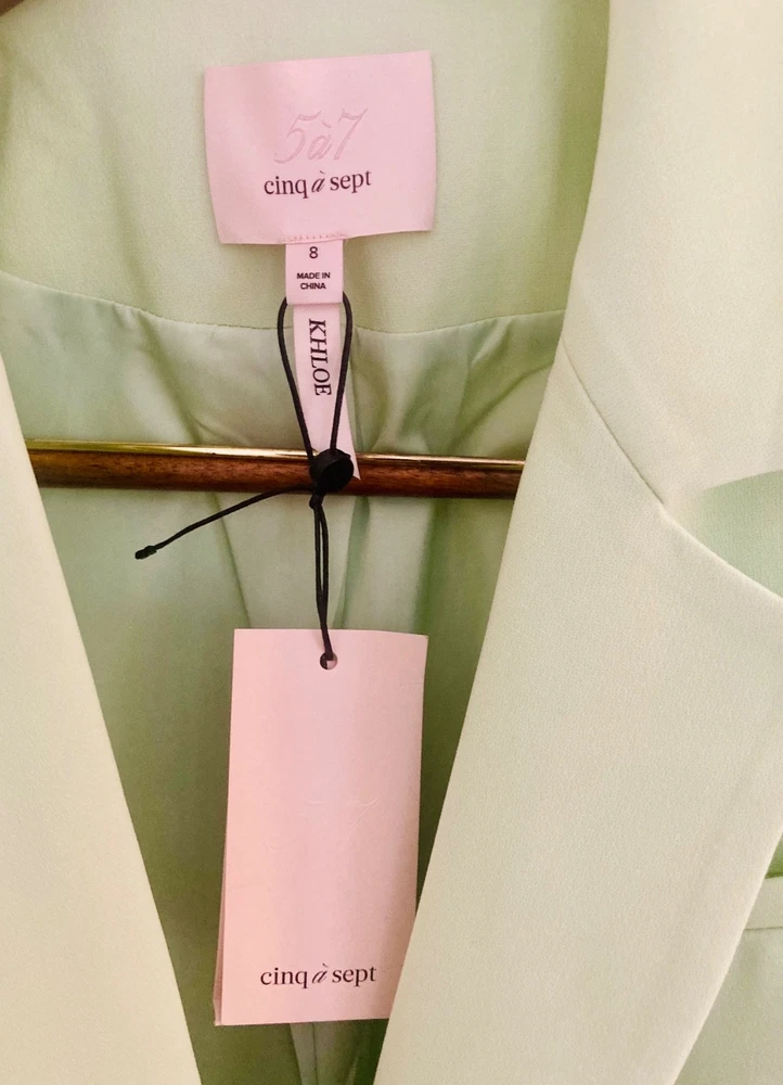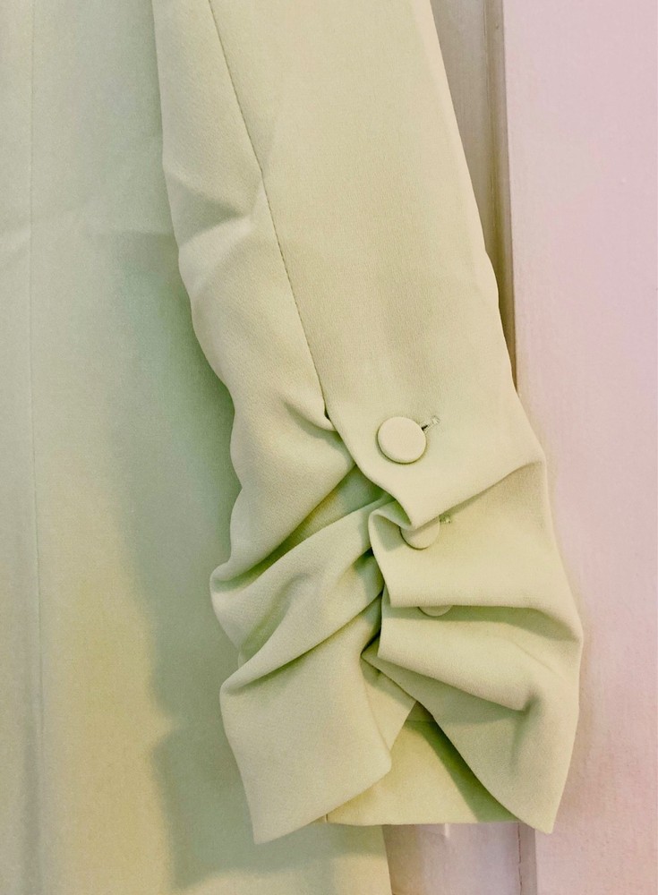 Women’s Cinq à Sept blazer in a fresh light lime shade, brand new with original tags, featuring ruched sleeves and fabric-covered buttons for a polished finish . A versatile size medium piece that works beautifully for the office, city outings, or dressed up for a cocktail look.