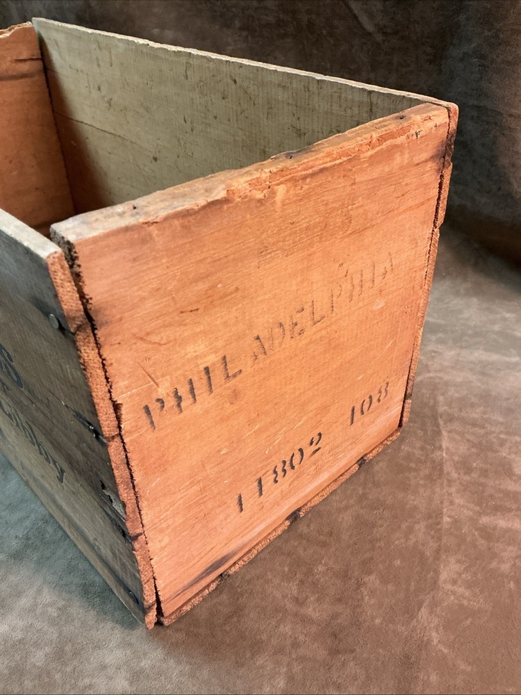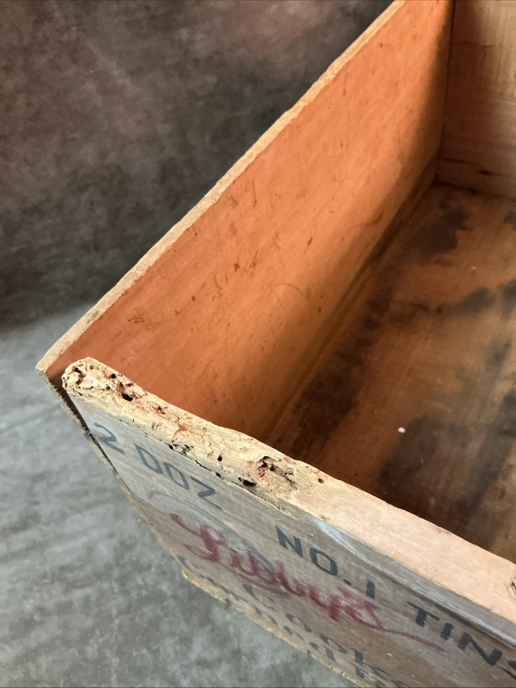 This measures 7 1/4 inches tall 7 inches wide and 15 inches long. Good condition overall there is the one damage spot on the top of the one side where it says two dozen number 1 tins. The top is open no lid or cover.
