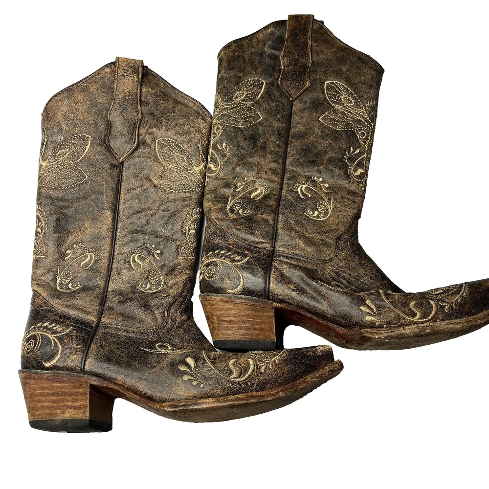 Circle G Women's Cowgirl Boots 6.5 M Brown Dragonfly Stitch Distressed Rodeo There are some markings on the boots. Please view photos for condition.