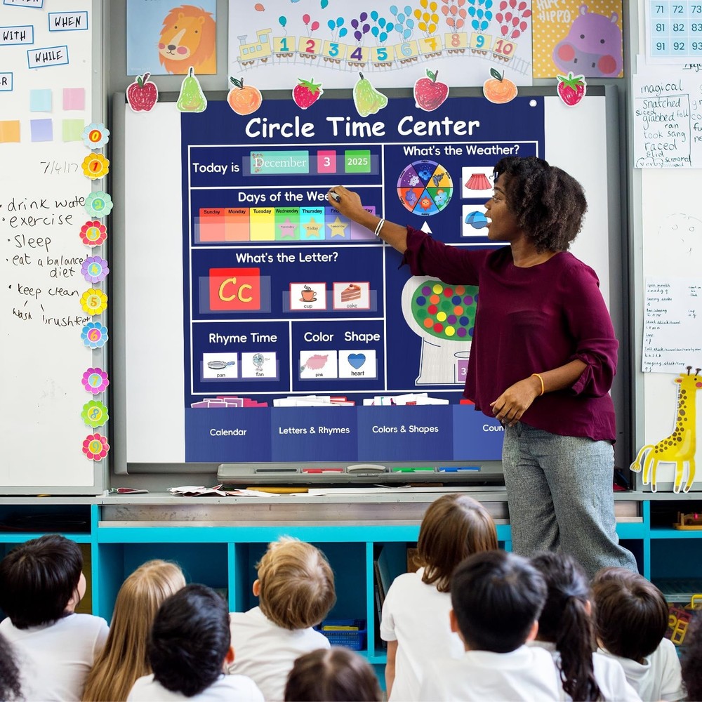 Circle Time Learning Center Classroom Pocket Chart, Circle Time Calendar Preschool Include 224 Cards, Educational Pocket Chart Material, Learning Calendar Weather Letter Counting Color Shape Product Details Color: Blue Brand: Ottkids MPN: Circle Time Center-Blue UPC: Does not apply EAN: Does not apply Product Dimensions: 39.7 x 39.7 x 0.39 inches Item Weight: 2.27 pounds Item model number: Circle Time Center-Blue Manufacturer: Ottkids PVC Imported Circle Time Learning Center Set: The Circle Time Learning Center includes a pocket chart, 224 educational cards, 30 sticky counters, and a round weather wheel. This alphabet learning pocket chart is an important classroom learning resource for teachers to conduct instruction Large Size:Calendar pocket chart measures 39.76"(L) 39.76"(W). This circle time pocket chart features smooth and sturdy metal holes above for easy hanging anywhere, and there are 4 storage pockets at the bottom to store extra cards(not including hooks) Essential Tools for Learning:Our circle time chart provides practice in calendar concepts,talphabet recognition, rhyming words, counting, weather patterns, shapes, colors identification. It covers a variety of topics and makes education fun, greatly enhance children's emotional expression, foundational knowledge and hands-on skills in their daily learning High Quality Material: Ottkids Circle Time Center Chart is crafted from durable 420D polyester, sturdy and tear-resistant.Its transparent PVC pockets are eco-friendly and easy to wipe, leave no residue,giving you peace of mind during use. When you're not using it, this learning pocket chart can be folded and stored without taking up too much space Versatile Application: Circle Time Center Pocket Chart perfect for classroom instruction, family education, student exchange,group discussions, student demonstration and more(Tip: Please allow time to cut the cards before using the centers pocket chart)