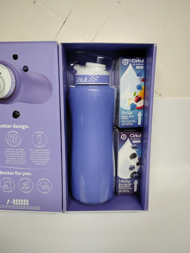The Cirkul 22 oz Purple Stainless Steel Bottle Starter Kit is a high-quality water bottle with a screw-on lid, perfect for camping, hiking, and other outdoor activities. Made of durable stainless steel, this bottle is designed for long-lasting use. The set includes a bottle, flavor cart, and blue lid, making it a convenient and stylish choice for staying hydrated on the go. With its 22 fl oz volume and classic design, this Cirkul bottle is a great addition to any sporting goods collection.