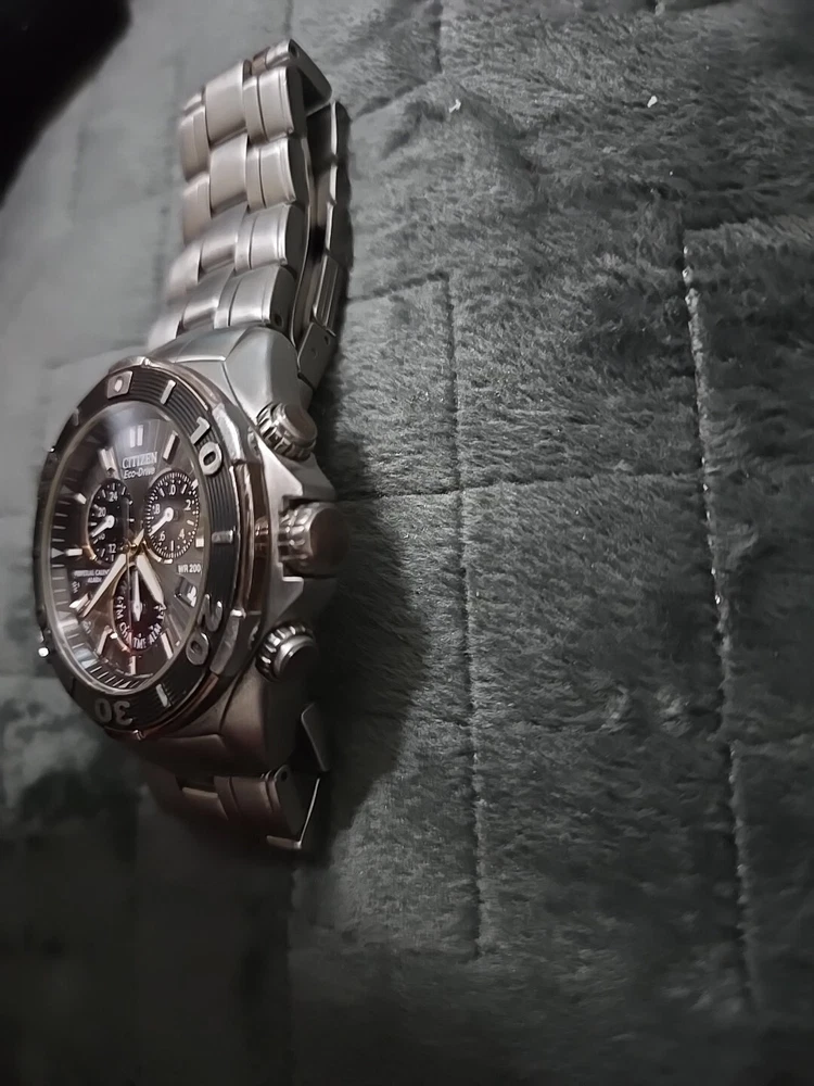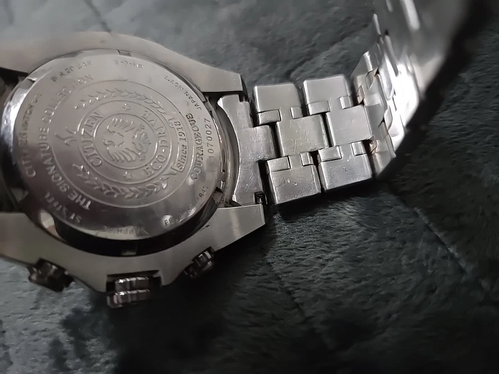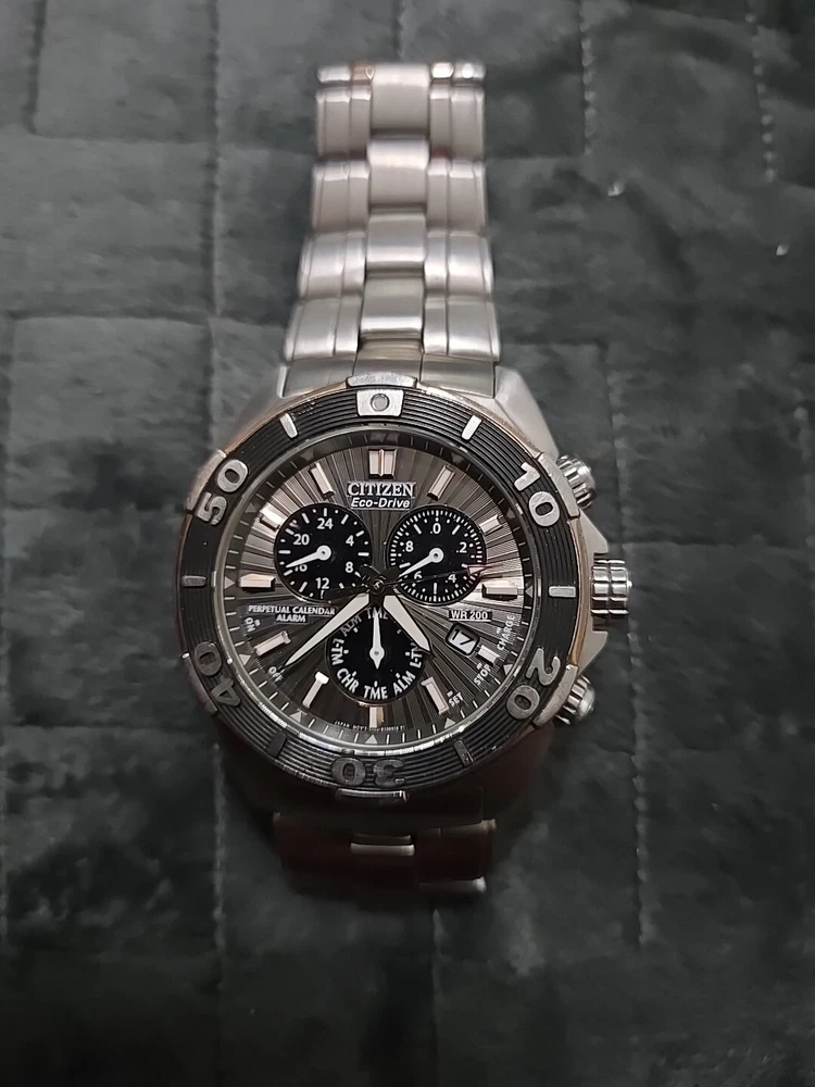 Very Rare Citizen Perpetual Calendar Eco-Drive Signature Collection Courageous Model BL5446-51H Watch Features: - Model: Signature Collection Courageous Model - Power: Solar quartz powered by an accurate Eco-Drive E820 movement. No battery required. - Perpetual Calendar Chronograph: 1/20-second chrono measures up to 60 minutes This watch is used. Has new battery. It does work. It does have scratches. All sales are final. No returns No refunds