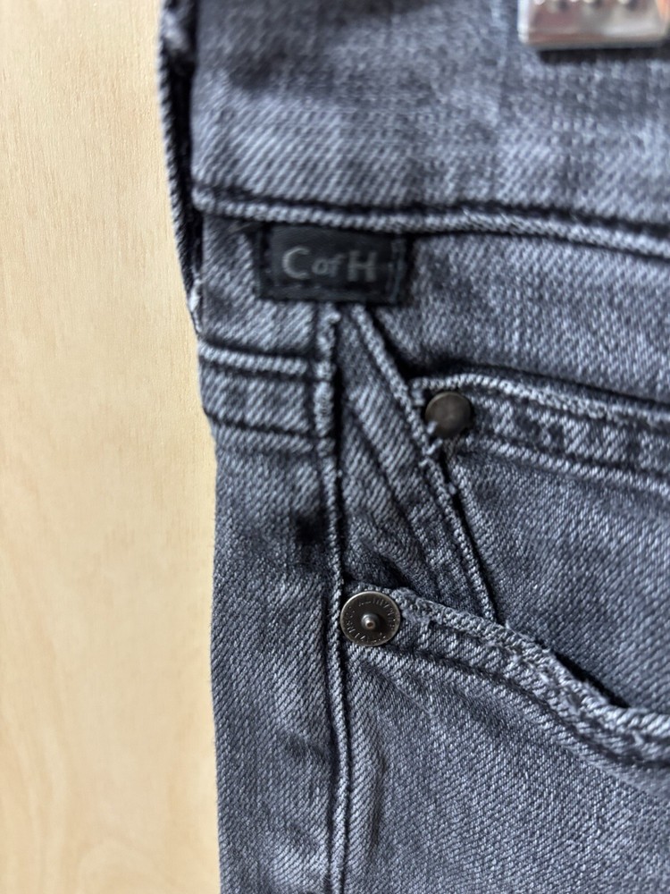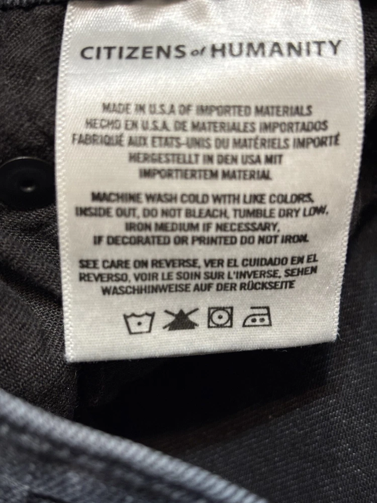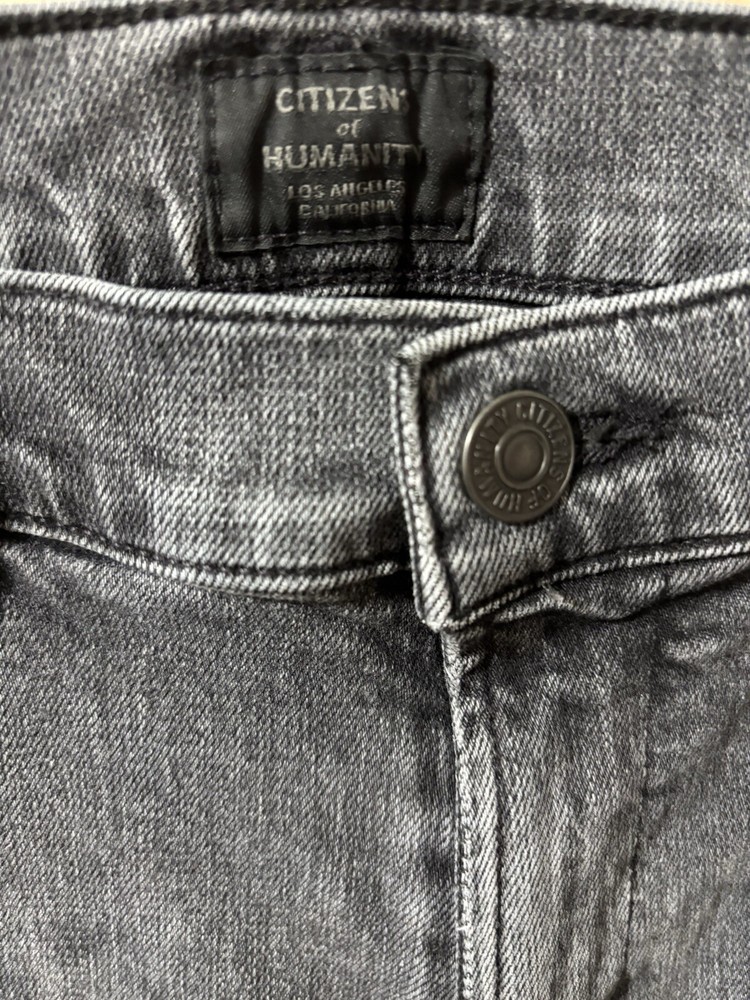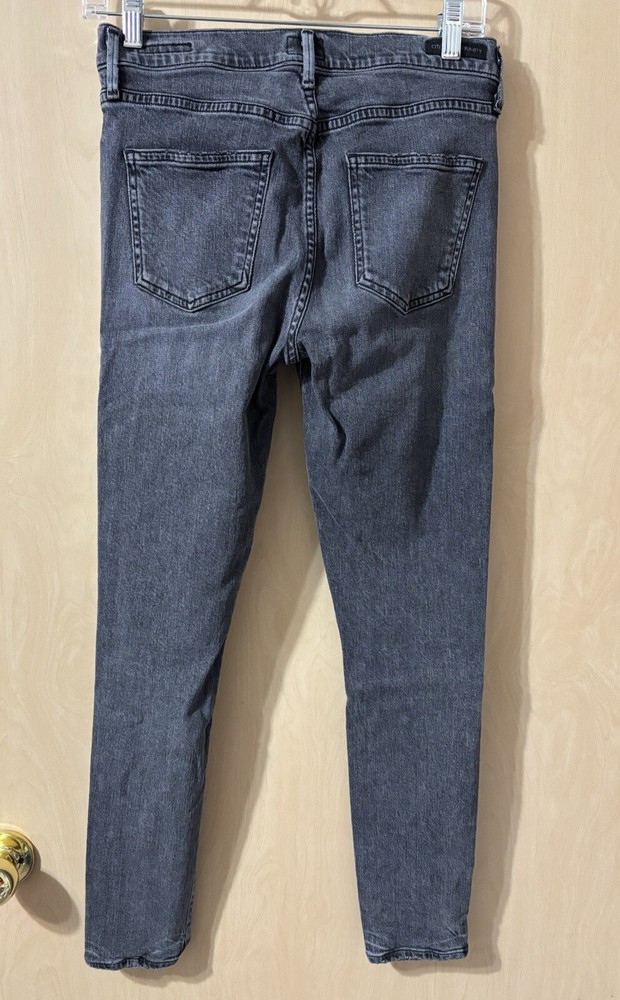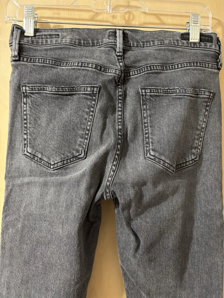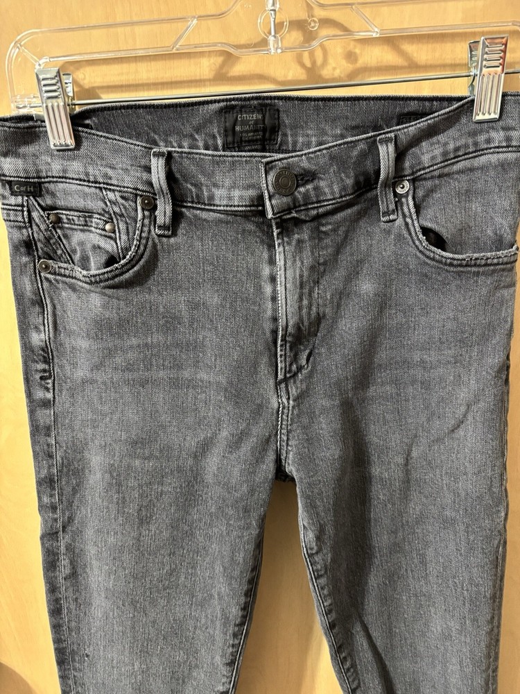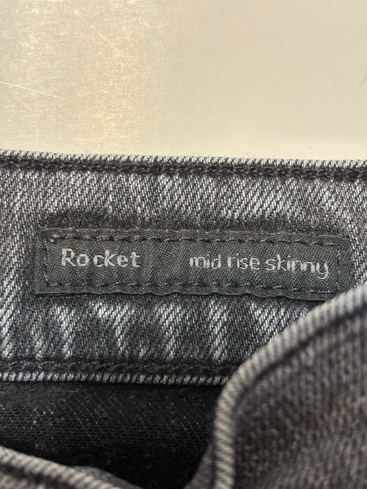 The Citizens of Humanity Rocket Mid Rise Skinny Jeans in a women's size 28 offer a sleek and flattering silhouette in a washed black color. Made from a comfortable cotton blend denim with stretch, these jeans feature a classic 5-pocket design with button and zipper closures. The mid-rise fit and 27-inch inseam make them suitable for various seasons and occasions, while the brand logo accents add a touch of style to this versatile wardrobe essential. In good preloved condition, no flaws. Measurements: Waist: 14” across Rise: 9.5” Inseam: 27”