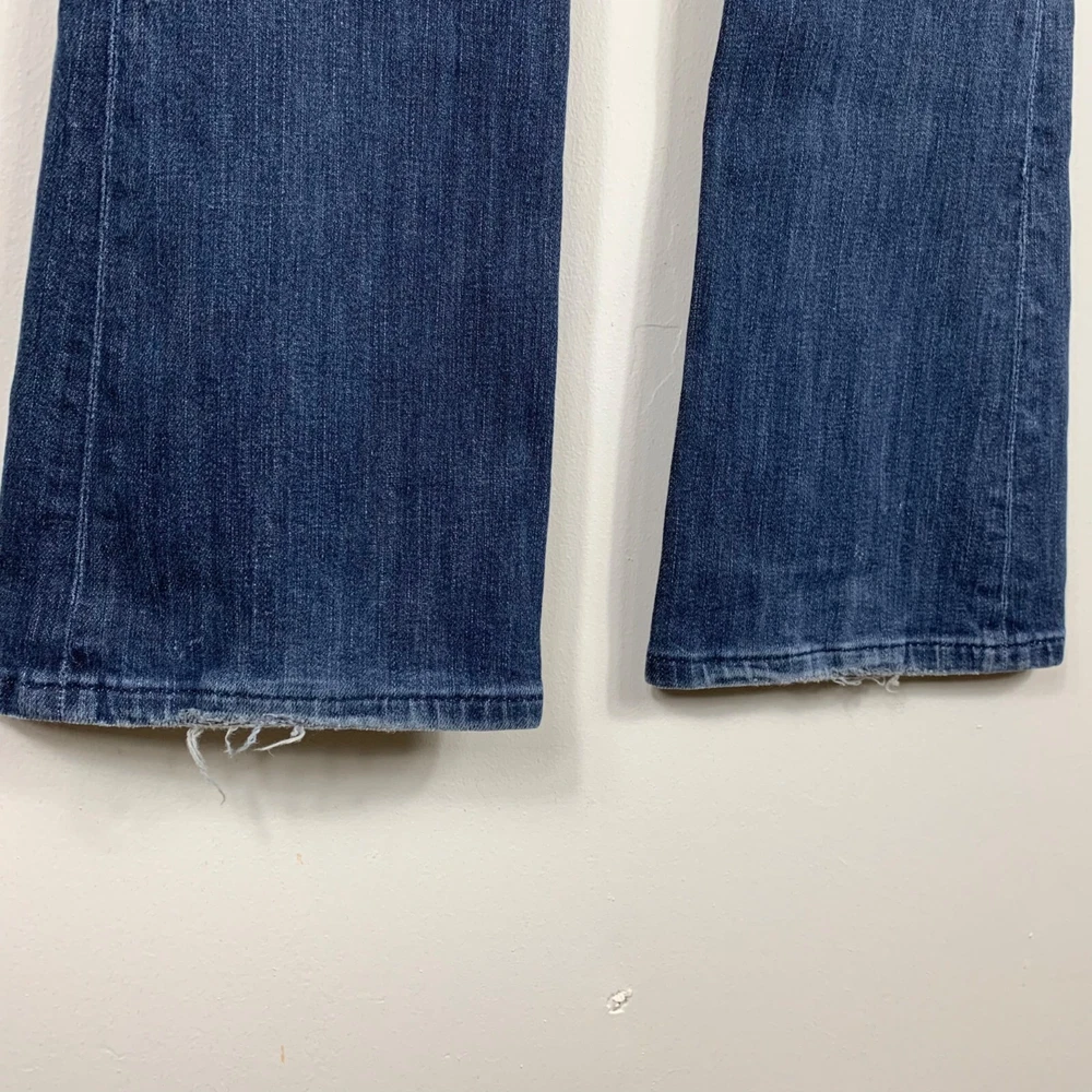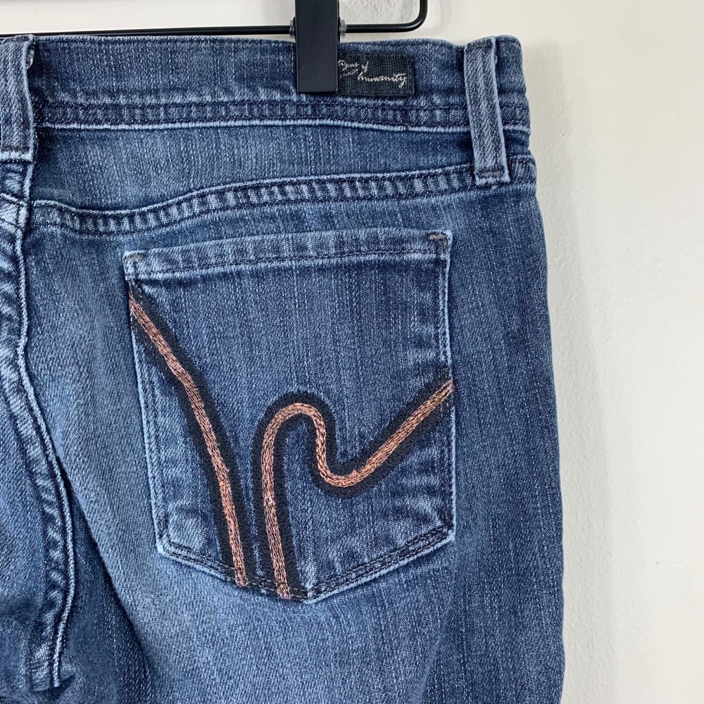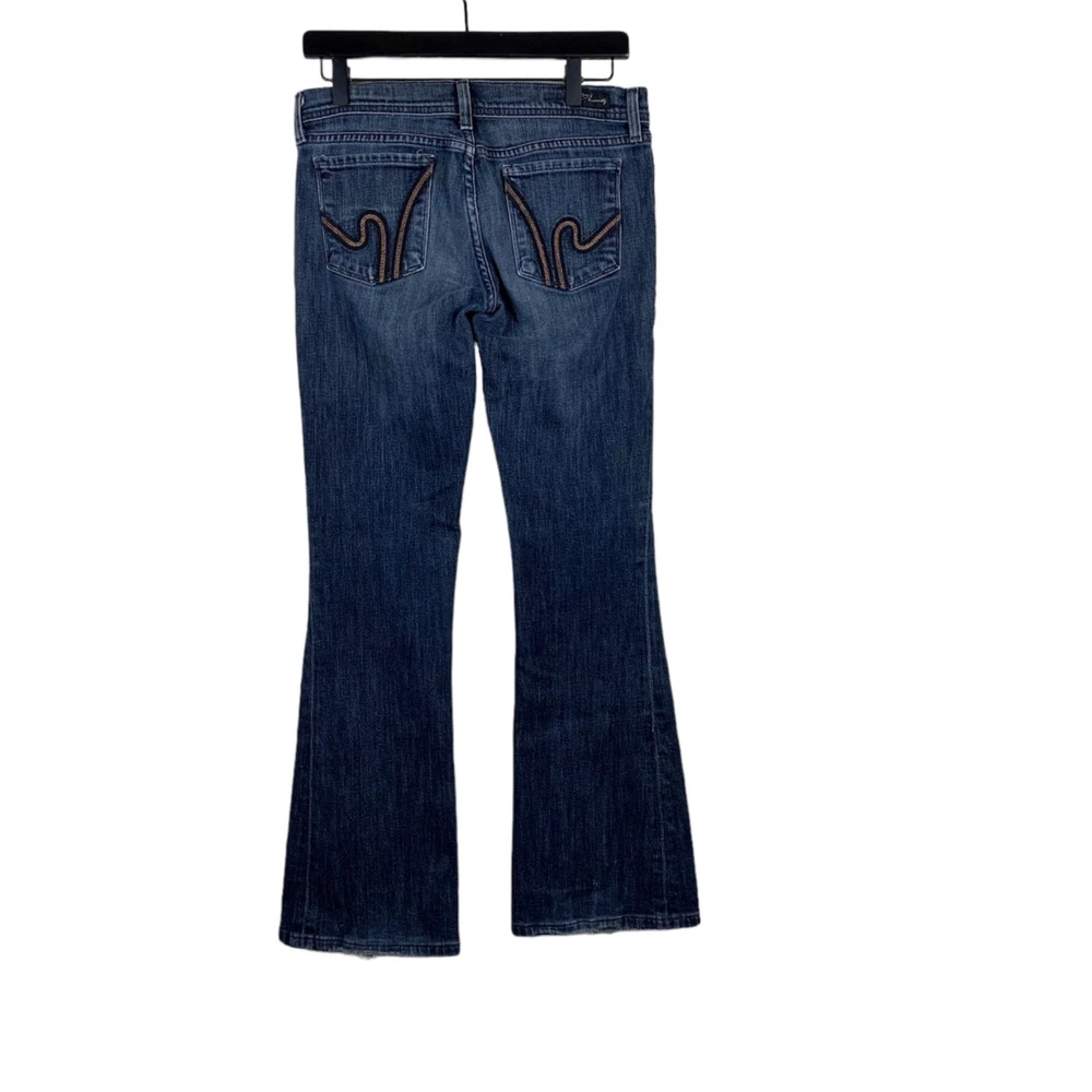 Citizens of Humanity Ingrid Flare Wimbledon #144 Low Rise Jeans - Size 29 There is a little bit of wear on the hems, besides that, these super cool flare jeans are in great shape! Dark wash with a five pocket design, zip fly with button closure. Orange and dark blue embroidery on the back pockets. Half-waist: 15" Inseam: 31" Length: 38" Rise: 7" Measurements are lying flat, and estimates only. 2P25 35-260 1 lb 3 oz Tags: flare jeans, y2K inspired, casual