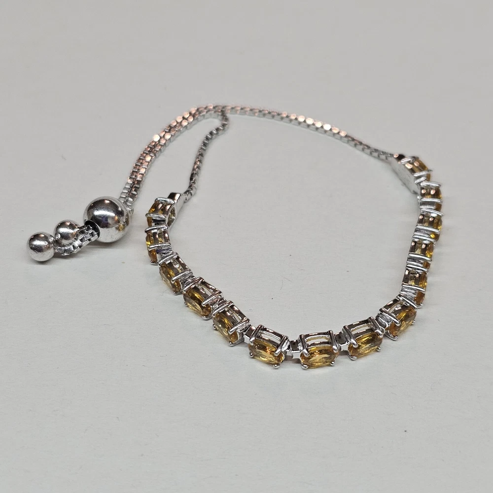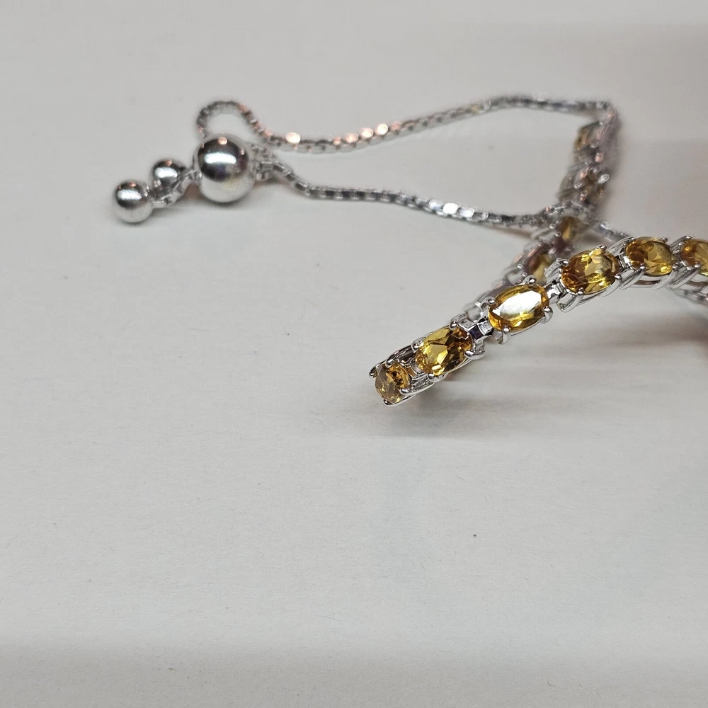 Please see all of the photos as these serve as part of the description. This beautiful bracelet features a series of oval citrine gemstones set in 925 sterling silver. The gemstones are a lovely shade of yellow and the bracelet has an adjustable chain style. The bracelet is made in Thailand. The bracelet is perfect for those who love fine jewelry and want to add a touch of elegance to their outfit. The citrine gemstones are the main attraction and are complemented by the shine of the sterling silver. This bracelet is a great addition to any jewelry collection and can be worn on any occasion.