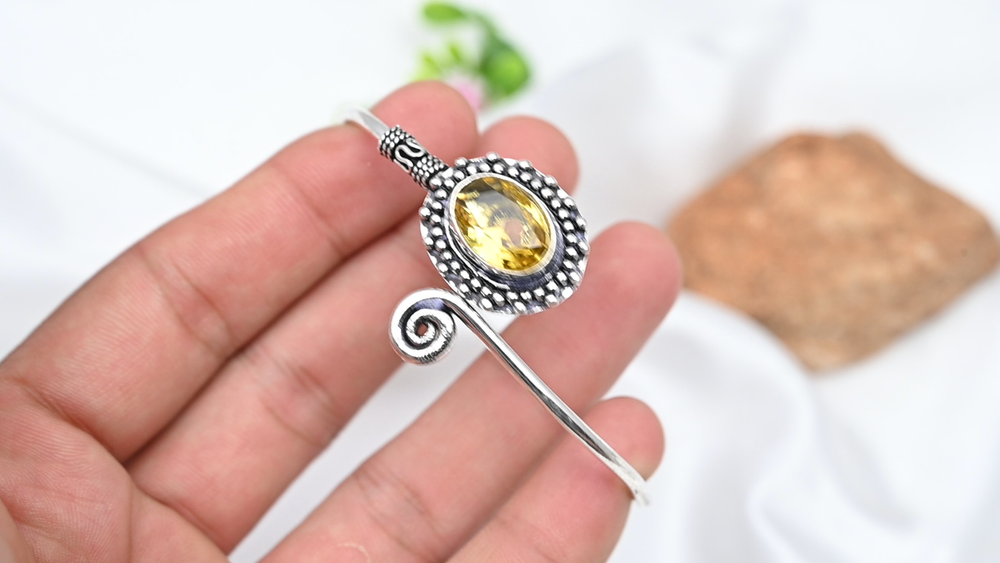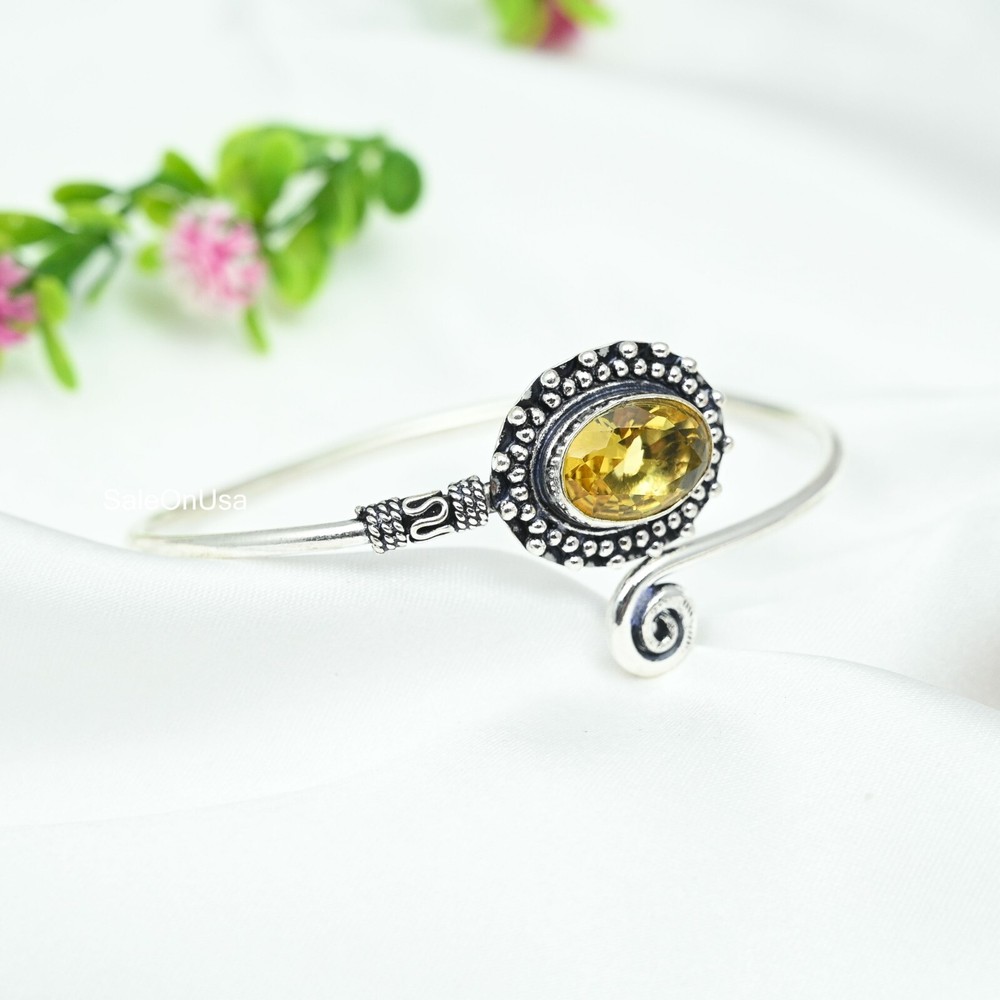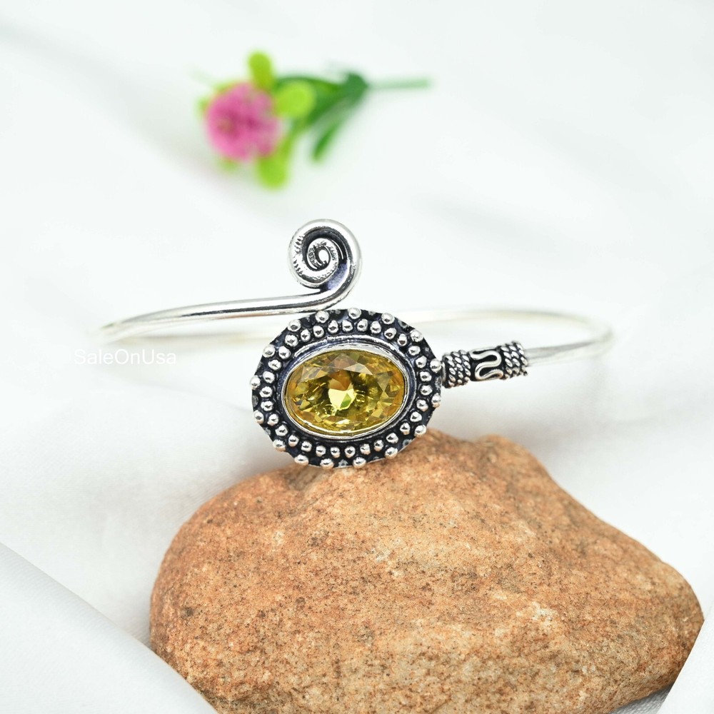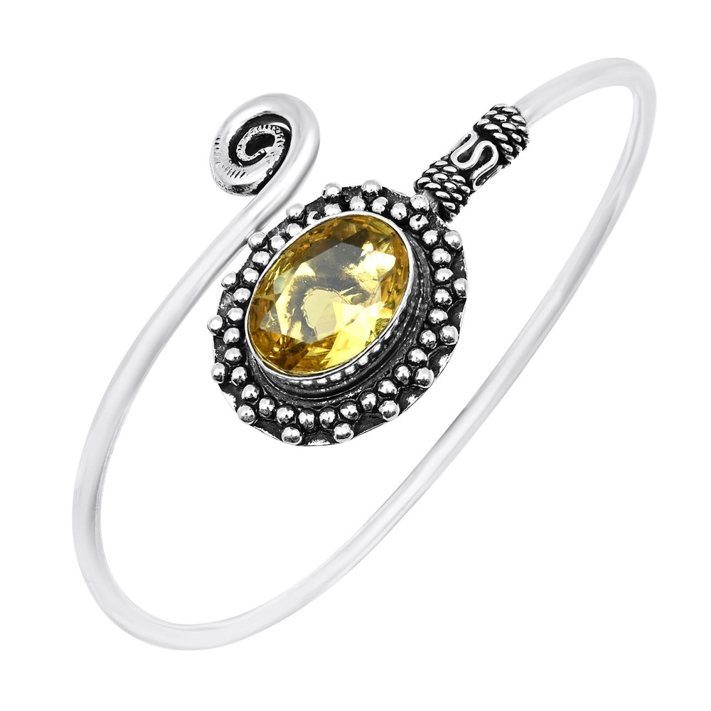 Main Stone Width:N/ACharm Type:Same As PictureColored Diamond Intensity:N/AOccasion:Anniversary, Birthday, Christmas, Engagement, Mother's Day, Valentine's Day, WeddingMetal:Sterling SilverClosure:AdjustableMetal Purity:925Country/Region of Manufacture:IndiaMain Stone Shape:OvalCountry of Origin:IndiaMaterial:GemstoneFeatures:AdjustableNumber of Gemstones:1Chain Type:N/AMain Stone Treatment:Not EnhancedMain Stone Creation:Lab-CreatedStyle:CuffMain Stone:CitrineCollection:HandmadeDiamond Clarity Grade:N/ASecondary Stone:N/AMain Stone Length:N/AShape:Same As PictureBase Metal:Sterling SilverNumber of Diamonds:N/ACut Grade:ExcellentTheme:Beauty, Bohemian, Ethnic, Halloween, LoveTotal Carat Weight:10 carat and aboveBrand:HandmadeSetting Style:BezelColor:SilverMain Stone Color:YellowItem Length:AdjustableDiamond Color Grade:N/AType:BangleMain Stone Depth:N/ACertification:N/A