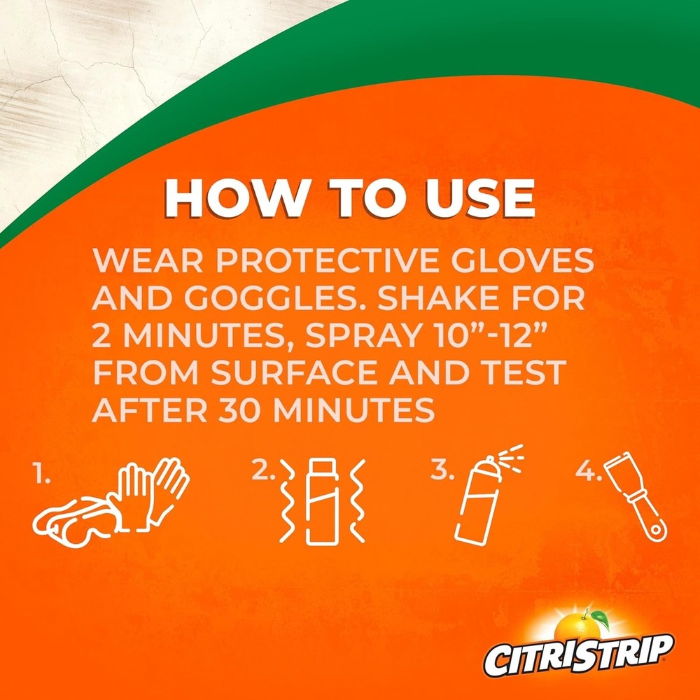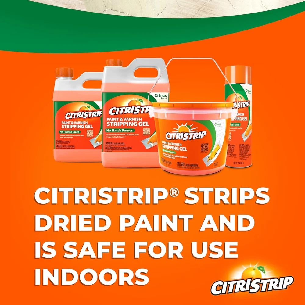 Citristrip Paint & Varnish Stripper Spray 17oz – Removes Latex, Epoxy, Shellac About this item CITRISTRIP Paint & Varnish Stripper is easy to use because it stays wet and active for up to 24 hours allowing stripping of multiple layers in one step. No harsh fumes. Removes dried latex and oil-based paint. for even the newest DIY’er, CITRISTRIP is the effective brand of removers that is pleasant to use because it has a fresh citrus scent. Contains no methylene chloride or NMP (N-Methylpyrrolidone. Contains no methylene chloride or NMP (N-Methylpyrrolidone. Product details CITRISTRIP Paint & Varnish Stripper is easy to use because it stays wet and active for up to 24 hours allowing stripping of multiple layers in one step. It removes five layers of dried latex paint in under one hour. It contains no methylene chloride or NMP (N-Methylpyrrolidone) and is safe for indoor use. This special orange stripper has a pleasant citrus scent. Use CITRISTRIP to remove multiple layers of dried latex and oil-based paint, varnish, lacquer, polyurethane and shellac from wood, metal and masonry surfaces.