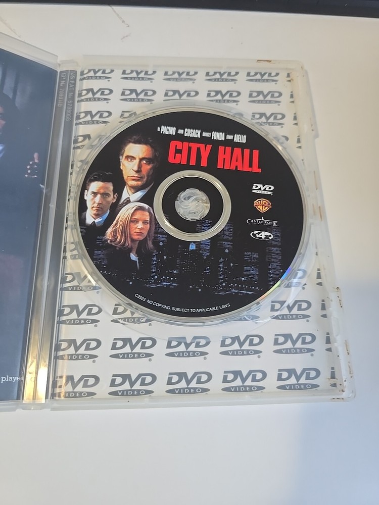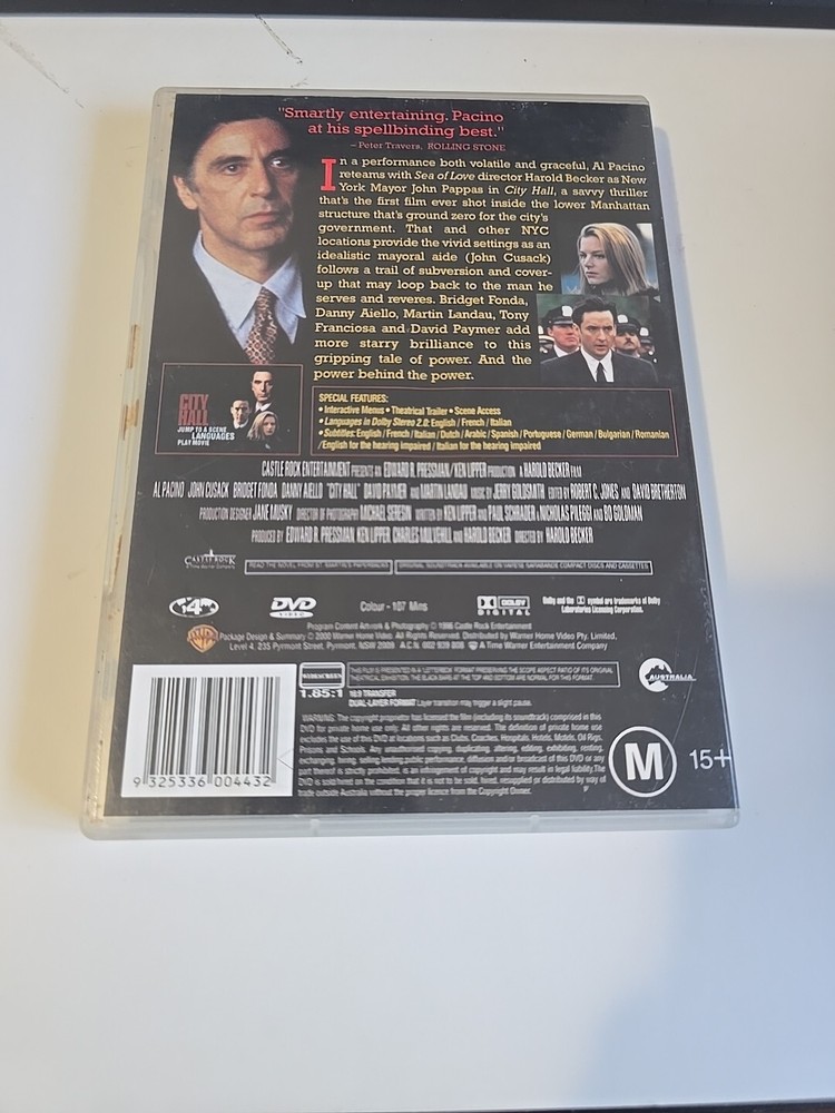 "City Hall (1996) DVD Region 4 featuring acclaimed actors Al Pacino and John Cusack in a gripping drama, crime, and thriller. Directed by Harold Becker, this movie is presented in a 1.85:1 aspect ratio, with a run time of 107 minutes. The DVD includes interactive features, widescreen format, and subtitles for an enhanced viewing experience. A must-have for fans of intense storytelling and powerful performances."