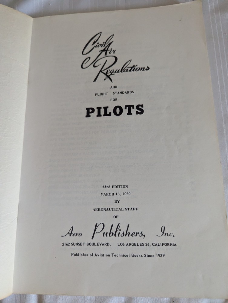 Great vintage soft bound book entitled "Civil Air Regulations and Flight Standards for Pilots" dated 1960 by Aero Publishers. Please see the photos. Looking for art glass, china, sterling silver, aviation collectibles? Check our store, we have more! Please ask questions! We combine shipping costs! Priority Mail and Ground Advantage now includes up to $100 of insurance. Check out my store! You will find clothing, accessories, antiques and aviation collectibles – even some stuff for the kids! Item comes from a smoke free, pet free home. Email me if you have any questions! Thanks for looking! A note about feedback: If you are planning to award less than five stars for any of the categories, please email me and let me know if there is an issue. I do my best to start items at the lowest possible price and provide great service. The rating system is how eBay charges the sellers our fees – so it is very important to us! Also, regarding shipping costs, I have no handling fees. The tracking number for your package inside the USA will be emailed to you. International purchases are handled by eBay. I do not end auction items early – ever!! It is not fair to everyone else, so please do not ask! Returns: Please measure your favorite fitting pieces of clothing in your closet and compare the measurements to the listing. If an item does not fit, it is not eligible for return. I do not refund shipping costs. If I have missed something or have grossly misrepresented an item, please contact me through the eBay email system and I will happily consider your item for a refund. Sign up for my newsletter! You will receive updates on new things in my store!