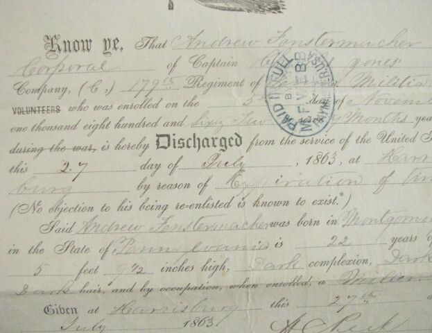 The 179th" Pennsylvania Militia Drafted", a 9 month unit was formed late 1862, one of only 15 such units created by the State o Pennsylvania in response to Lincoln's call for more troops. It was part of General Richard Busteed's Independent Brigade serving in the 4th Army Corps, at Yorktown and the Peninsula Campaign to June 1863, then with the 2nd Corp, took part in General Dix's Peninsula Campaign against Richmond. The 179th also saw action in the Expedition to Bottom's Bridge, Virginia, and fought in a skirmish at Baltimore Cross Roads, Maryland when Hill's Confederate Force advanced against the 179th P Militia. July 2, 1863. During the Gettysburg Campaign the men offered to extend their service, but when Lee left Pennsylvania, they were was discharged on July 27, 1863 at Harrisburg. An Original Civil War Union Army discharge issued for Corporal Andrew Fenstermacher,of Company C, 179th Pa Drafted Militia , of Montgomery County, Pennsylvania at Harrisburg, July 27, 1863 . The Discharge gives his physical description and notes his occupation as "Miller". The handsome Discharge bears a large Federal eagle logo, and bears a blue ink paymaster stamp. The reverse has a printed Oath of Identity, not filled in . This is one of the few items I have seen for a Drafted Militiaman. It is signed by Company C Commander Charles Jones, and by a 14t US Infantry Mustering Officer. 1p 8 x 10" ptd/ink with folds, age stains, edge wear, and one corner clipped, Overall VG Condition and comes w service info. Corporal Fenstermacher, a native of Pottstown, Montgomery Country is buried in Chester County.. Welcome to my Ebay Auctions and Ebay Store. I am a specialist in early American Military & Historical items, especially American Civil War ephemera- letters, military & historic documents including broadsides, commissions, General Orders and other imprints. I have been collecting and selling original American Civil War & US Military memorabilia for 35 years My customers have included some of the leading names in collecting and selling American History items, as well was as a wide range of novice & advanced collectors in addition to some 30 US federal, state, public and private university & municipal museums and libraries. All items are unconditionally guaranteed to be authentic and in the condition as described. I am a longtime member of the Company of Military Historians, the New England Antique Arms Association, the Ephemera Society of America & the Civil War Veterans Historical Assn. I SELL ONLY ORIGINAL ITEMS, AND HAVE BEEN A PROFESSIONAL FULL TIME SELLER OF ANTIQUE HISTORICAL ITEMS SINCE 1980. PLEASE SEE MY EBAY STORE FOR OTHER LISTINGS. PLEASE READ DETAILS OF THE ITEM DESCRIPTION. I TRY TO DESCRIBE ALL ITEMS ACCCURATELY U.S. SHIPPING ONLY I ship only USPS priority mail with insurance