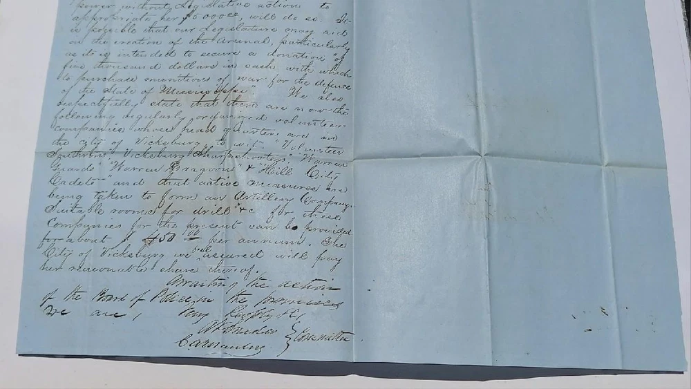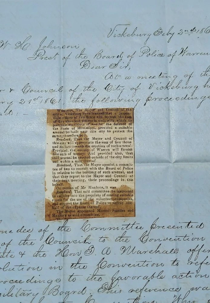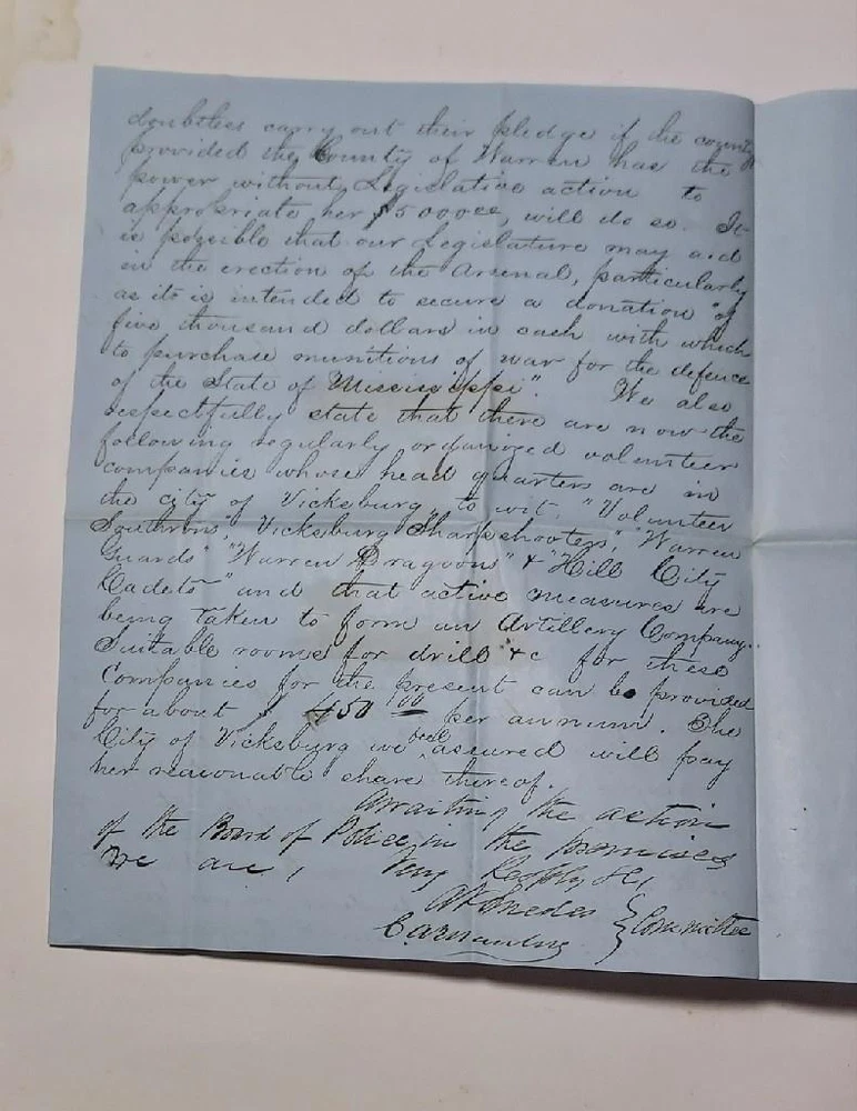 Vicksburg,Mississippi Feburary 2nd 1861 Exceedingly rare document for the city of Vicksburg,Mississippi to create an arsenal.The mayor and counsil will appropriate five thousand dollars towards an erection of such arsenal. The document is addressed to Colonel W.H.Johnson; President of the board of Police. Thomas Bolling Manlove files a motion to have rooms avilable for Volunteers. ( Thomas Bolling Manlove) Before Sharpsburg: Confederate (CSV) Captain Thomas Bolling Manlove (1842 - 1880) Home State: Mississippi Education: Western Military Institute Branch of Service: Infantry Unit: 2nd Mississippi Infantry Battalion In 1860 he lived in Vicksburg, MS, the 17 year old son of corn merchant and City Councilman Christopher Alexander Manlove (1813-1878). In April 1861 he enrolled in the "Jeff Davis Guards" in Vicksburg, and was elected First Lieutenant as they became Company G, 2nd Mississippi Battalion. He was promoted to Captain on 3 June 1861. On the Campaign He was wounded in action at Sharpsburg on 17 September 1862. The rest of the War On 3 November 1862 he was appointed Lieutenant Colonel of the 46th which quickly became the 48th Mississippi Infantry - a regiment formed by adding Companies to the 2nd Battalion. The officers and most of the men of the regiment petitioned President Davis for his promotion to the Colonelcy in January 1863, but it did not happen. He was slightly wounded at Chancellorsville, VA in May 1863 and again, by a gunshot in May 1864, and, for the fourth time, by a gunshot to his left side, and captured, at Hatcher's Run, VA on 6 or 7 February 1865. He was paroled but captured again while in a hospital in Richmond, VA, and paroled for good on 21 April 1865. After the War He was owner of the Vicksburg Times 1866-67, then, briefly, the new Evening Telegraph. He afterward practiced law in Vicksburg, was briefly an editor in Waco, Texas about 1870, and was editor of two newspapers in Jackson, MS. Document size: 7' 1/2 x 8 1/2 inches Civil War Confederate 1861 Document Vote to Create Arsenal in Vicksburg, MS Civil War Confederate 1861 Document Vote to Create Arsenal in Vicksburg, MS Click images to enlarge Description Vicksburg,Mississippi Feburary 2nd 1861 Exceedingly rare document for the city of Vicksburg,Mississippi to create an arsenal.The mayor and counsil will appropriate five thousand dollars towards an erection of such arsenal. The document is addressed to Colonel W.H.Johnson; President of the board of Police. Thomas Bolling Manlove files a motion to have rooms avilable for Volunteers. ( Thomas Bolling Manlove) Before Sharpsburg: Confederate (CSV) Captain Thomas Bolling Manlove (1842 - 1880) Home State: Mississippi Education: Western Military Institute Branch of Service: Infantry Unit: 2nd Mississippi Infantry Battalion In 1860 he lived in Vicksburg, MS, the 17 year old son of corn merchant and City Councilman Christopher Alexander Manlove (1813-1878). In April 1861 he enrolled in the "Jeff Davis Guards" in Vicksburg, and was elected First Lieutenant as they became Company G, 2nd Mississippi Battalion. He was promoted to Captain on 3 June 1861. On the Campaign He was wounded in action at Sharpsburg on 17 September 1862. The rest of the War On 3 November 1862 he was appointed Lieutenant Colonel of the 46th which quickly became the 48th Mississippi Infantry - a regiment formed by adding Companies to the 2nd Battalion. The officers and most of the men of the regiment petitioned President Davis for his promotion to the Colonelcy in January 1863, but it did not happen. He was slightly wounded at Chancellorsville, VA in May 1863 and again, by a gunshot in May 1864, and, for the fourth time, by a gunshot to his left side, and captured, at Hatcher's Run, VA on 6 or 7 February 1865. He was paroled but captured again while in a hospital in Richmond, VA, and paroled for good on 21 April 1865. After the War He was owner of the Vicksburg Times 1866-67, then, briefly, the new Evening Telegraph . He afterward practiced law in Vicksburg, was briefly an editor in Waco, Texas about 1870, and was editor of two newspapers in Jackson, MS. Document size: 7' 1/2 x 8 1/2 inches Images sell! Get Supersized Images & Free Image Hosting Create your brand with Auctiva's Customizable Templates. Attention Sellers - Get Templates Image Hosting, Scheduling at Auctiva.com. Track Page Views With Auctiva's Counter