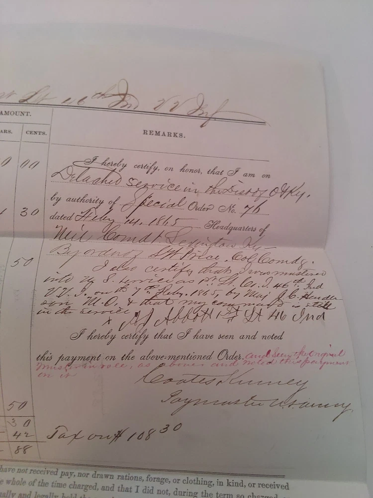 Civil War Pay Voucher 1865 - 1st Lt A J Abbott 46th Indiana Vol Infantry
