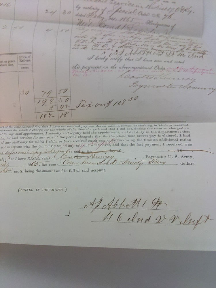 CIVIL WAR PAY VOUCHER April 14, 1865 A J Abbott 1st Lieutenant 46th Indiana Vol Infantry Dimensions: 11 inches x 17 inches ked 2024-12-02