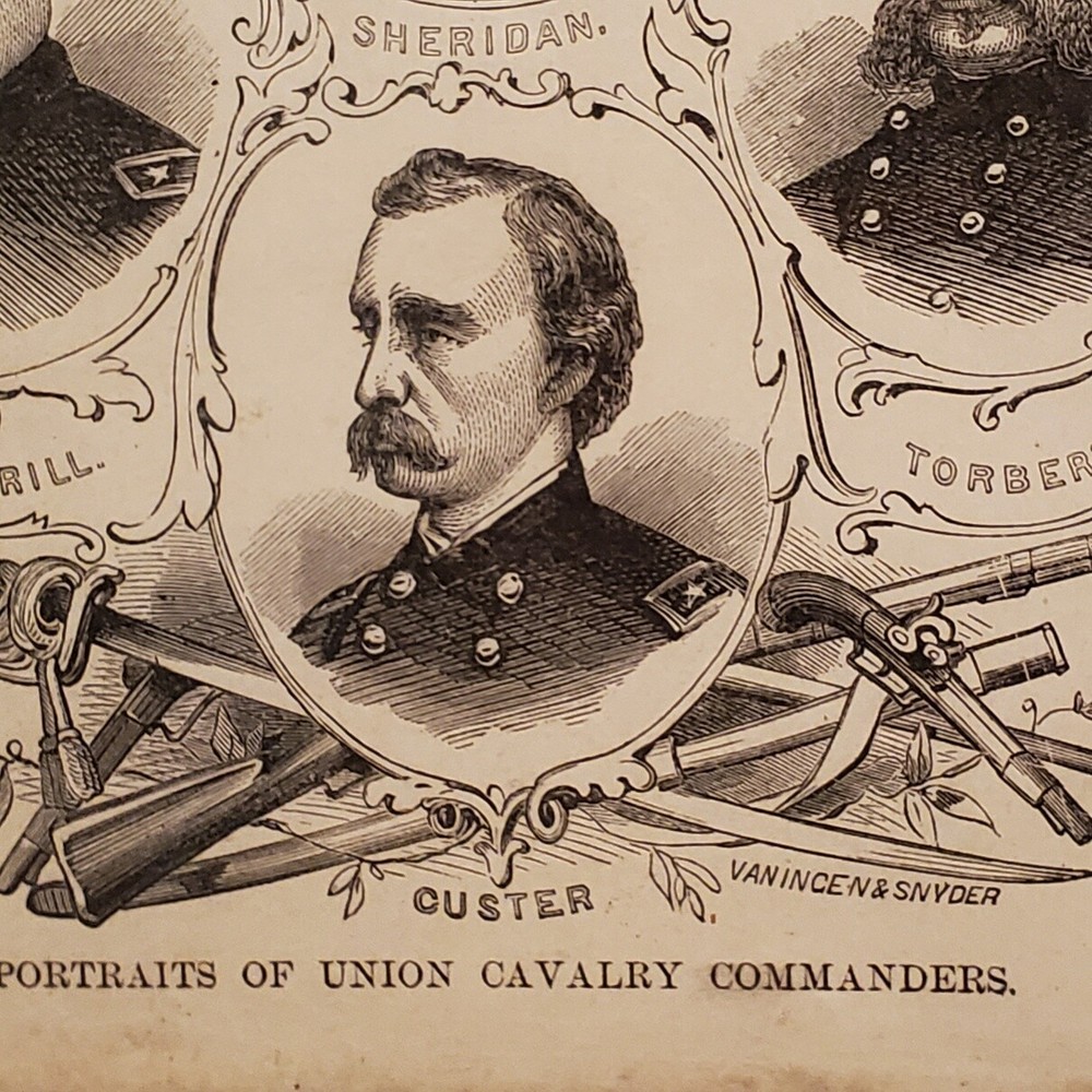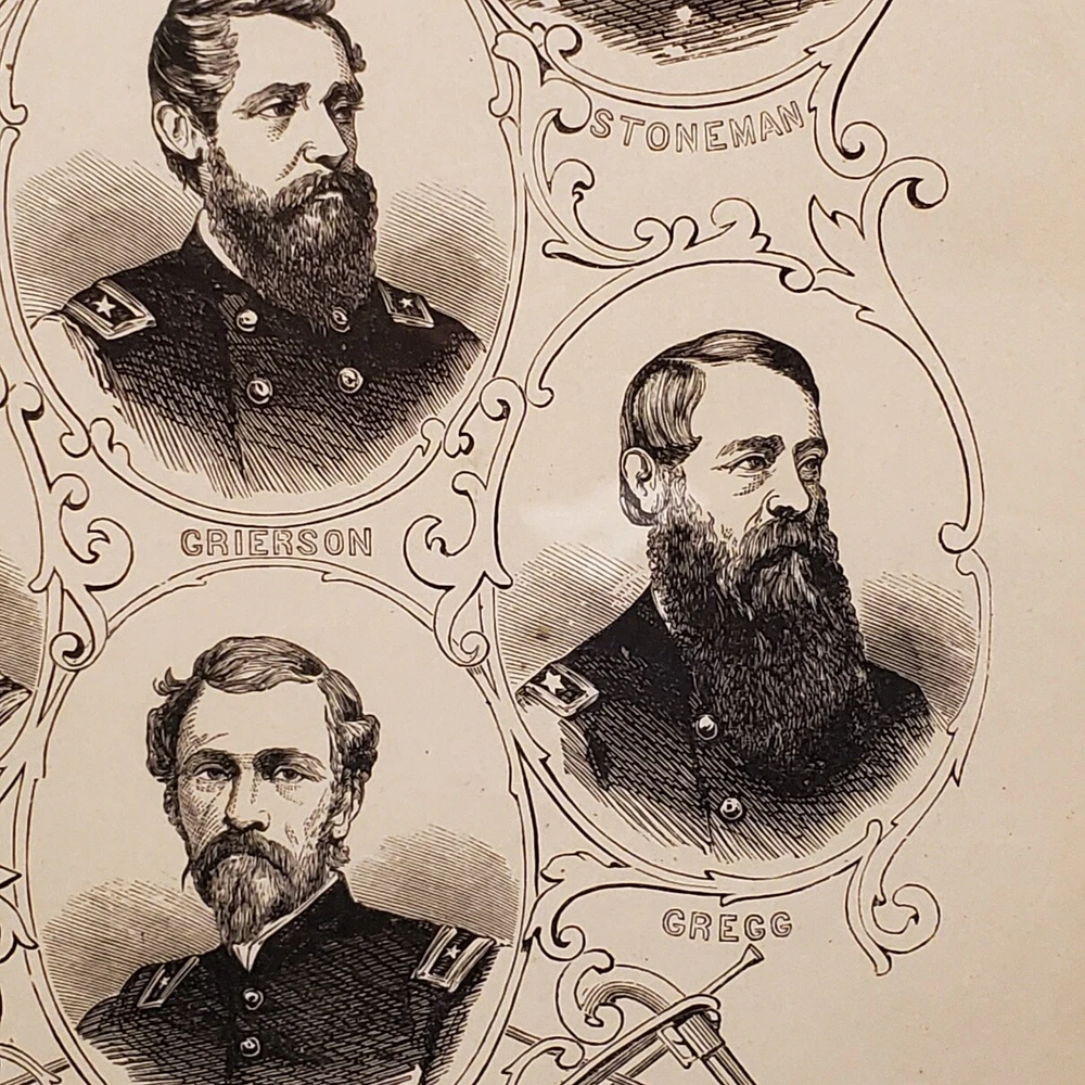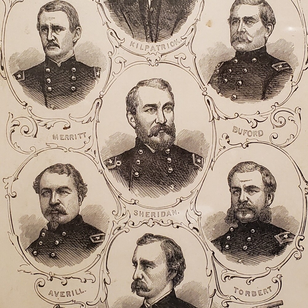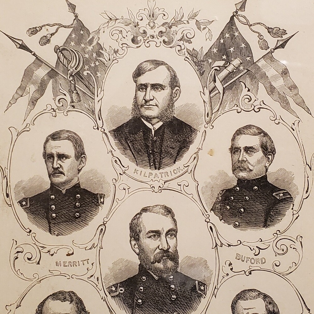 1057----1880s Civil War framed Union Cavalry Commanders includes Custer 1057----1880s Civil War framed Union Cavalry Commanders includes Custer Very old framed Union Cavalry Commanders of the Civil War. This took us several hours to determine where these images were first printed. We are 99% sure they were included in the 1881 book entitled "Pictorial History of the Great Civil War" by John Laird Wilson. They are original and we are estimating they were most likely framed between 1890-1910. This item seems a little scarce to us, for the simple reason the Cavalry has never received the attention from historians that the infantry has. The wood frame is in good condition despite it's age. The cardboard is slightly loose with a few of the original nails still intact. We would not recommend hanging it as-is. The glass is in EX condition without cracks or chips. We have cleaned the front with glass wipes. We were able to take a little peek under the backing and noticed some very old tattered discolored paper. The frame measures 15 x 10. Listing and template services provided by inkFrog