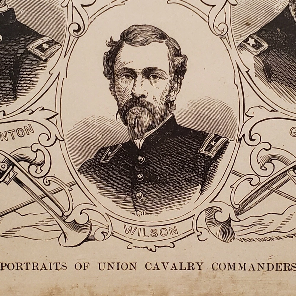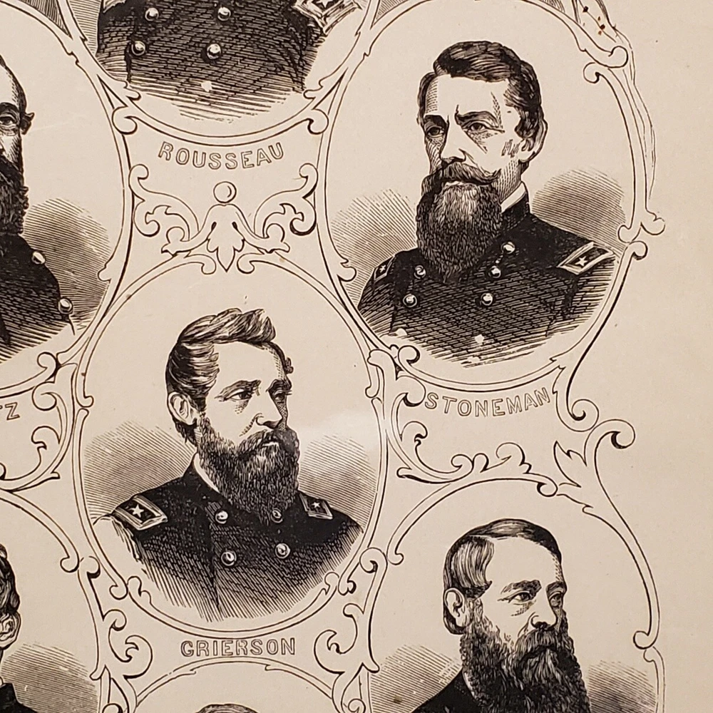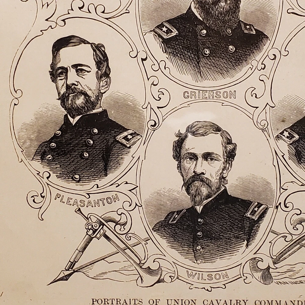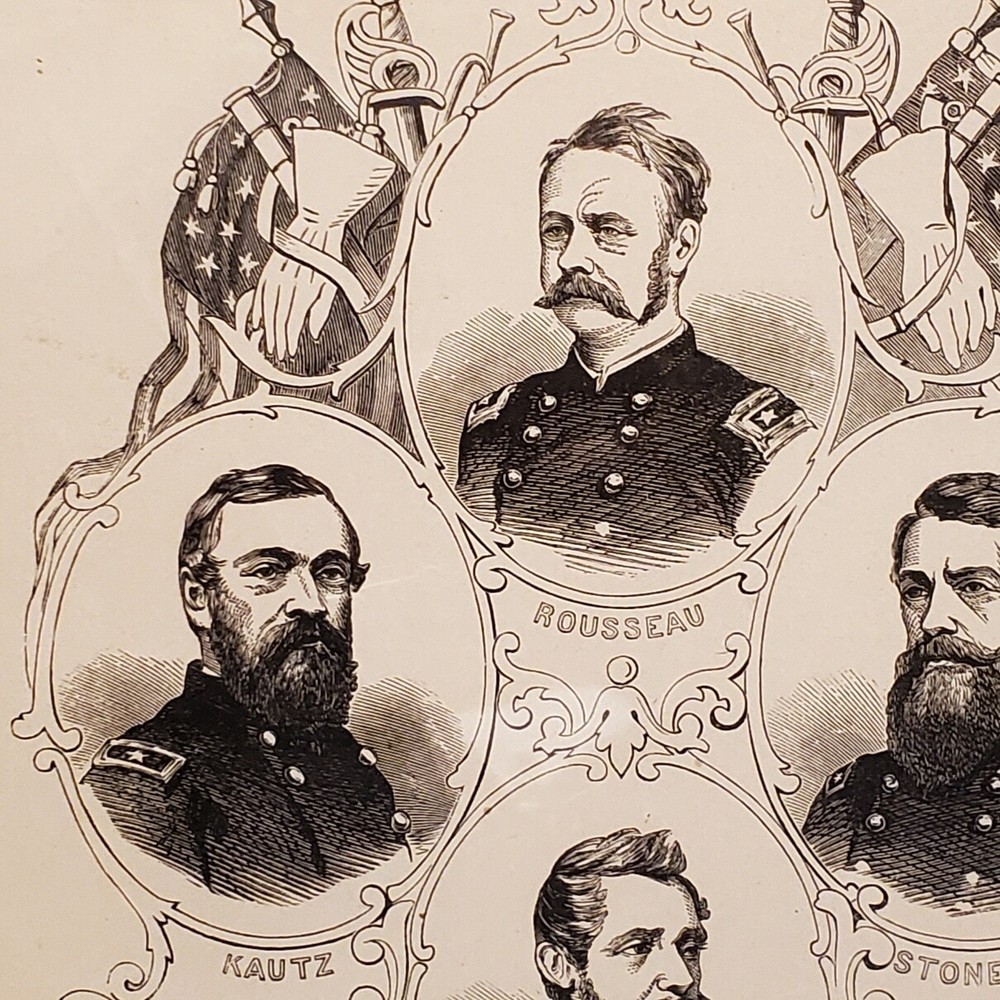 1057----1880s Civil War framed Union Cavalry Commanders includes Custer 1057----1880s Civil War framed Union Cavalry Commanders includes Custer Very old framed Union Cavalry Commanders of the Civil War. This took us several hours to determine where these images were first printed. We are 99% sure they were included in the 1881 book entitled "Pictorial History of the Great Civil War" by John Laird Wilson. They are original and we are estimating they were most likely framed between 1890-1910. This item seems a little scarce to us, for the simple reason the Cavalry has never received the attention from historians that the infantry has. The wood frame is in good condition despite it's age. The cardboard is slightly loose with a few of the original nails still intact. We would not recommend hanging it as-is. The glass is in EX condition without cracks or chips. We have cleaned the front with glass wipes. We were able to take a little peek under the backing and noticed some very old tattered discolored paper. The frame measures 15 x 10. Listing and template services provided by inkFrog