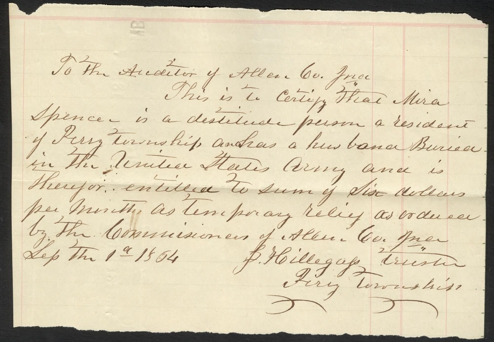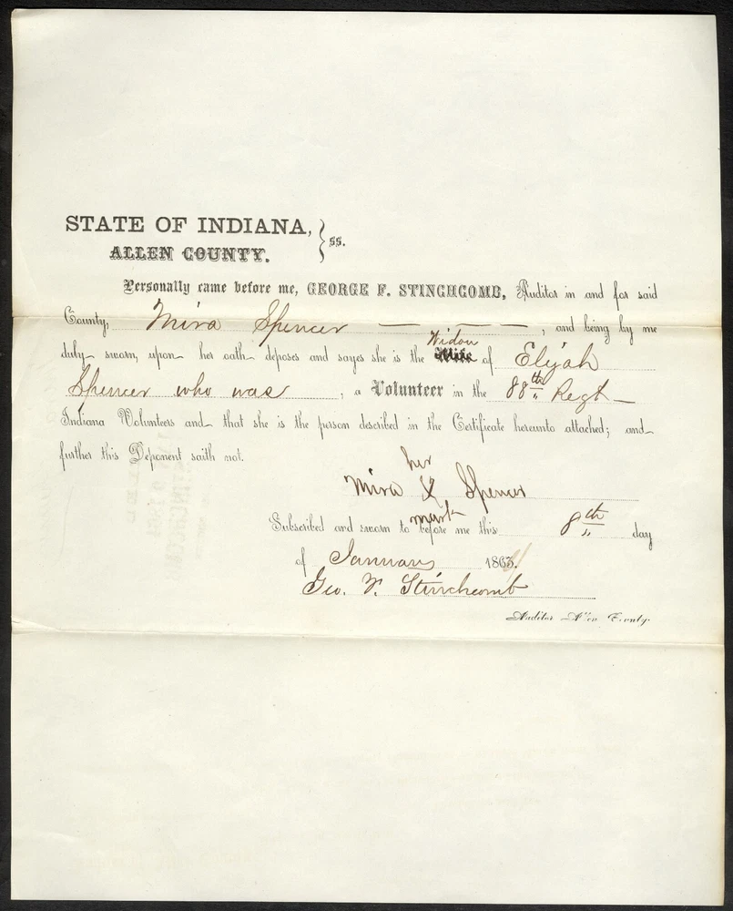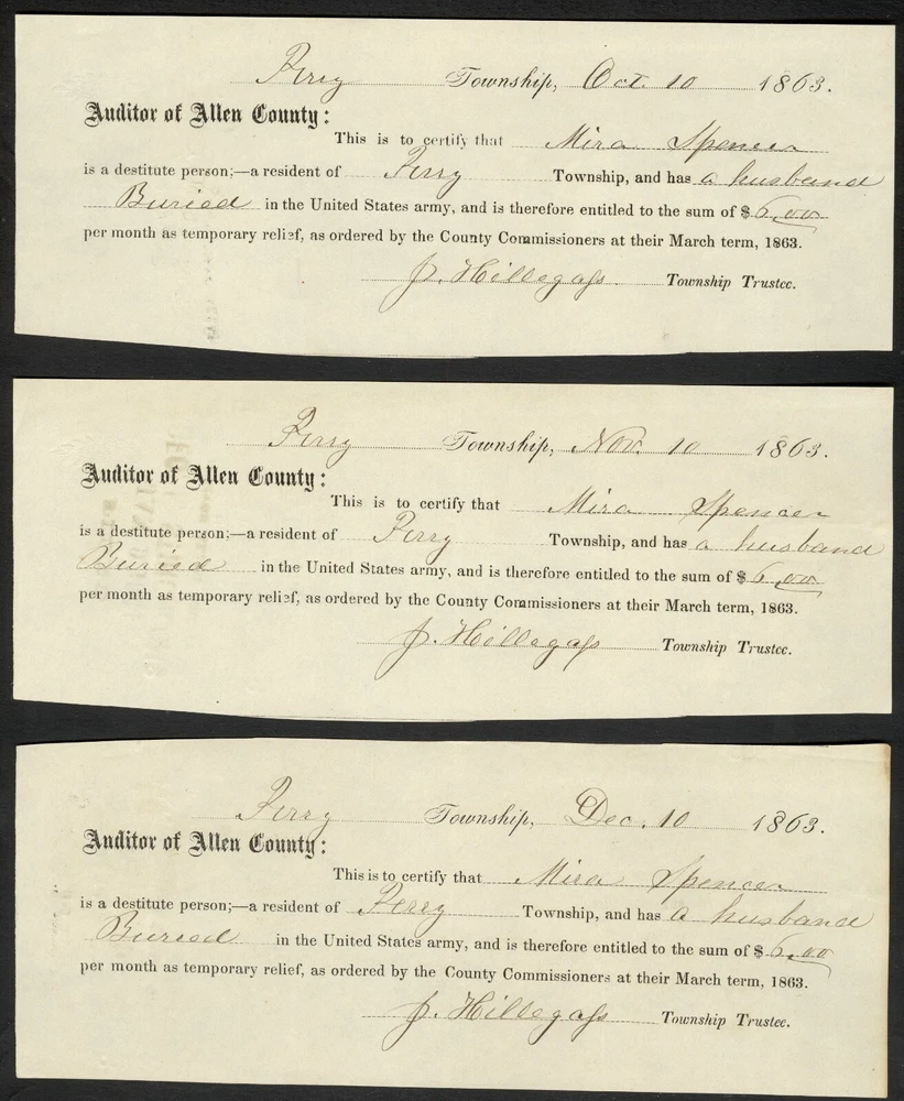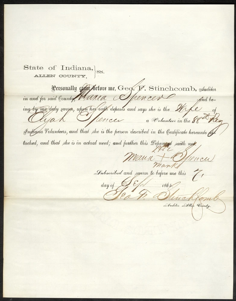 Civil War Widow’s 6 Piece Document Group - Perry, Allen County, Indiana Offered for your consideration is a small group of documents relating to county payments for a woman whose husband died in the service. Five of these documents are partly-printed, while one is fully manuscript. The earliest dated pieces are three small receipts, each issued by “ Perry Township ” on the 10 th day of “ Oct. ”, “ Nov. ”, “ Dec. ”, in “ 1863 ”. These documents are addressed to the “ Auditor of Allen County ” and states that “ This is to certify that Mira Spencer is a destitute person; - a resident of Perry Township, and has a husband Buried in the United States army, and is therefore entitled to the sum of $ 6.00 per month as temporary relief, as ordered by the County Commissioners at their March term, 1863. ”. These are signed at the conclusion by “ J. Hillegass ” in his capacity as “ Township Trustee. ”. A black stamp, applied to each, indicates that these pieces were “ FILED / JAN 9 1864 / GEO. F. STINCHCOMB / AUDITOR ALLEN COUNTY ”. The other two partly printed forms are generally the same in content, though their printing is slightly different. They are both addressed to the “ STATE OF INDIANA, / ALLEN COUNTY .” and state that “ Personally came before me, GEORGE F. STINCHCOMB, Auditor in and for said County, Mira Spencer , and being by me duly sworn, upon her oath deposes and says she is the Widow of Elijah Spencer who was , a Volunteer in the 88 th Regt. Indiana Volunteers and that she is the person described in the Certificate hereunto attached; and further this Deponent saith not. ”. This is followed by Mrs. Spencer’s signature, presented as “ her X mark ”, as well as the statement that the document was “ Subscribed and sworn to before me this 8 th day of January 186 4 ” (the other document is dated “ 7 day of Sept 1864 ”), with the signature of “ Geo. F. Stinchcomb ” as “ Auditor Allen County ” at the conclusion (the signatures on the documents are quite different, however). Each of the documents bears Spencer’s name on the back, as well as a filing stamp similar to those on the earlier documents (though with different dates). The final document is a manuscript note addressed “ To the Auditor of Allen County Ind ” which states that “ This is to certify that Mira Spencer is a destitude person a resident of Perry Township and has a husband Buried in the United States Army and is therefor entitled to sum of Six dollars per month as temporary relief as ordered by the Commissioners of Allen Co. Ind. ”. It is dated “ Sep the 1 st 1864 ” and is signed by “ J. Hillegass ” in his capacity as “ trustee / Perry Township ” (it appears that the document was actually penned by Hillegass). This piece also bears a black filing stamp on the back. This grouping illustrates one of the more poignant aspects of the war – the women who were left behind to fend for themselves and their families, while their husbands were away at the front. Sadly, many of these men never returned, forcing their families to depend on the generosity of others, including local government agencies. Sometimes that was enough, most of the time it was not. An interesting group of documents. Worthy of further research. Each of the presently offered documents exhibits signs of expected period use, followed by years of less than ideal storage. Toning is noted on all of the pieces, generally darker at the edges and along the storage folds. The smaller pieces display folds at the corners, while the larger items have two storage folds near the center. Some of these folds have affected the integrity of the paper, with minor separations noted at the edges (these could be strengthened with archival tape if desired). The edges on the smaller items are irregular, especially the manuscript piece (the top and bottom are ragged, with small pieces being missing, as well), while those of the bigger pieces appear straight as made. The contrast is average for the period, though some of the printed material is light and difficult to read. The smaller items measure approximately 3 x 7⅝ inches, the manuscript piece measures approximately 4¾ x 7 inches, while the largest pieces are approximately 8 x 9⅞ inches. An interesting group to display with related home-front material, or as a research project for the local historian. A $5.95 charge will be added to the winning bid for postage and insurance. A $5.00 charge will be added to any item picked up in person at our physical location. If you have any questions regarding this item, please ask before bidding. Buy or Bid with Confidence – American Coins & Collectibles President Richie Self has worked 6 years as a paper money grader/authenticator. He has contributed to numerous reference books within the industry, as well as being a co-author of “The Comprehensive Catalog and History of Confederate Bonds, 2 nd Edition” with Douglas B. Ball, Ph.D., Henry F. Simmons, M.D., Ph.D. and James R. Desabaye. Mr. Self is a life member of the American Numismatic Association, the Society of Paper Money Collectors, as well as numerous regional numismatic associations. He is an authorized submitter to NGC, PCGS, and PMG, a diamond founding member of Coin Dealers Helping Coin Dealers and a supporter of the Industry Council for Tangible Assets. American Coins and Collectibles can be found at many of the state and local coin shows. American Coins and Collectibles Shreveport, LA