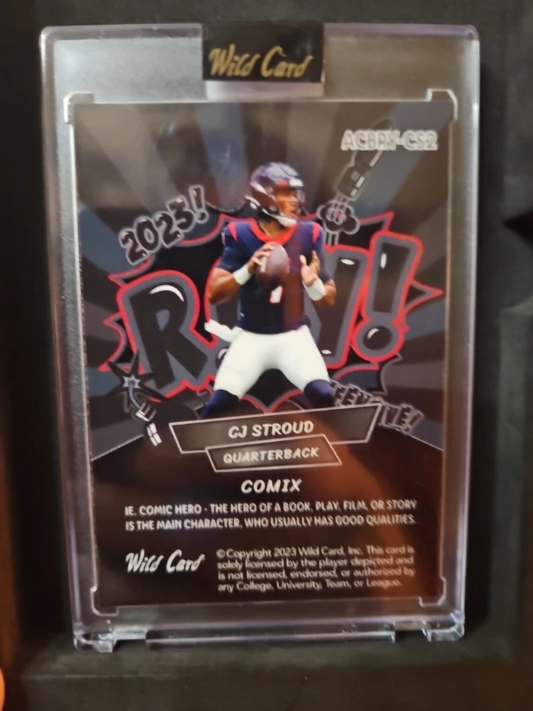 The product is a 2023 Wild Card Alumination Comix trading card featuring rookie C.J. Stroud of the Houston Texans. The card number is ACBRY-CS2 and it is from the 2023 season. This ungraded card is in near mint or better condition and is part of a set specifically focused on the Wild Card series. With a limited edition of 16 out of 18, this card captures C.J. Stroud's early career in the National Football League (NFL) without an autograph.
