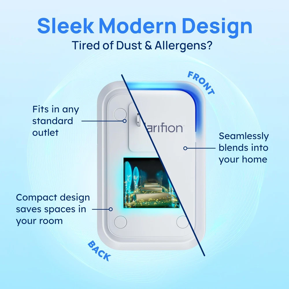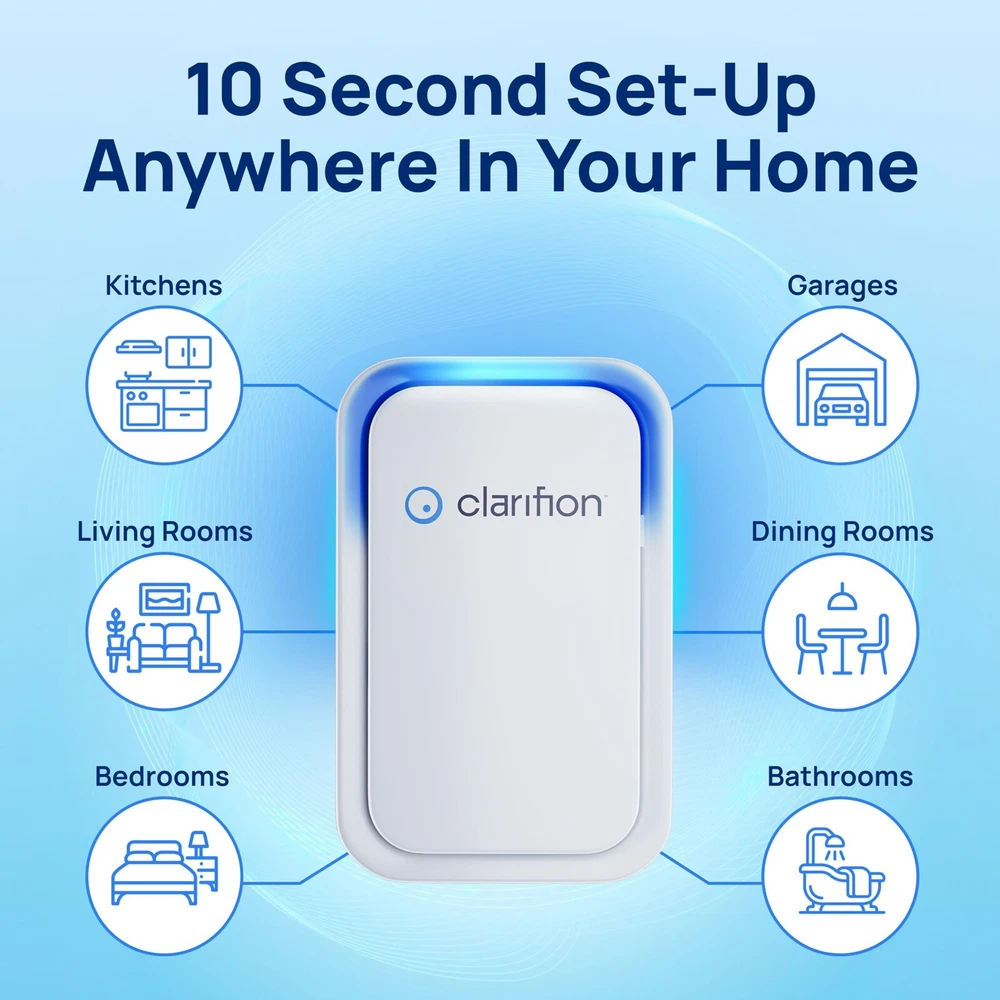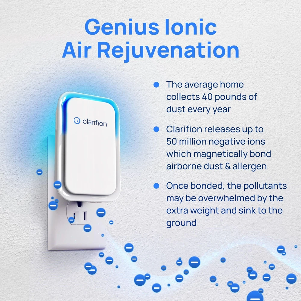 Best Air Ionizer For Home: Simply plug a Clarifion into any standard outlet and replace bulky, expensive air purifiers with a simple, filterless, plug-in device. Perfect For Every Room: We recommend using at least one per bedroom, bathroom, dining room, living room, and kitchen to ensure best results. No Air Filter Required: Clarifion uses negative ion technology, which means you won’t have to spend time and money on replacement air filters. May Help With Allergens: Negative ions attach to floating allergens like dust, dander, pollen, and more. Use Clarifion air ionizer and freshener for pets and pet dander. Compact & Portable: Clarifion is small, lightweight, and compact, making it the perfect small air cleaner. Take it with you on the go and simply plug it into any standard outlet.