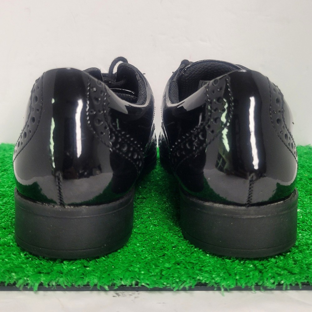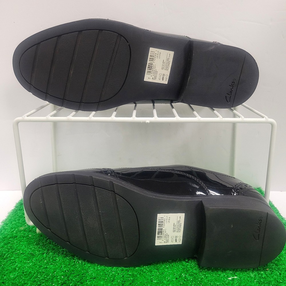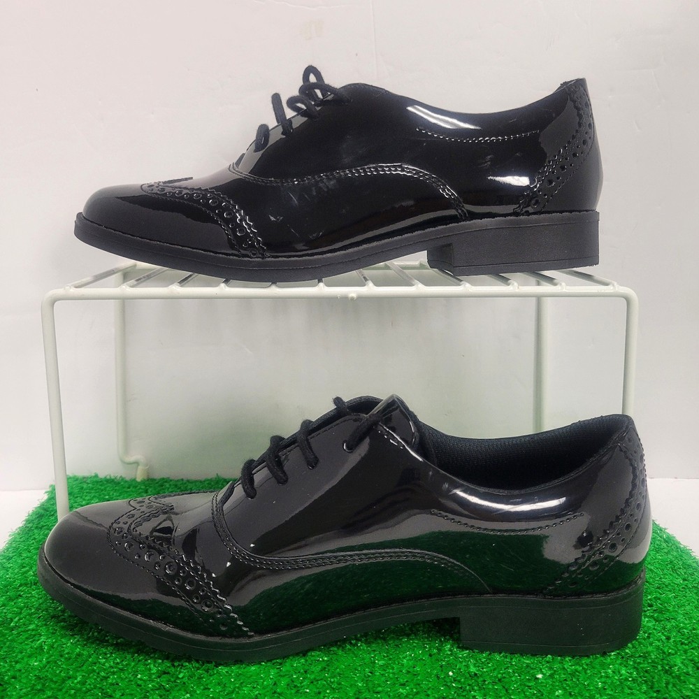 The Clarks Aubrie Tap Y Black Patent Leather School Shoe in size 6M is a stylish and versatile Oxford dress shoe for kids. With an almond toe shape and lace-up closure, it is perfect for various occasions such as travel, activewear, parties, weddings, casual outings, formal events, workwear, and business meetings. Made of cushioned and comfortable leather with a rubber outsole, this shoe is suitable for all seasons and features a block heel style. The black color and classic Oxford style make it a timeless choice for any young wearer looking for both style and performance in their footwear.