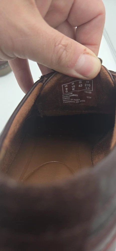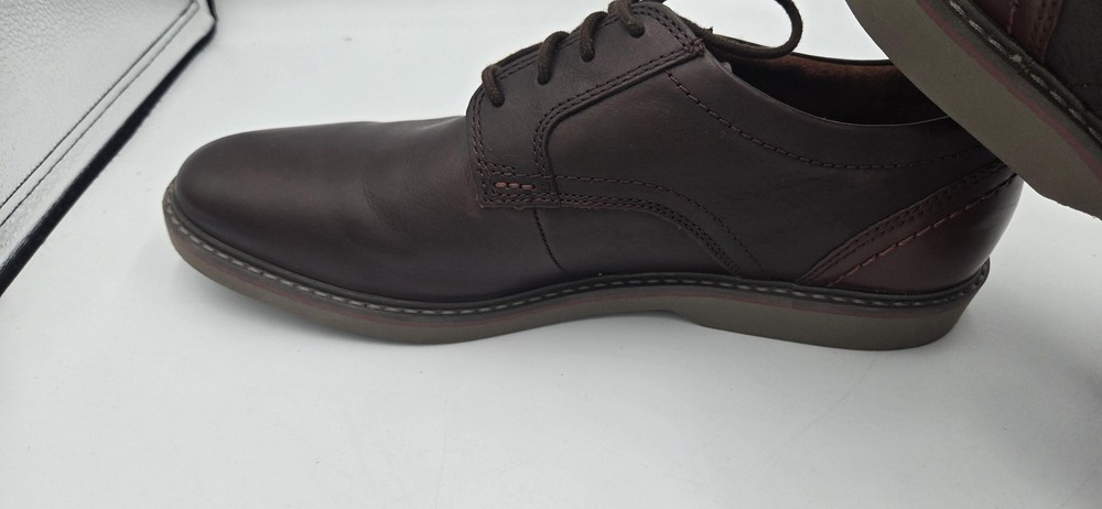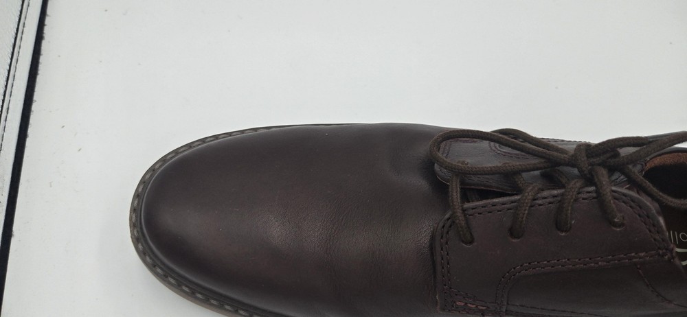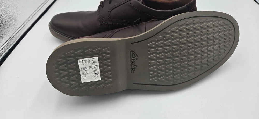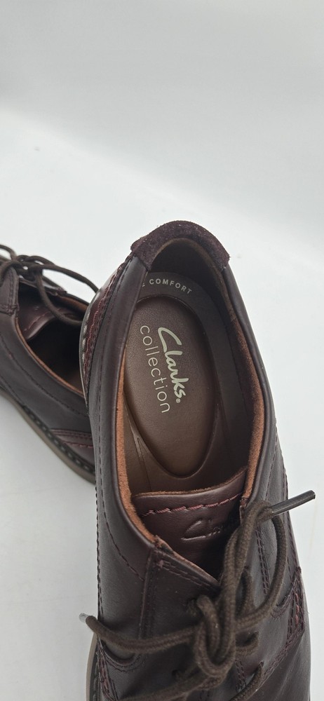 Brand: Clarks Collection Style: Mens leather lace-up oxford casual comfort shoes. Color: Brown with darker brown and maroon heel and stitching accents. Size on tag: US 10 M, UK 9 G, EU 43, CN 270. Materials (per labels): Leather upper; balance man-made materials with synthetic outsole. Made in India. Features: Round toe, lace-up closure, cushioned comfort insole, low-profile midsole, textured rubber outsole for traction, contrast stitching and padded collar. EAN: 5063790773945