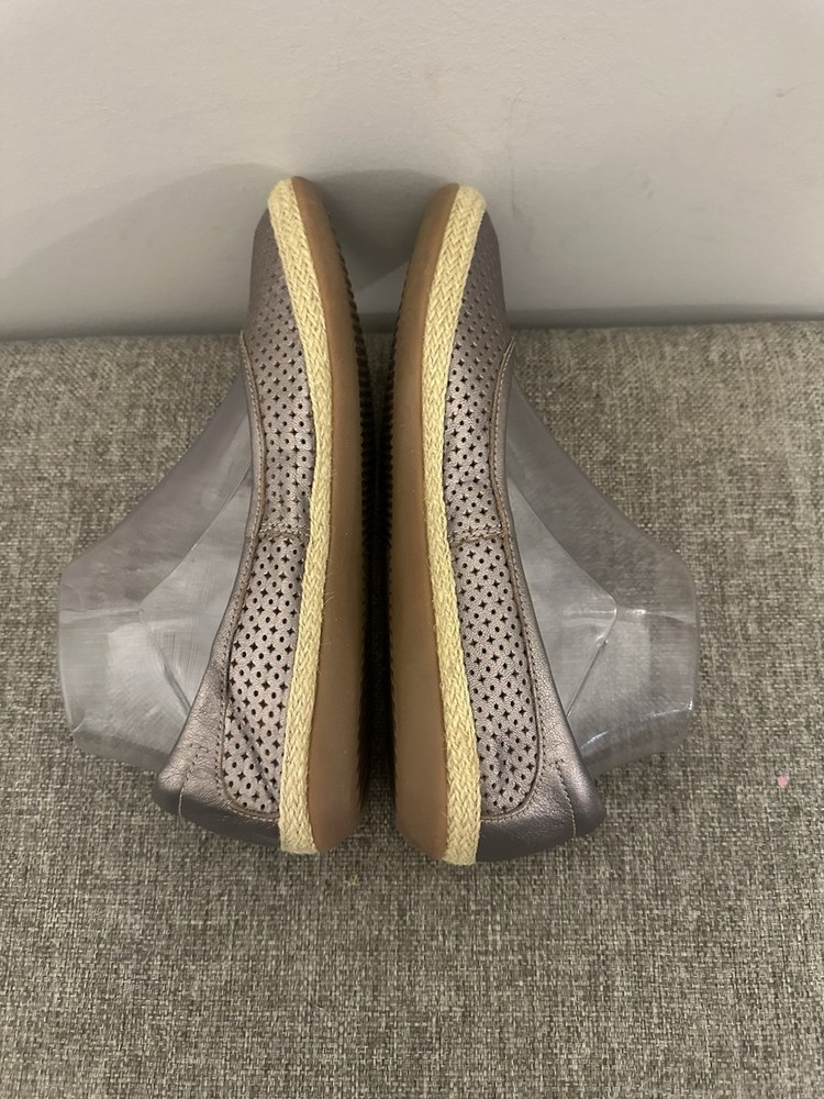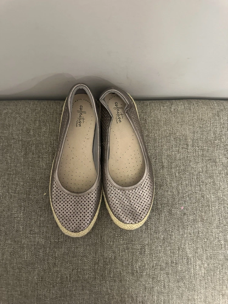 The Clarks Collection Silver Leather Slip On Espadrille Flats in size 8 are stylish and comfortable flats perfect for women on the go. With a slip-on design and cushioned insole, these shoes are easy to wear and provide all-day comfort. The metallic silver color adds a touch of sophistication to any outfit, making them suitable for travel, casual outings, or business meetings. Made with high-quality leather and featuring a rubber outsole, these flats are durable and fashionable, ideal for any woman's wardrobe. Preowned Good Condition