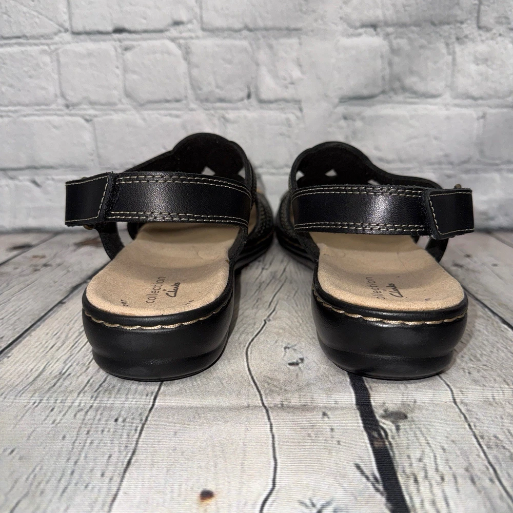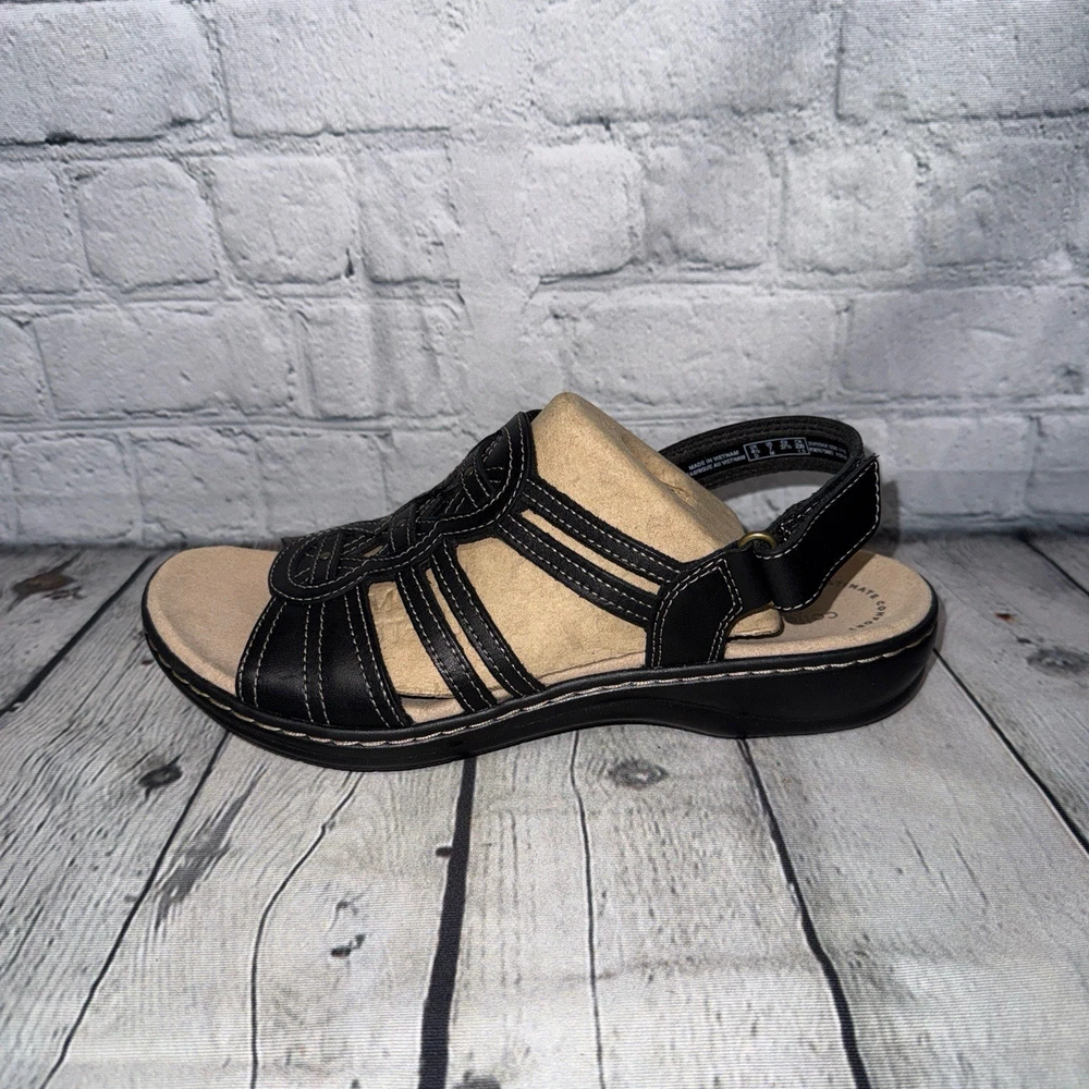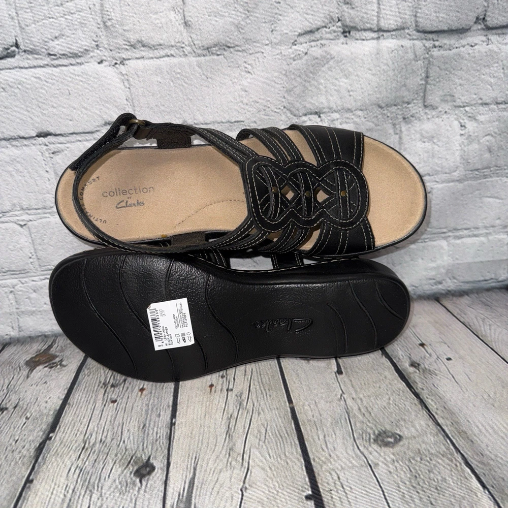 NWT! Collection by Clark’s size 7 Leisa Janna sandals in black. Genuine leather upper. Open round toe. Cushioned insole & lightweight flexible rubber outsole. Adjustable velcro ankle strap. 1.5” wedge heel. Price tag: $105.00