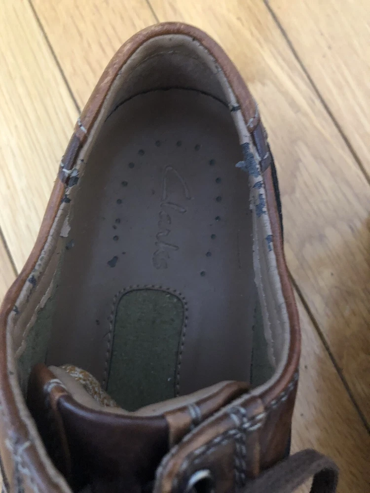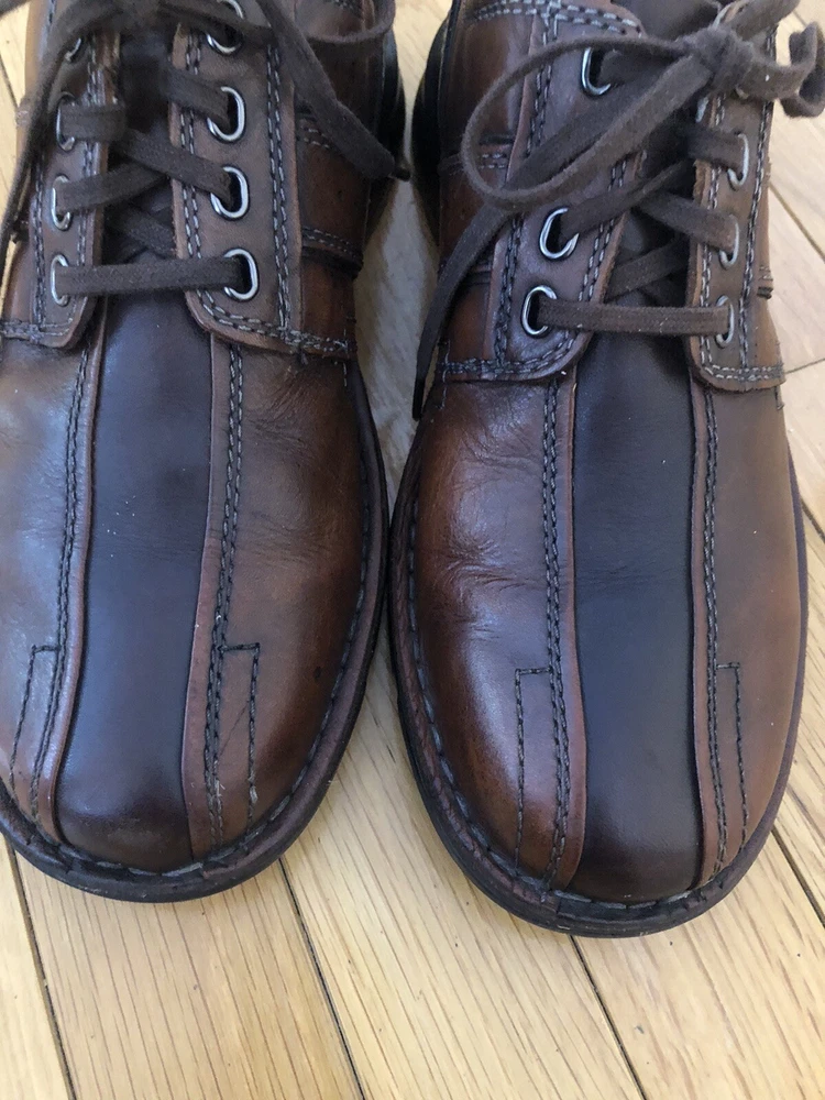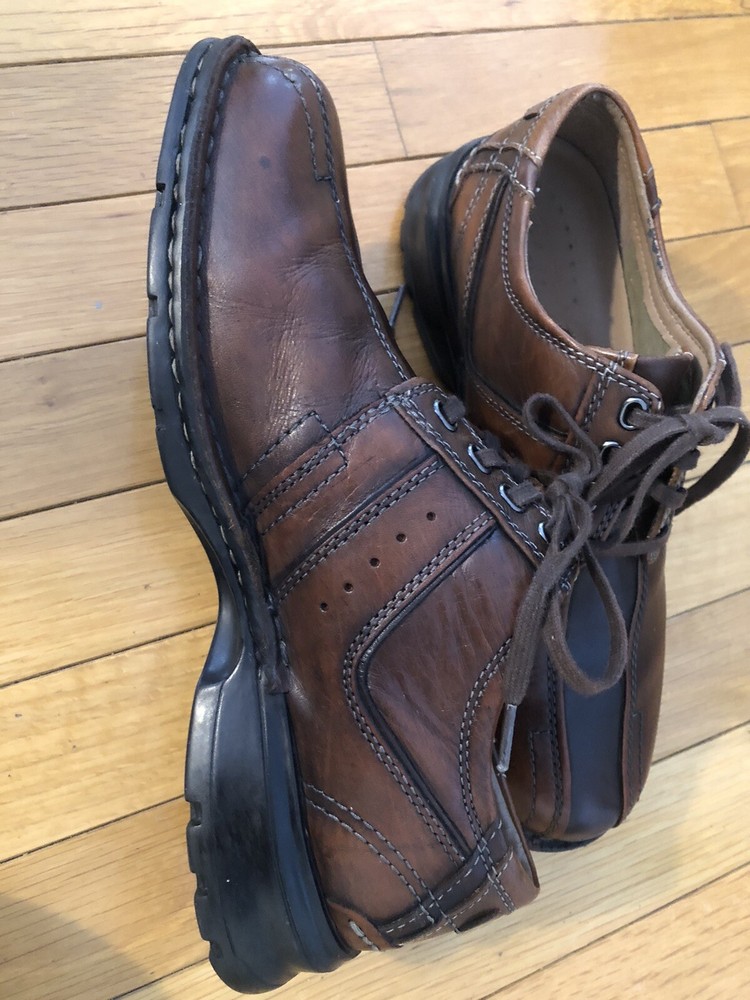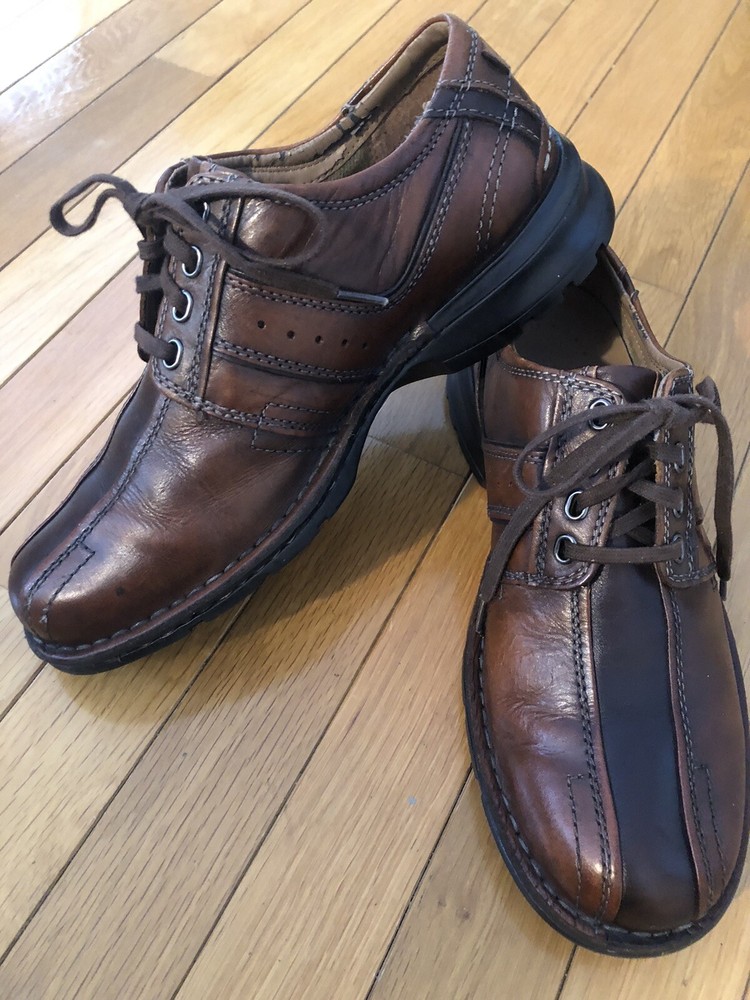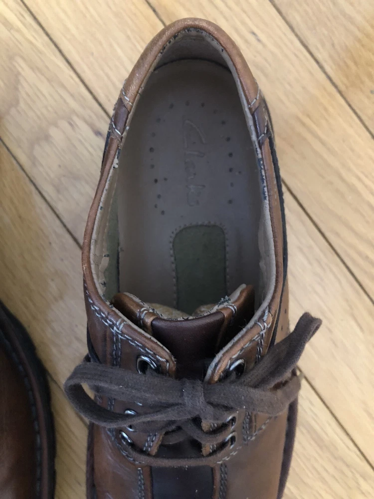 Clarks Men's Touareg Brown Two Toned Leather Lace Up Oxford 70852 Size 7.5 Gently worn shoes with some normal wear of leather on inside along eyelets and heel of right shoe. Please view photos. Comfortable, everyday shoes! Please feel free to contact me with any questions. Thank you for your interest.