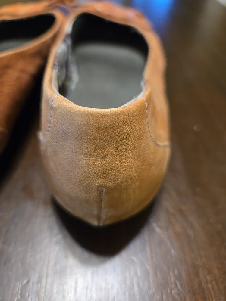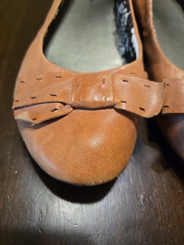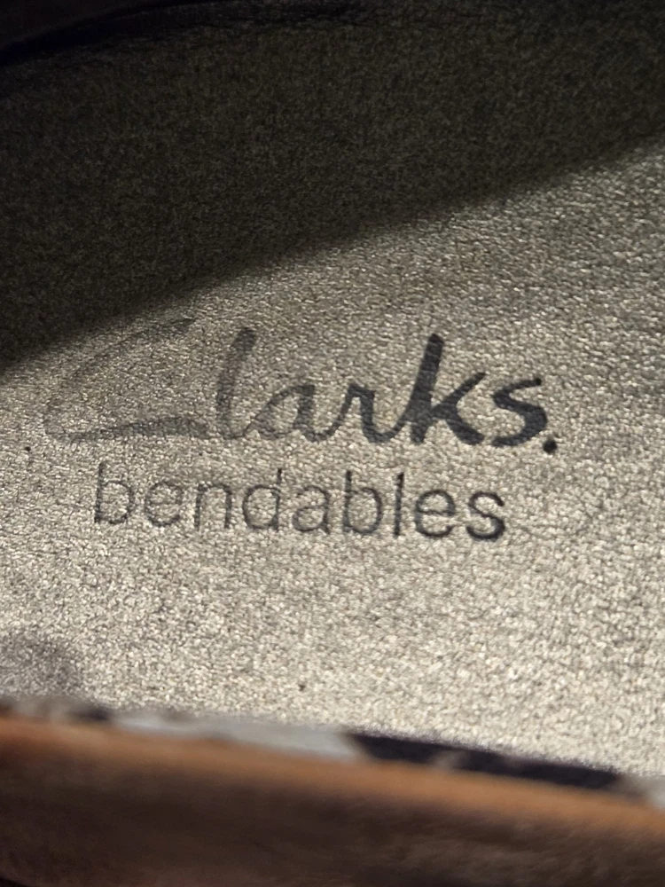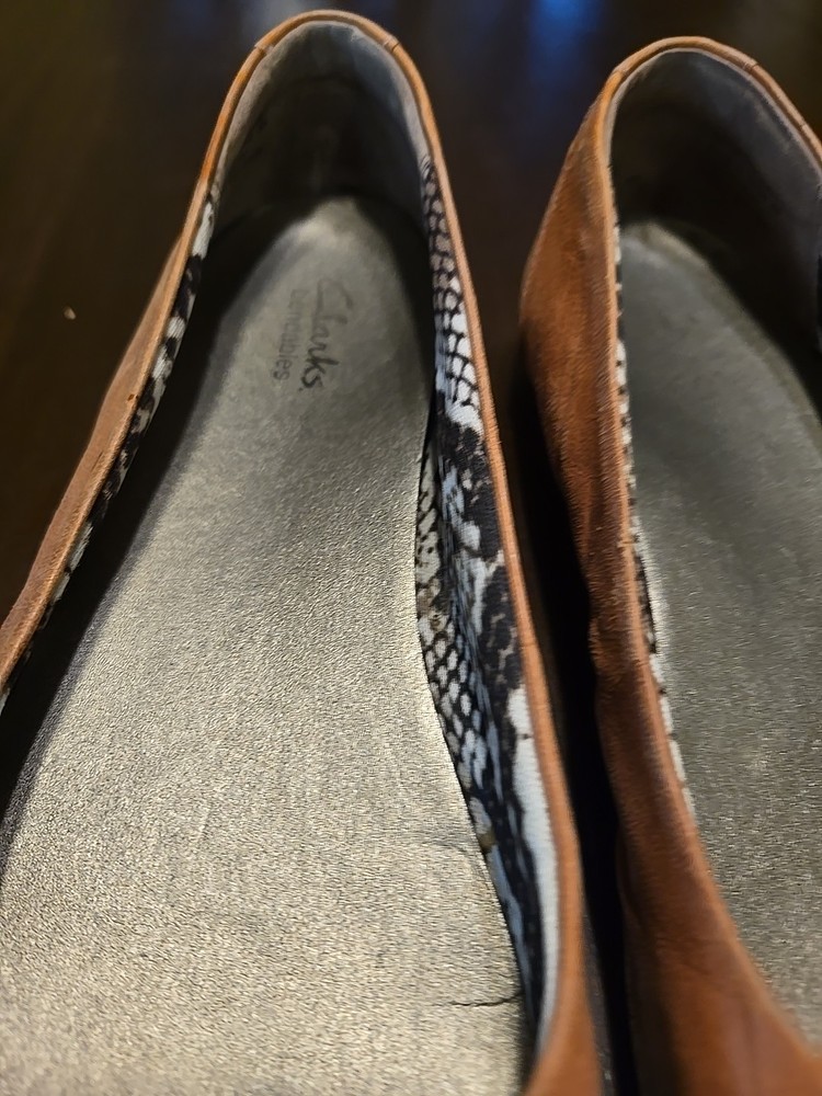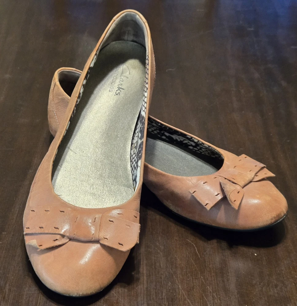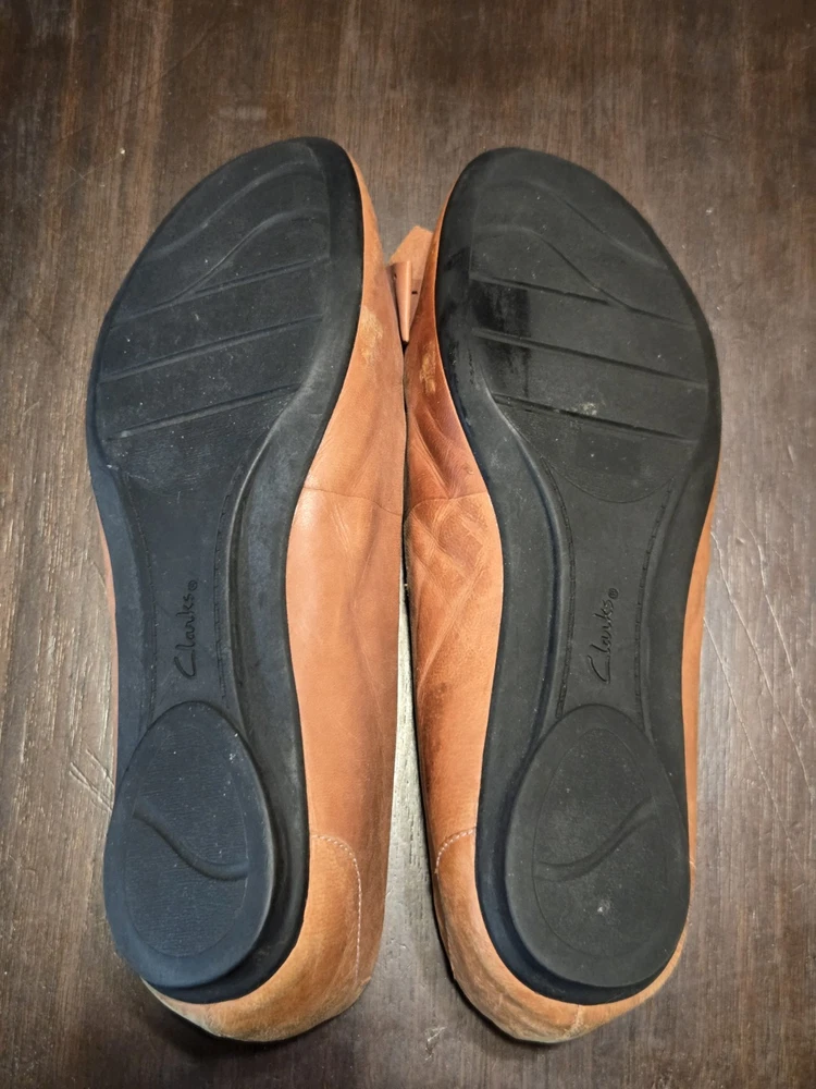 Clarks tannish brown Flat leather upper Slip ons Made for comfort Well loved A few scuffs but not very noticeable