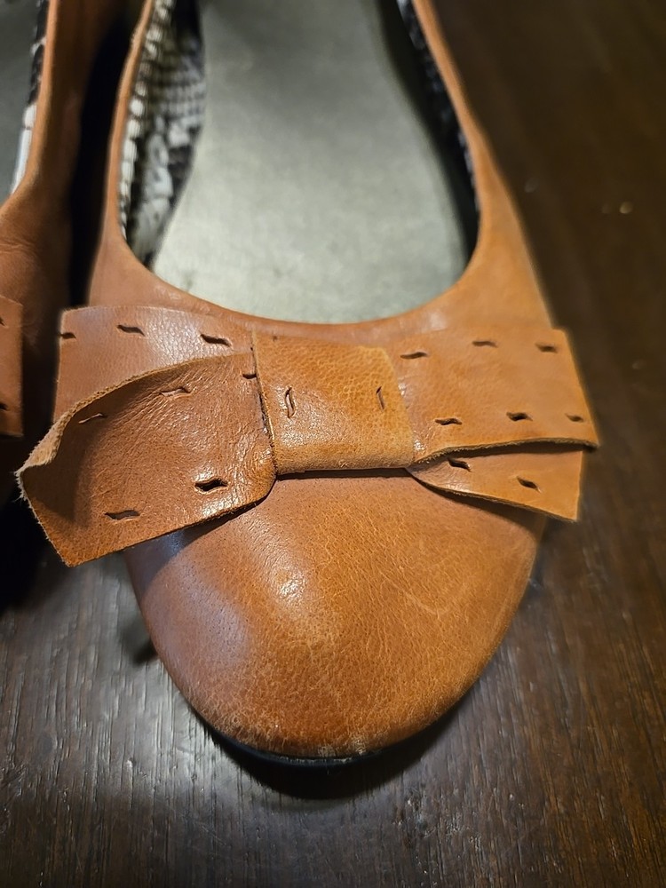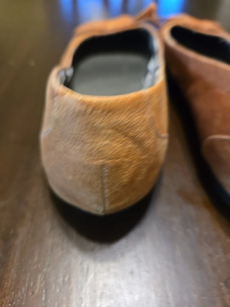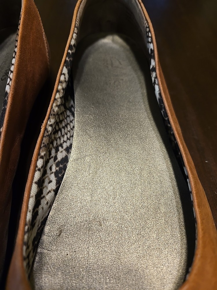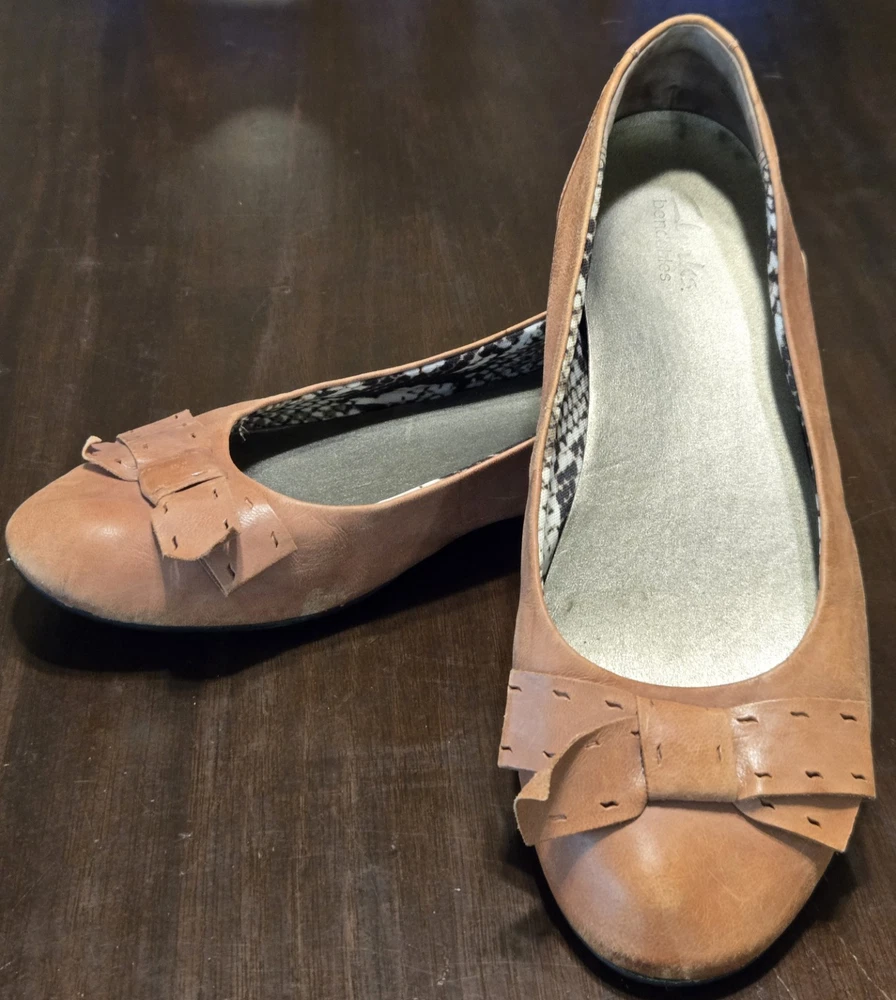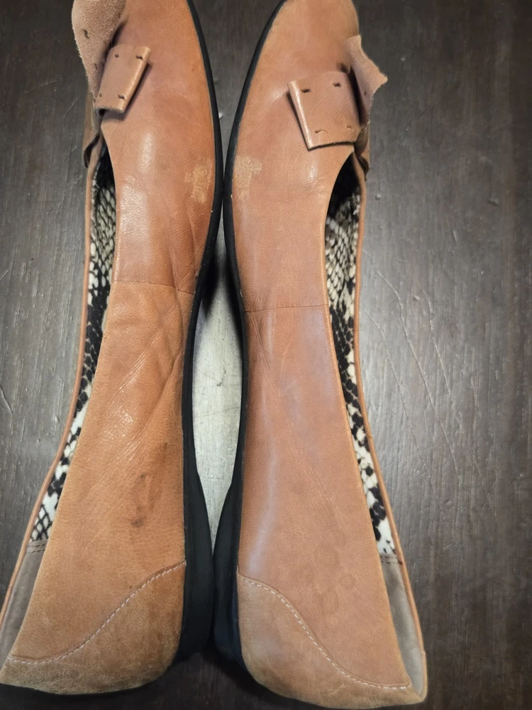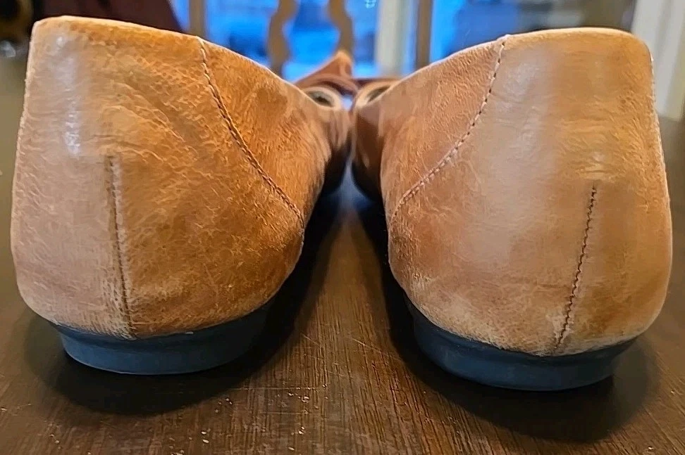 Clarks tannish brown Flat leather upper Slip ons Made for comfort Well loved A few scuffs but not very noticeable