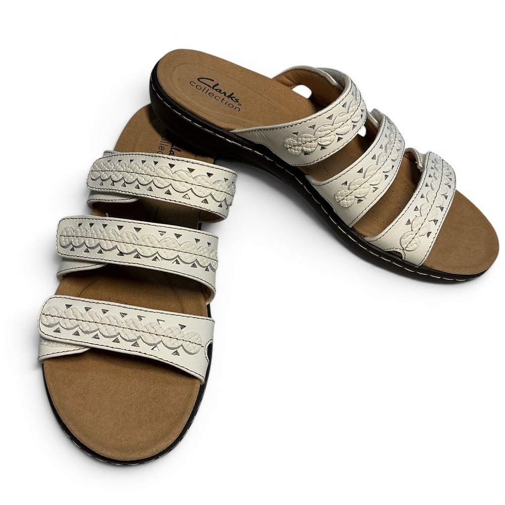 US Shoe Size: 8 Season: Spring, Summer Features: Straps Type: Sandal Upper Material: Leather Shoe Width: M Color: White Pattern: Solid Heel Style: Flat Heel Height: Low (1-1.9 in) Country of Origin: China Department: Women Style: Strappy Outsole Material: Leather Insole Material: Synthetic EU Shoe Size: 39 Closure: Slip On Occasion: Casual, Travel, Party/Cocktail Brand: Clarks UK Shoe Size: 5.5