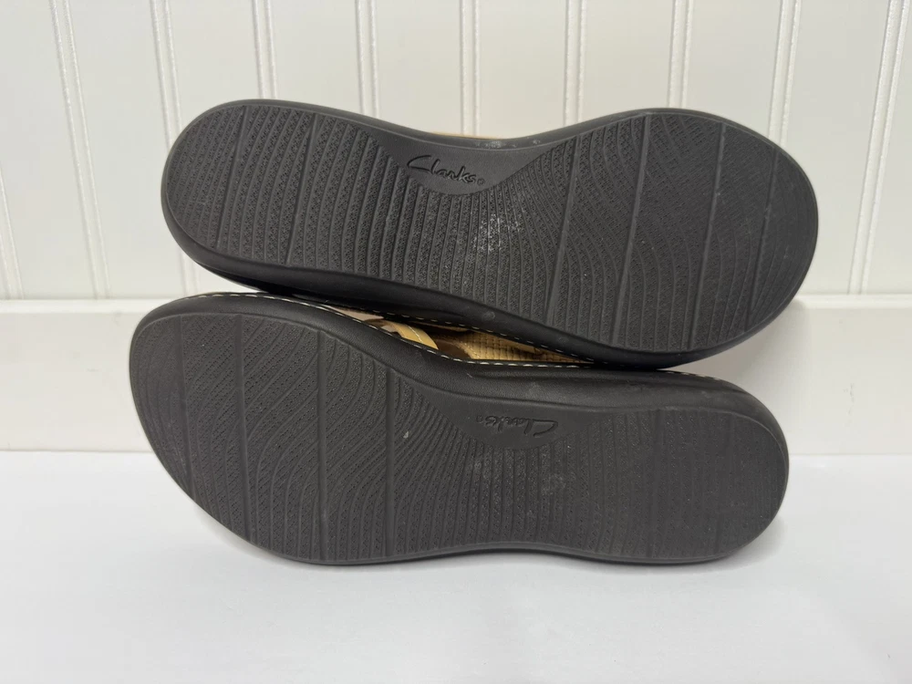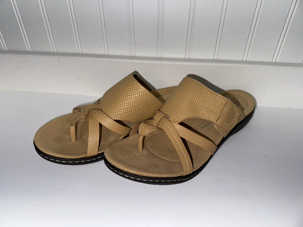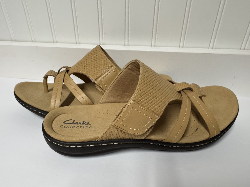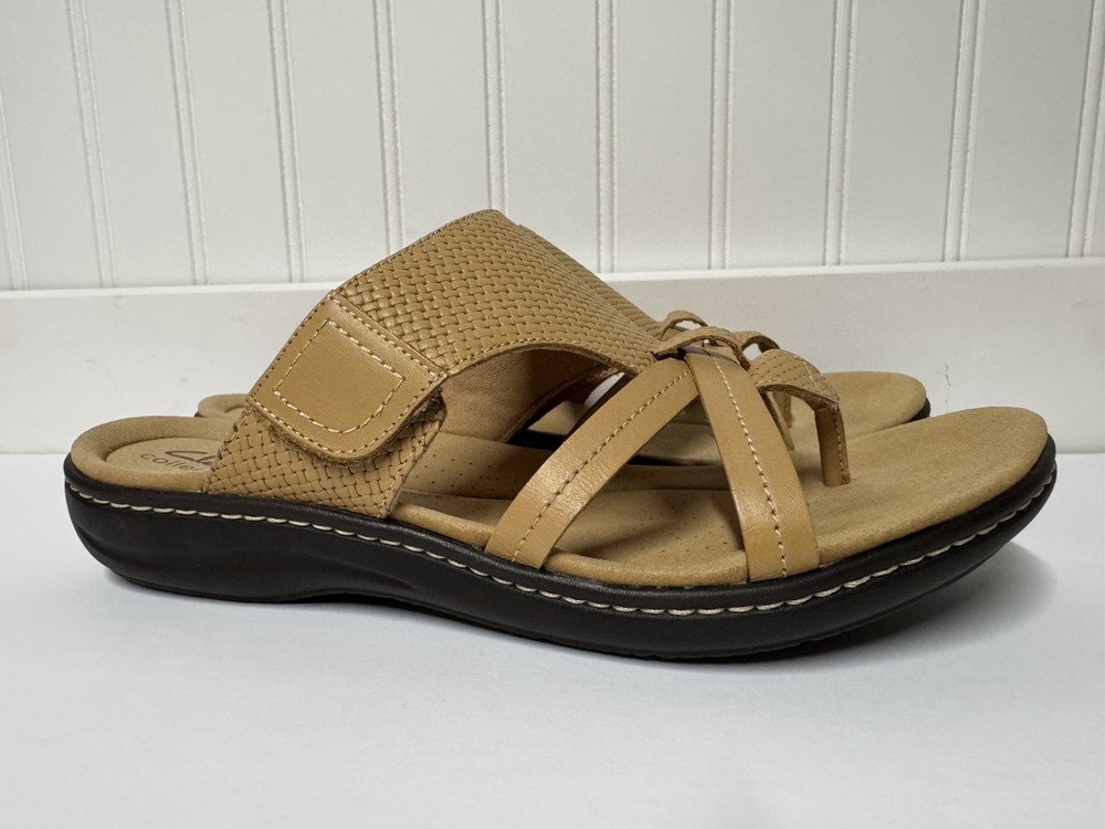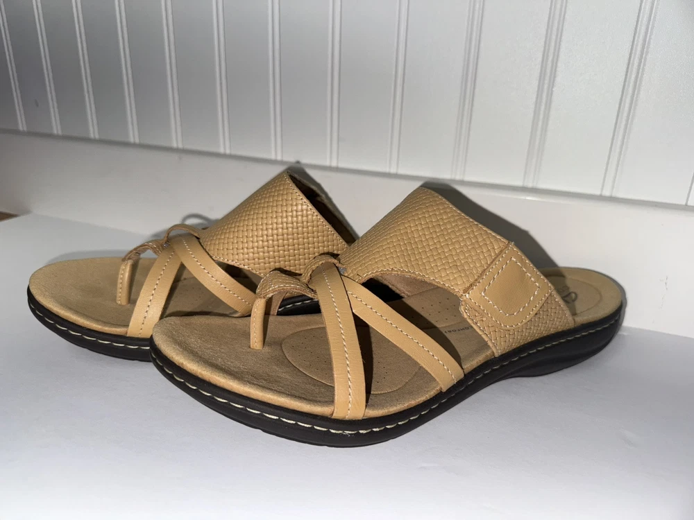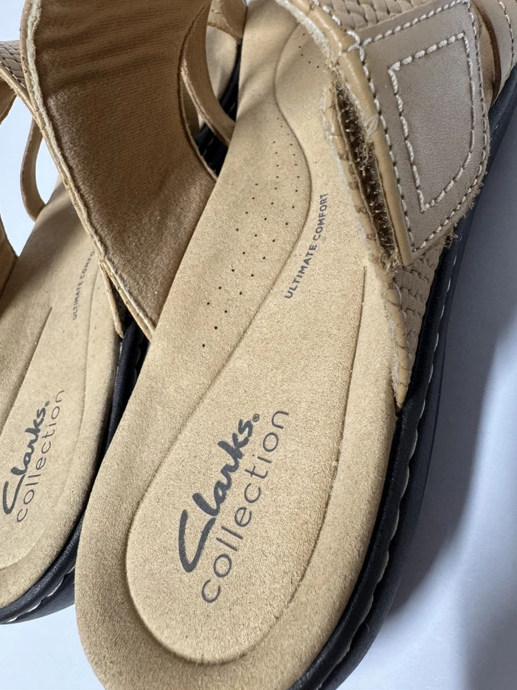 These Clarks Laurieann Edge sandals are in light tan leather with a slip-on style and adjustable strap. They feature a low wedge heel, cushioned comfort, and are suitable for spring and summer wear. The sandals are designed with a flat style, making them a versatile and comfortable choice for women's footwear. Gently worn, like new