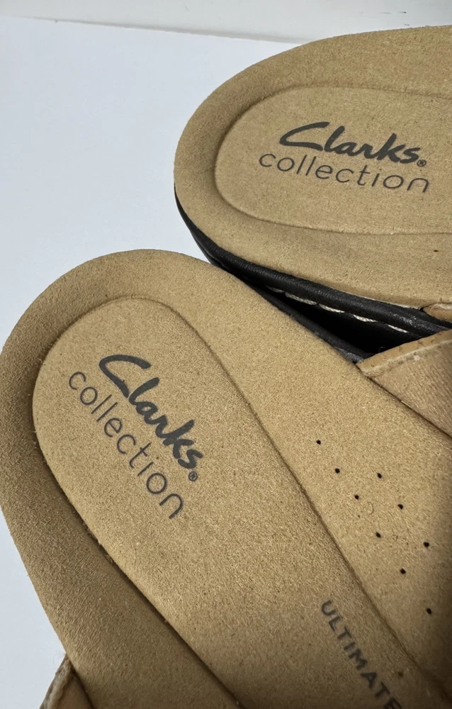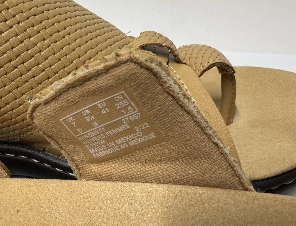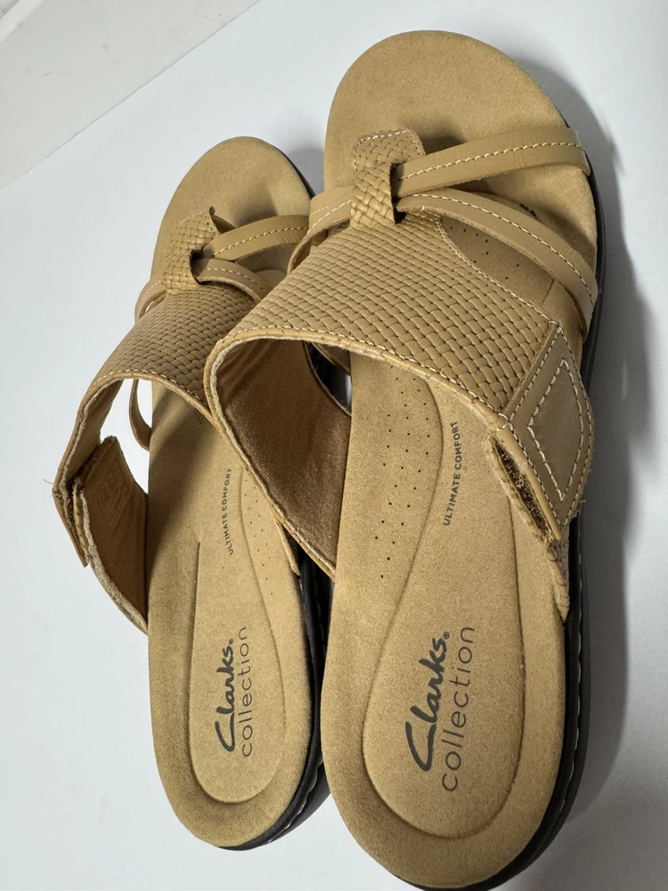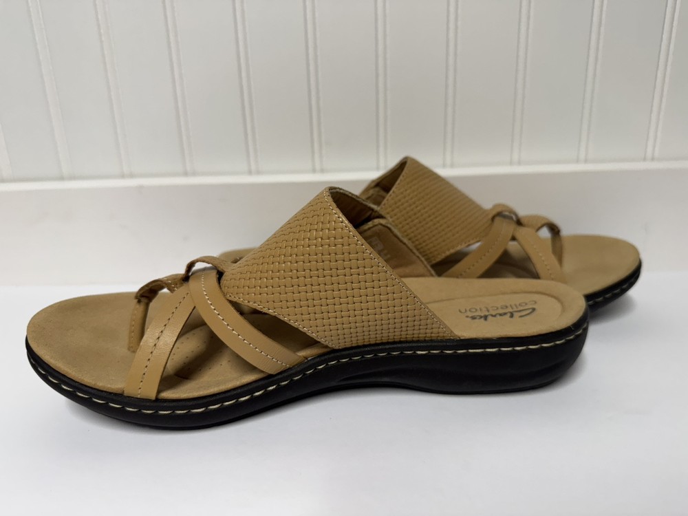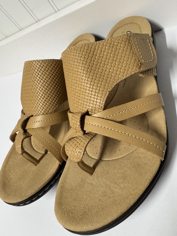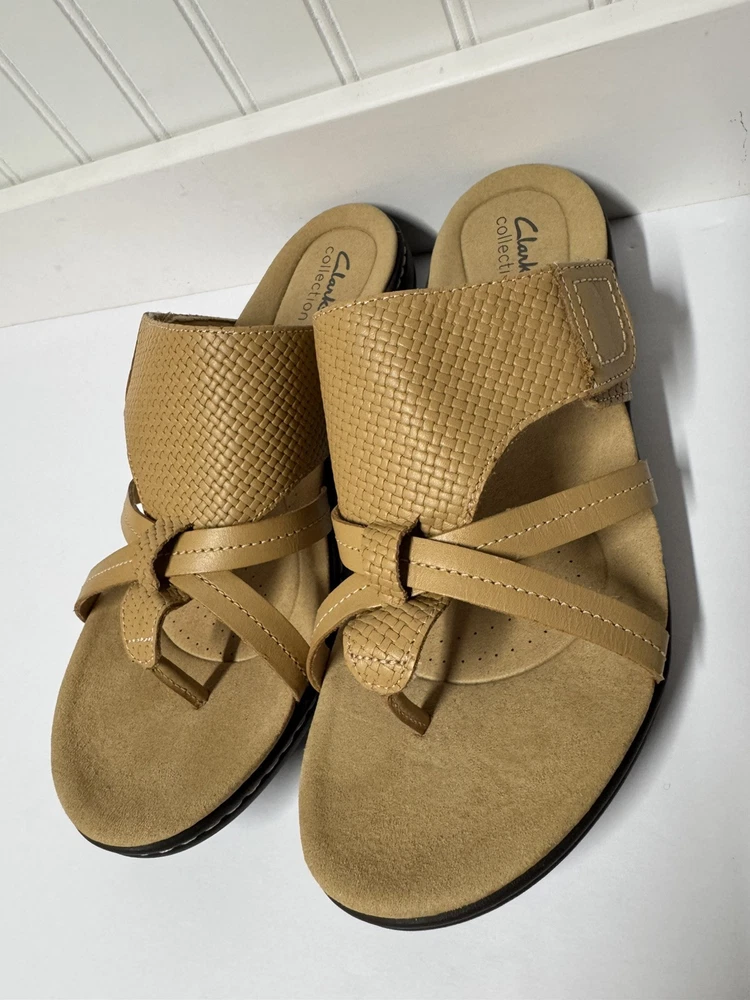 These Clarks Laurieann Edge sandals are in light tan leather with a slip-on style and adjustable strap. They feature a low wedge heel, cushioned comfort, and are suitable for spring and summer wear. The sandals are designed with a flat style, making them a versatile and comfortable choice for women's footwear. Gently worn, like new
