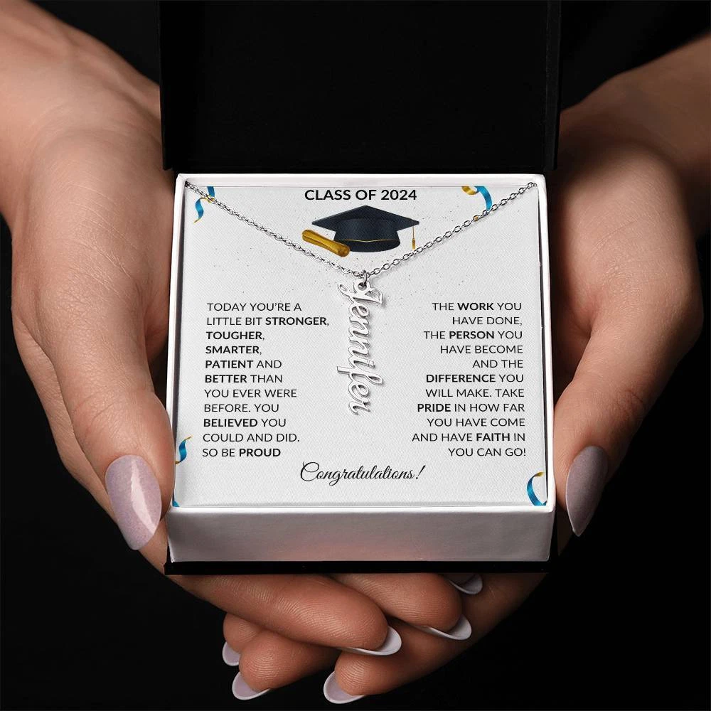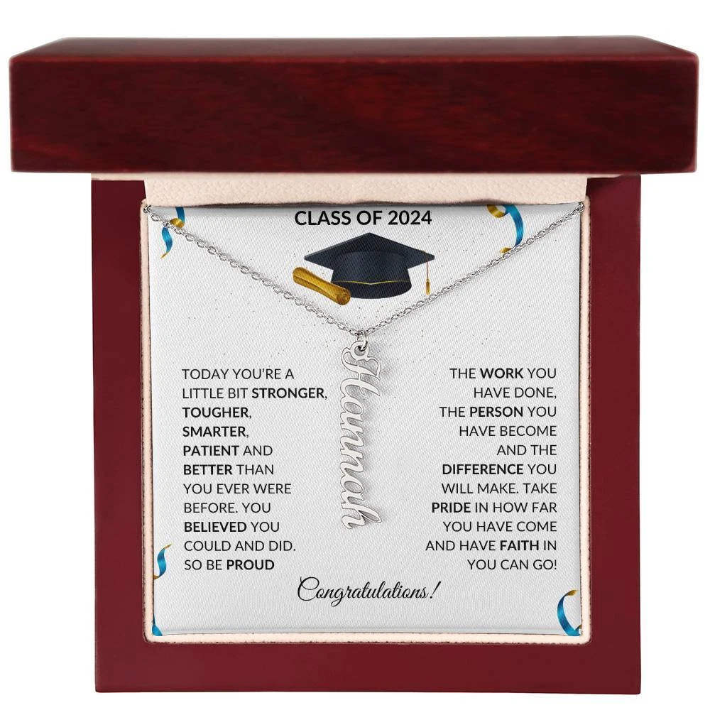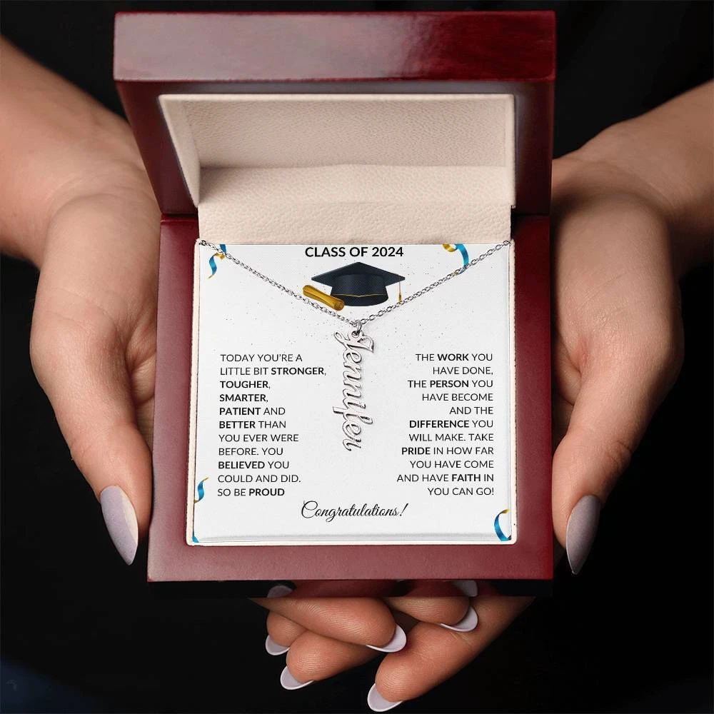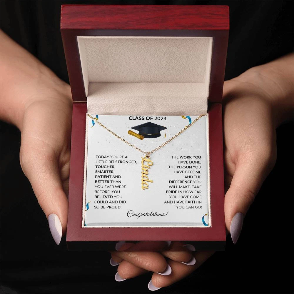 Class of 2024 graduation name necklace gift. Give your special someone a custom vertical necklace made just for them! Our Personalized Vertical Name Necklace is the perfect gift for your loved ones and will become a versatile accessory for any occasion. From a heart-warming holiday present, anniversary or birthday gift, or just because, this unique necklace adds a trendy touch to any outfit. MADE IN THE USA! This stylish necklace features a cursive name design suspended on an 16”-18” adjustable cable chain, making it both personal and beautiful! Your necklace will be custom made upon ordering in the name or word of your choice, with up to 10 characters. It's a gift that they will surely want to keep close to their heart forever! Product specifications: Customized with up to 10 characters Polished stainless steel or 18K yellow gold finish Adjustable cable chain (16”-18”) 9mm lobster clasp MADE IN THE USA! Your piece is lovingly packaged in a complimentary soft touch box for easy gifting. Elevate your presentation by upgrading to the mahogany style luxury box, which features a brilliant LED spotlight.
