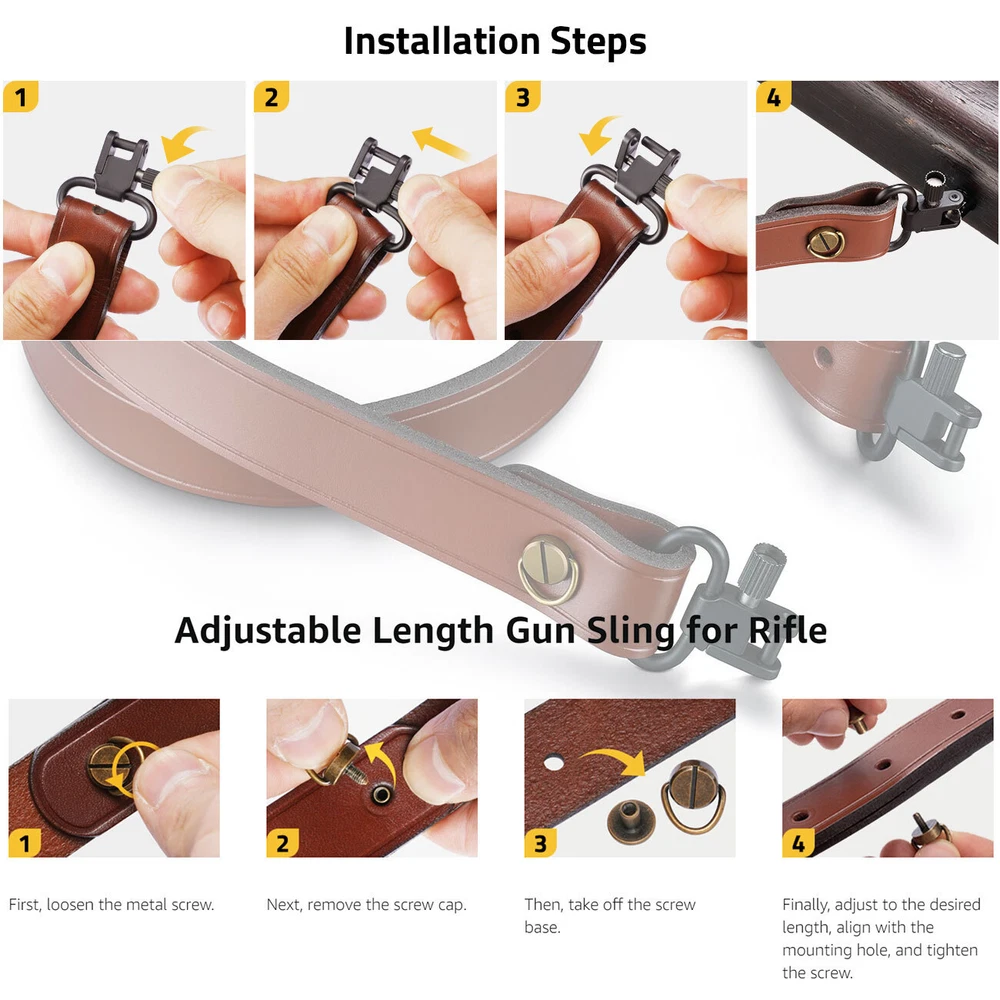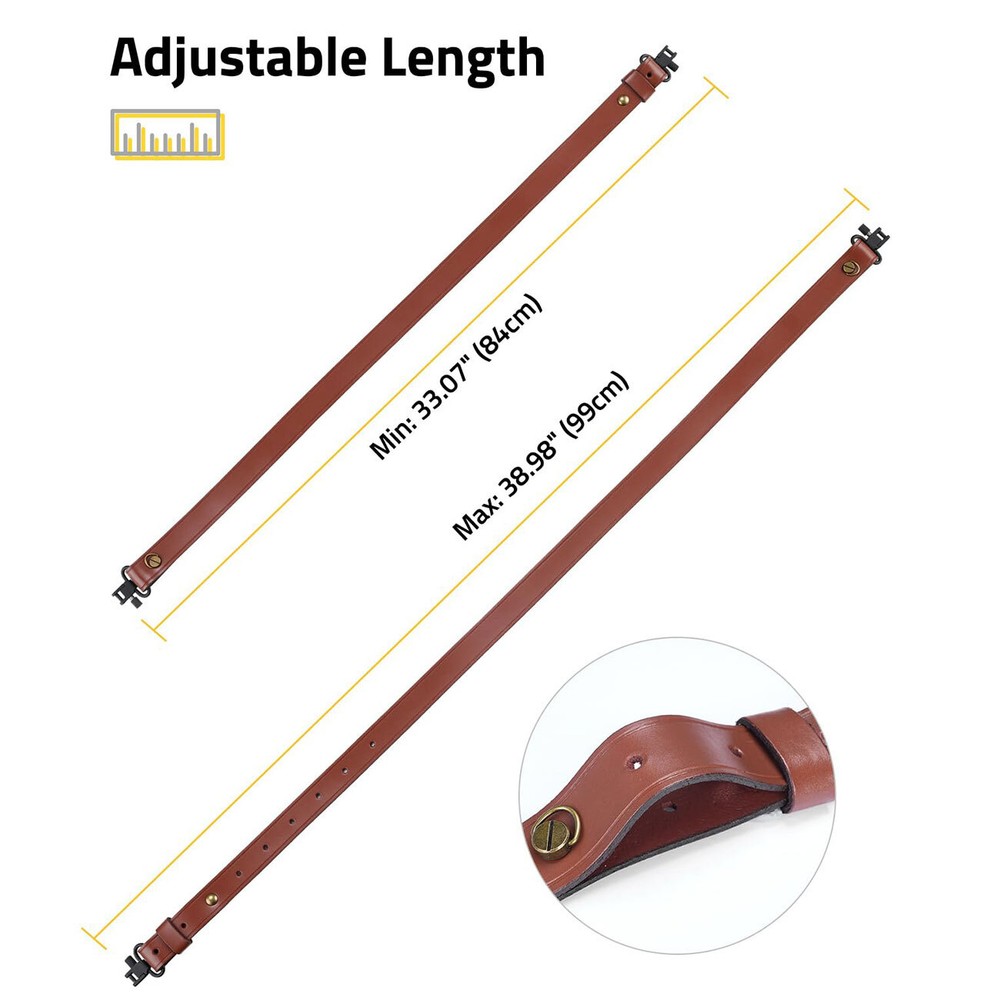 Store category Sign Up Now ! You may also like Classic 2 Point Rifle Sling Hunting Shooting Tactical Shotgun Guns Strap Leather Product Details Brand:CVLIFE Material : Leather Color : Brown Strap Length :84- 99 Centimeters Manufacturer : CVLIFE About this item Leather Sling : Our two point sling is made of leather, having smooth surface and good touch Adjustable Length : The rifles sling adjustable with multiple adjustment holes, by altering the installation position of the metal screw, you can easily adjust the length of the gun strap and find a comfortable fit Soft Shoulder Straps : Leather gun sling is soft, bend-resistant and not easily deformed, which ensures long-lasting use and reducing the friction and restraint during use Removable Sling Swivels : The metal swivels of this rifles sling offer convenient installation. It can be removed and used with other accessories to meet your different usage needs Lightweight and Portable : The gun sling is lightweight and easy to carry. Suitable for various outdoor sports. It does not take up much space and weight whether hiking or long-term outdoor sports Features of Leather Gun Sling Swivels Installation Steps for Leather Sling Adjustable Length Gun Sling for First, loosen the metal screw. Next, remove the screw cap. Then, take off the screw base. Finally, adjust to the desired length, align with the mounting hole, and tighten the screw. Widely Used Sling Strap Payment Delivery details return policy feedback Contact us Payment Great appreciate for prompt payment. Unpaid item will be filed without receiving payment in 14 days after listing ended. Shipment 1. All items will be shipped to buyer's ebay address. Before you pay, please make sure your address in ebay matches the address you would like us to ship to. 2. We will dispatch the item in business days (weekends and public holidays are not conginized as business days) after confirming your full payment. 3. As there are weight and cubage restrictions on international order, we are unable to offer you any discount. There is no local pickup service, no third party shipping carrier will be used. 4. Import duties, taxes and charges are not included in the item price or shipping charges. These charges are the buyer's responsibility. Please check with your country's customs office to determine what these additional costs will be prior to bidding/buying. Terms Of Sales 1. We are committed to give you the best customer service possible. If the item disappoints you for any reason, please contact us and we'll assist you with a prompt solution. We'd like to settle any problem in a friendly manner. 2. We want to make sure you are happy with our item. If you want to return the item for any reason, contact us within 14 days from the delivery date and we will give you a refund or exchange. Only unused, undamaged and original condition item can be qualified for a return. Buyer is responsible for return shipping fee. Please contact us to get a RMA number BEFORE sending out your return. Goods without RMA number will NOT be accepted. Please write the RMA number on the returning package. 3. We will not be liable to customer for any damages beyond the amount of money that customer actually paid us. About us Our aim is to offer our clients items with high quality and fast delivery, also our price will be reasonable. Contact us 1. We are care about our valued buyers. Please contact us through email with any questions or concerns. We will reply your messages within 2 business days. Emails, which are received at weekend, will be replied on Monday. If you do not receive a response in expected time period from us, please check your junk or spam mailbox. 2. If you are happy with our item and service, please do leave us positive feedbacks and 5 stars rate. Please email us before leaving any 1 or 2 ratings, neutral or negative feedbacks or open any cases. We understand the concerns and frustrations you might have and we, of course, will do our endeavor to resolve the issues. Please give us opportunities to resolve any problems. We thank you for your effort to make this sale and purchase experience a happy one!