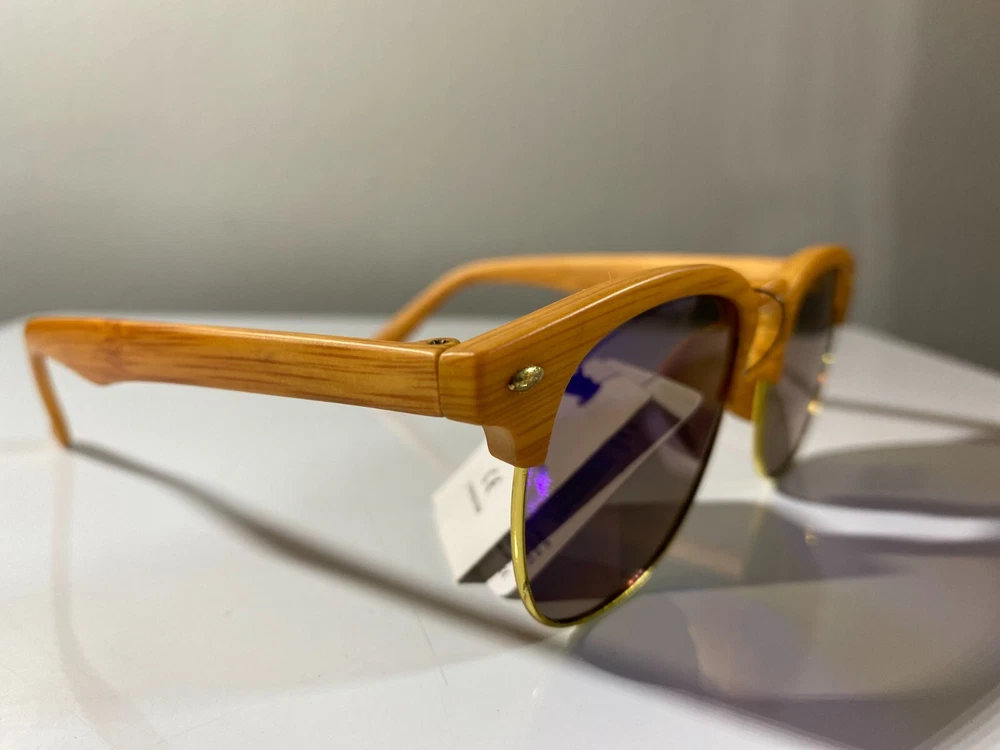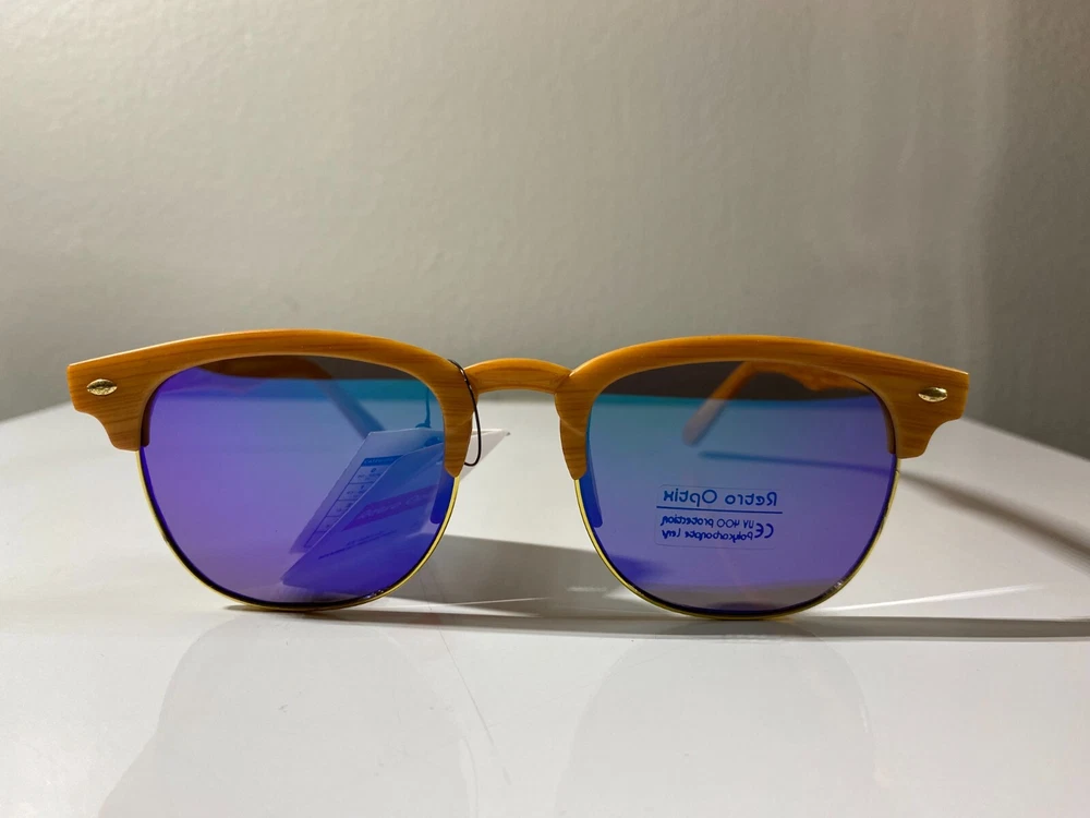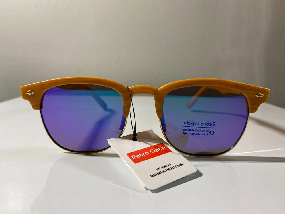 Classic 60's style sunglasses with wood like frame and purple reflective lenses.