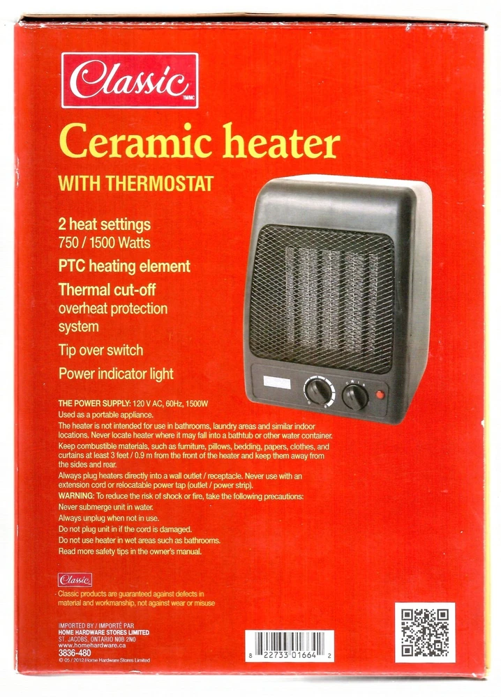 Classic Ceramic Home Heaater with Thermostat 2 Heat Settings 750/1500 Watts PTC Heating Element Thermal cut-off Overheat protection system Tip Over Switch Power Indicator Light Compact Design About: Height 8" (20cm) Width 6" (15cm) Depth 6" (15cm) Weight 45.5oz (1290g) Slightly used in a smoke-free home 4 years ago. Shortly after purchase I moved to a small apartment and recently found them in storage. 'As New Condition' (see photo's/minor wear marks) Unit is in good working order and should give you years of economic service. . SHIPPING Combined shipping is offered on all lots Prices are quoted using "Ebay Calculator" Ship the Carrier of your choice Fees (combined) may vary with Weight, Insurance Coverage, Carrier and Location Please provide Postal Code for quote You can always cancel the transaction if you don't like the price. Insured for loss/damage, covered up to $100 Extra Coverage is available shipping to Canada and USA Canada Post Expedited Service Each Additional lot(s) Will Combine Shipping normaly add $5.00 each 3 day limit Orders over $300 signature required Have a look at my other STUFF https://www.ebay.ca/sch/opportunityshop/m.html?item=167260671171&rt=nc&_trksid=p4429486.m3561.l170197