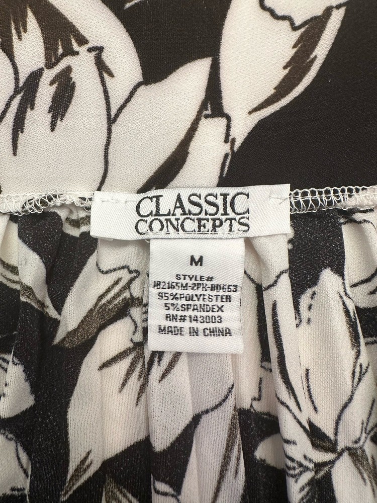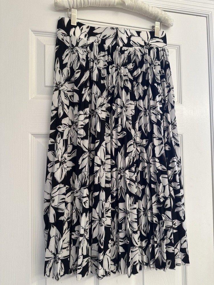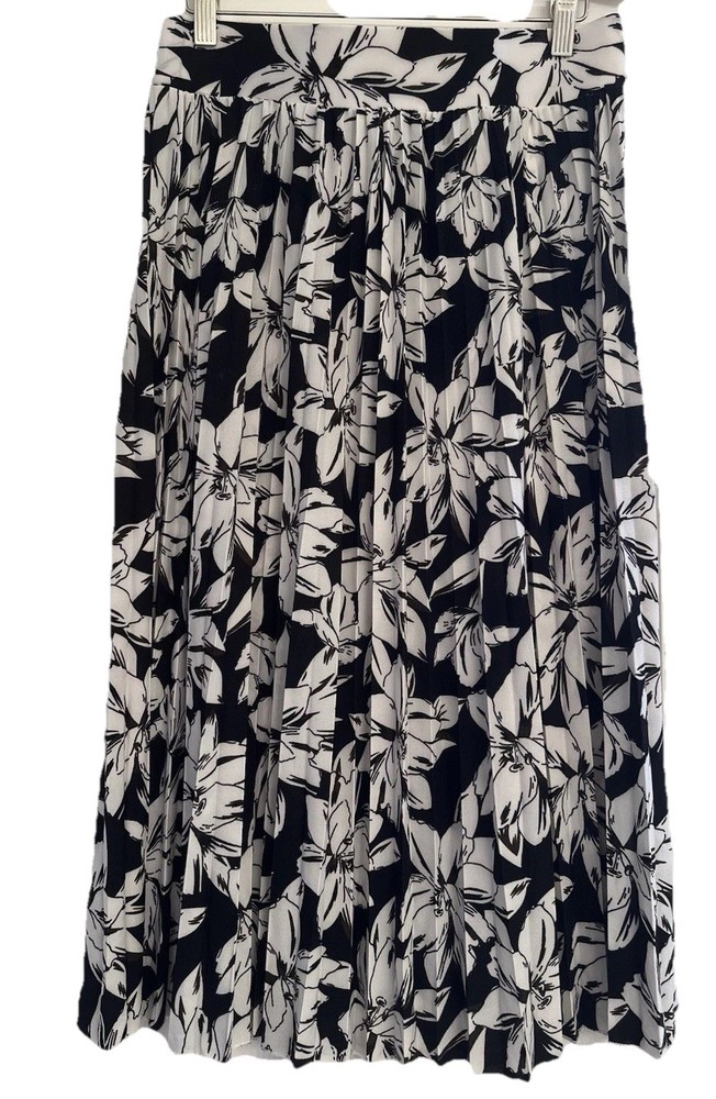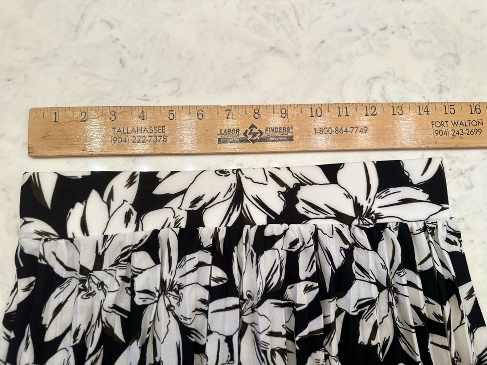 Classic Concepts Floral Pleated Midi Skirt Women Sz M Black/White Career Stretch. Condition is Pre-owned - Good. Shipped with USPS Ground Advantage.