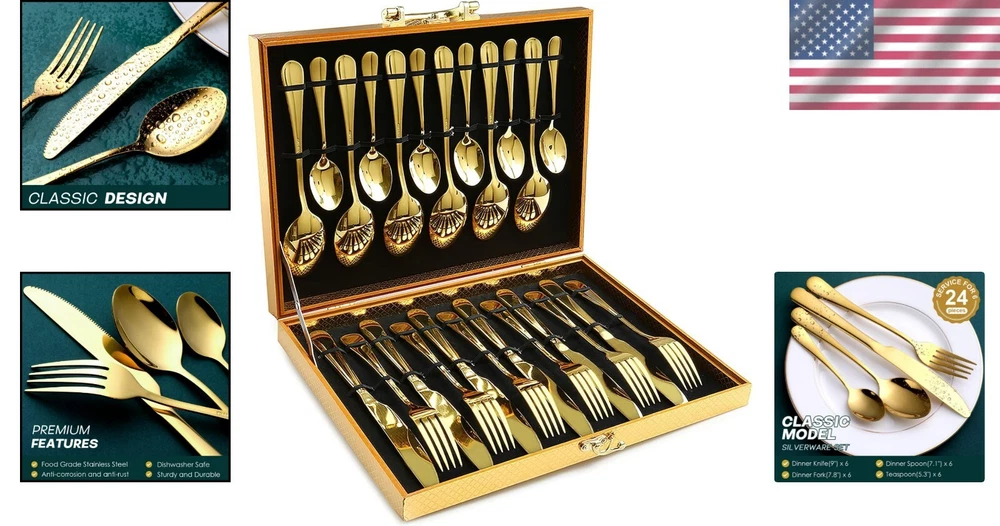 Classic Gold Silverware Set - 24-Piece Flatware for Perfect Dining Experience ‹ › ‹ › ‹ › ‹ › ‹ › ‹ › ‹ › ‹ › Classic Gold Silverware Set - 24-Piece Flatware for Perfect Dining Experience Product Overview: 24 PIECES GOLD SILVERWARE SET FOR 6 : Includes 6 Dinner Forks, 6 Dinner Knives, 6 Dinner Spoons, and 6 Tea Spoons, perfect for enhancing your home dining experience or elevating your restaurant ambiance. FOOD-GRADE 18/8 STAINLESS STEEL : Crafted from durable, corrosion-resistant 18/8 stainless steel, this set is rust-proof, non-toxic, and BPA-free—ensuring safe and healthy dining for you and your guests. GORGEOUS AND BEAUTIFUL APPEARANCE : Featuring a high-grade mirror polish, this gold flatware set reflects light beautifully, adding an elegant touch to any dining table. EXCELLENT FEEL AND PROPER WEIGHT : Designed for ultimate comfort, the handles fit perfectly in your hand, preventing slips while allowing for a seamless dining experience. The weight and length are meticulously balanced for easy handling. WORTH BUYING : Encased in gift-grade packaging, this flatware set is a splendid choice for personal use or as a luxurious gift for loved ones, making every occasion a special one. Benefits: Transform every meal into a special occasion with elegant gold accents. Durable construction guarantees long-lasting use without losing its shine. Perfectly balanced design enhances ease of use and comfort. Versatile in style, suitable for both everyday use and formal events. Why Choose Our Classic Gold Silverware Set? Elevate your dining experiences with our Classic Gold Silverware Set, fashioned from high-quality materials and carefully designed for elegance and comfort. This exquisite set not only serves your culinary needs but also adds a touch of sophistication to your table. Whether it's a family dinner or a festive celebration, this flatware is the perfect companion for every occasion. Don’t just dine; dine in style. Upgrade your dining collection today! Shipping Free & Fast Shipping - We offer free shipping to most of the USA with a normal delivery time of 3-7 days. However, due to the current situation, additional delivery time (up to 3 weeks) may be required for some items. Alternative Carriers - We may use alternative carriers (e.g. USPS, FedEx, UPS, etc.) to ensure your package arrives safely and on time. Due to the use of multiple carriers, we are unable to provide a tracking number automatically. Handling Time - Orders are processed and shipped within 1-2 business days of receiving cleared payment. Shipping Restrictions - Shipping to Alaska, Hawaii, Puerto Rico, Guam, and other US territories may incur shipping charges or delivery restrictions. Please contact us before ordering, or your order can be refunded/cancelled. State Restrictions - There may be restrictions based on your state of purchase. For example, certain items may not be shipped to California due to state regulations. Contact for Tracking Updates - If you require tracking updates or have any concerns about the delivery of your order, please feel free to contact us, and we will be happy to assist you. Return 30-Day Hassle-Free Returns - We want you to be completely satisfied with your purchase. If you are not, you can return the item within 30 days of receiving it for a full refund or exchange. Easy Return Process - To start a return, simply contact us and we will provide you with a prepaid return shipping label and detailed instructions. Restocking Fee - There are no restocking fees for returns. However, the buyer is responsible for return shipping costs if the return is not due to a seller's error. Refund Processing Time - Refunds will be processed within 5 business days of receiving the returned item in its original condition. Payment We accept all major credit cards, PayPal, and Apple Pay for your convenience. Your payment information is secure and encrypted to ensure a safe and seamless transaction. Please complete your payment within 3 days of purchase to avoid any delays in shipping. Feedback Your feedback is extremely important to us. We strive to provide the best products and customer service possible. If you are satisfied with your purchase, please take a moment to leave us a positive review. If you have any concerns or issues with your order, please contact us before leaving negative feedback. We are committed to resolving any problems and ensuring your satisfaction. Contact Us If you have any questions or concerns, please feel free to reach out to our customer support team. You can contact us through the eBay messaging system. We are available Monday to Friday, 9:00 am to 5:00 pm EST, and we will do our best to respond to your inquiry within 24 hours. Buy it now and enjoy a pleasant shopping experience! UPC: Not Set Unit Quantity: 24 Material: Stainless Steel Department: Adults Set Includes: Fork,Dinner Fork,Dinner Knife,Dinner Spoon,Tea Spoon Character: Not Set Features: Dishwasher Safe,Rustproof,Mirror Polished Type: Set Brand: Unbranded Number of Items in Set: 24 Service For: 6 Color: Gold Handle Material: Stainless Steel Country/Region of Manufacture: Not Set MPN: Not Set Finish: Polished Style: Classic Handle Pattern: Not Set Occasion: Not Set Character Family: Not Set Wood Tone: Not Set Item Weight: 4.25 lb Manufacturer Warranty: Not Set Model: Not Set Unit Type: lb Care Instructions: Dishwasher Safe Personalize: Not Set