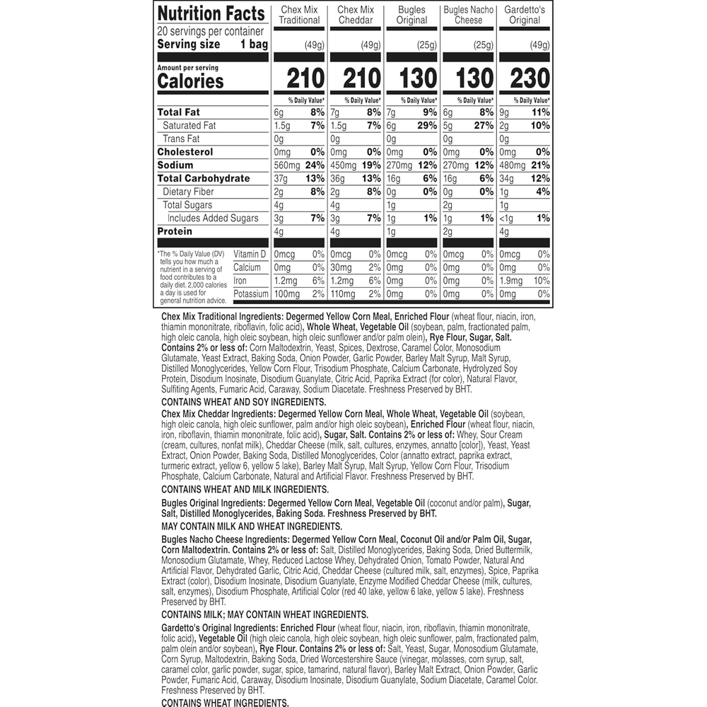 Store New Arrivals Add to Favorite View Feedback Contact Fast deliveries to the customer's home Quality customer service John Make the customers happy! Classic Mix Snack Variety Pack, Bugles Original and Nacho Cheese, Gardetto'S Original Recipe, Traditional and Cheddar, 20 Ct, 28 Oz Description SNACKS VARIETY PACK: A variety pack of snack favorites that brings you an exciting and delicious mix of tastes, shapes, and textures CLASSICS YOU LOVE: There's something for everyone in this classic snack pack; Original and Nacho Cheese Bugles, Original Gardetto's, and Traditional and Cheddar Chex Mix STOCK THE PANTRY: Single serve bags make an ideal snack to add to the lunch box, backpack, or take on the go; These salty snacks are not your standard pub mix, trail mix, or bar snack assortment PARTY FAVORITE: Endless taste and texture combinations make these bags convenient for get-togethers of all shapes and sizes; Perfect for team snacks, kids parties, care packages, and more CONTAINS: One 28 oz variety pack box of Classic Mix snacks with 20 single serve bags; 4 bags each of Bugles Original, Bugles Nacho Cheese, Gardetto's Original Recipe, Chex Mix Traditional Original Recipe, and Chex Mix Cheddar When you're looking for a mouthwatering medley of snacks to keep the whole crowd happy, look no further than this Classic Mix variety pack of snacks. Pick and mix from Bugles Original and Nacho Cheese Crispy Corn Snacks, Gardetto's Original Recipe Snack Mix, and Chex Mix Traditional Original Recipe and Cheddar Snack Mix. These convenient, single serving bags are perfect on the go, and there's something for everyone in the family to enjoy. Pack an individual snack bag in a lunch box or a school snacks tote. Hand out bags to the team after a sports game. Keep it on hand whenever kids and teens are looking for a crunchy snack. Grab a couple bags as tasty and convenient road trip snacks. This 20-count variety pack means there's enough tasty fun to share. Includes four bags each of Gardetto's, Bugles Original, Bugles Nacho Cheese, Chex Mix Traditional, and Chex Mix Cheddar. Number of Items 1 Product Dimensions 13.75 x 10.75 x 5.5 inches; 1.75 Pounds Item Weight 1.75 Pounds Allergen Information Milk, Soy, Wheat Units 28.0 Ounce Flavor Variety Pack Size 28 Ounce (Pack of 1) ABOUT US We offer the best prices around on high quality products. Our E-store includes media such as books, movies, music and games while offering electronics, toys, sporting apparel, clothing, tools, general home, garden items and more. SHIPPING We are always working hard to ensure your package arrives as soon as possible. Please understand that some factors like weather, high postal traffic, and the performance of shipping companies are outside of our control. We offer free shipping to the lower 48 states and ship within 2 business days of payment, usually sooner. We do not accept P.O. Boxes. Please provide a physical address. For shipping outside of the continental USA, we only use eBay's Global Shipping Program. The item is shipped to KY and then sent to the rest of the world. International customers are responsible for all duties and taxes. Continue to 'check out' to calculate costs for shipping the item to your country. Messages regarding eBay's Global Shipping Program MUST be directed at eBay EXCLUSIVELY. RETURNS We offer a 30-Day Return Policy on items in which you are not completely satisfied with. You have the option of a full-refund or an exchange of the item. No returns are available on items shipped outside of the USA PAYMENT We accept PayPal. CONTACT US This page content is yet to come Please ad us to your favorite seller and visit again later Thank You CUSTOMER SATISFACTION We try our very best to make sure every customer is completely satisfied. If there's a problem, message us! We're happy to help. WE ACCEPT