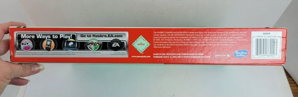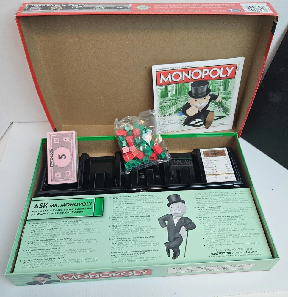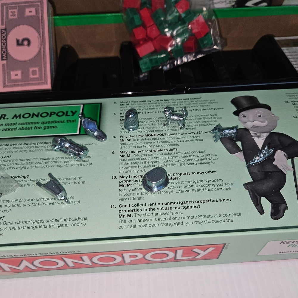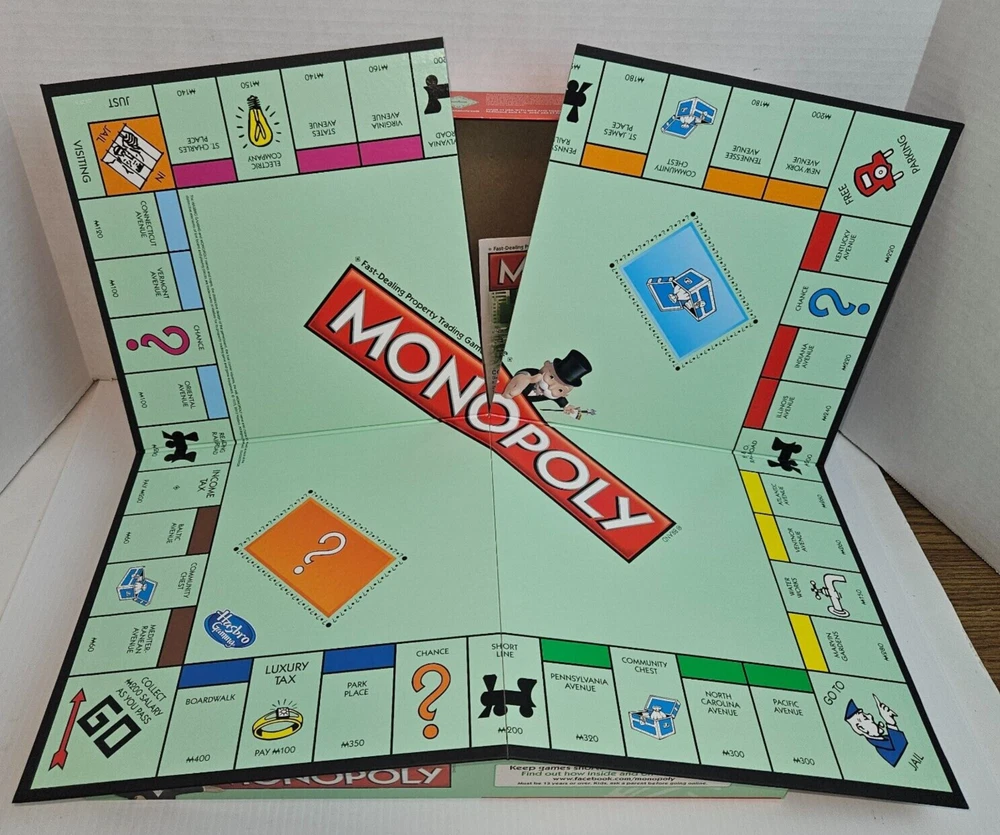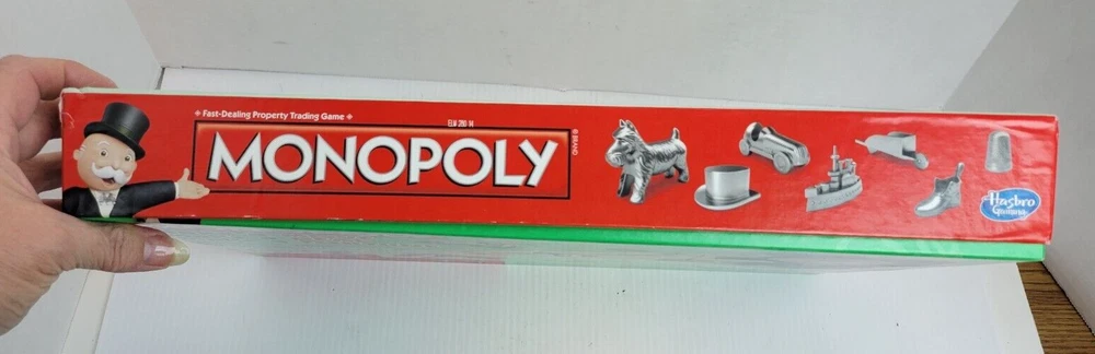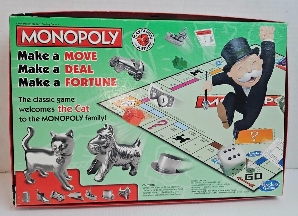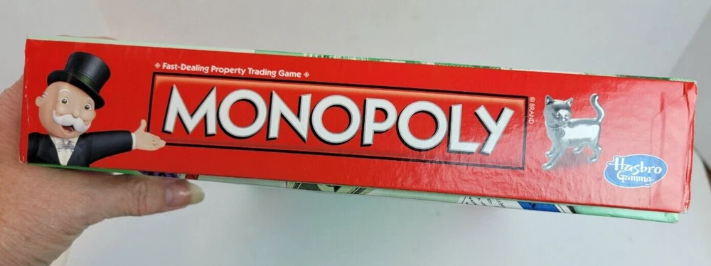 Experience the thrill of buying and selling properties in the classic Monopoly boardgame. This timeless game is perfect for players of all ages and skill levels. Challenge your family and friends to a game of buying, selling, and trading properties while building your wealth and becoming the ultimate Monopoly tycoon. With its iconic brand, Hasbro, and countless hours of fun, this game is a must-have for any boardgame enthusiast. Play solo or join in on the excitement of buying and selling properties with others. This classic Monopoly boardgame is sure to provide hours of entertainment and laughter. Game pieces: wheelbarrow, car, shoe, thimble, top hat, dog, steamboat and new cat.