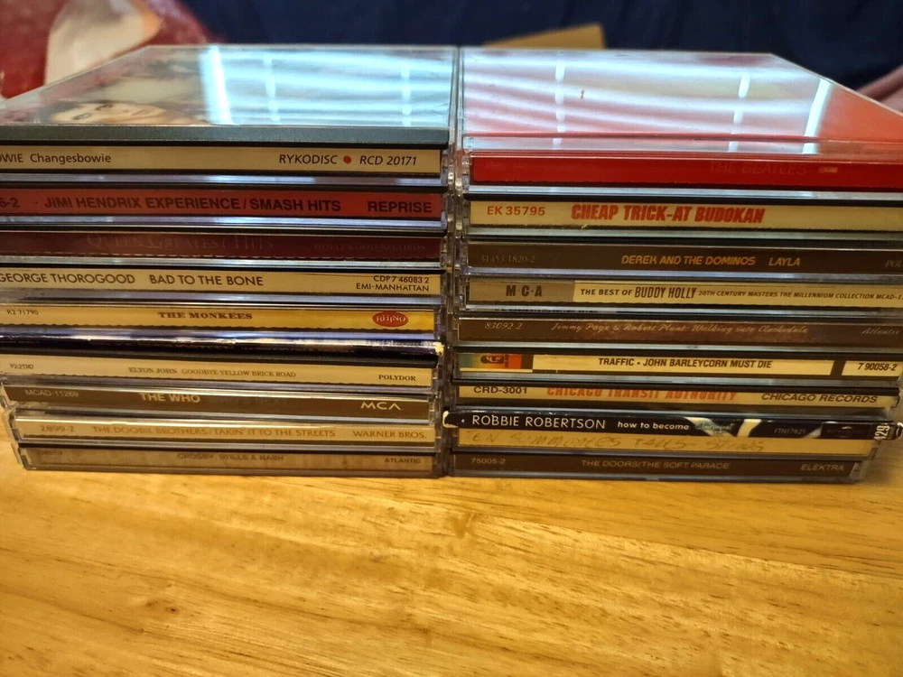 20 release CD lot includes: Jimi Hendrix - Smash Hits" 1972 Reprise 075992723824 Derek & The Dominos "Laya & Other Assorted LOve Songs" 1970 Polygram UPC 731453182028 The Beatles "1" 2000 Capitol / Apple Records UPC 724352932528 The Doobie Brothers – "Takin' It To The Streets", 1976, Warner Bros, 081227991241 Queen – "Greatest Hits", 1992, Hollywood Records, 720616126528 David Bowie - "ChangesBowie" 1980, RykoDisc, Music Club version Bruce Springsteen – "Working On A Dream", Columbia, 886974135524 Cheap Trick "At Budokan" EPIC Records 07464357952 The Who "Who' Next" MCA 008811126926 Traffic "John Barleycorn Must Die: Island BMG Music Club edition Crosby Stills & Nash "Crosby Stills & Nash" Atlantic 075678265129 Elton John "Goodbye Yellow Brick Road" Polydor 020831471060 (Columbia House Record Club version) Jimmy Page & Robert Plant – "Walking Into Clarksdale", 1998, Atlantic Records, 075678309229 (promotional copy) George Thorogood & The Destroyers – "Bad To The Bone", 1982, EMI/Manhattan, 077774608329 Robbie Robertson – "How To Become Clairvoyant", 2011, 429 Records, 795041782120 Monkees - "The Monkees" 1994 Rhino 0208311027223 Columbia House Record club version Sting - "Ten Summoner's Tales", 1993, A&M Records (No art work - CD in case only) Chicago - "Chicago Transit Authority" 1969 Chicago Records 703404300126 Doors - "Soft Parade" 1975 Elektra Records 075596067323 Buddy Holly - The Best of 20th Century Masters 1999 MCA Records 008811195625
