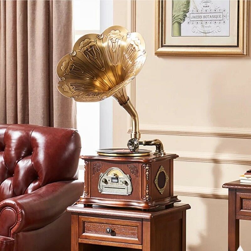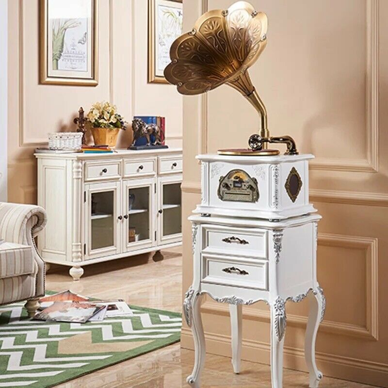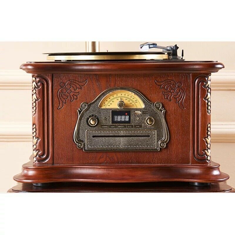 Product Description Product name Rococo gramophone,vinyl player,record player,bt, CD , USB , AM/FM radio Wood raw materials Selected pattern beech Color Brown & White Silver tracing Function HiFi level vinyl record player, CD, radio, USB, WIFI, Bluetooth, full format lossless Sound effect HiFi level 2.0 sound system KEF same factory speaker unit Features CD player,Vinyl record player Amplifier With Toshiba Frequency divider With Jiaxun Speed 33 / 45 / 78rpm