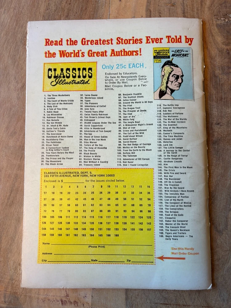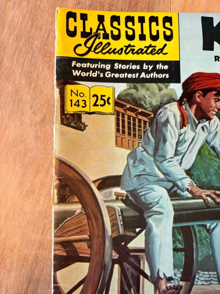 Dive into the timeless adventures with Classics Illustrated #143, featuring Rudyard Kipling's "Kim." Published by Gilberton, this comic book is a tribute to the Silver Age of comics, embodying the rich tradition of US action/adventure storytelling. The English language tale is gracefully adapted, staying true to the spirit of the original work, and is a must-have for any collector or enthusiast of literary classics in graphic form.With its grade of 5.0 Very Good/Fine, this edition promises a wonderful reading experience, showcasing quality artwork and storytelling that captures the essence of the era. Whether you're a fan of Kipling's narrative or a connoisseur of vintage comics, this piece adds a unique blend of history and entertainment to your collection.