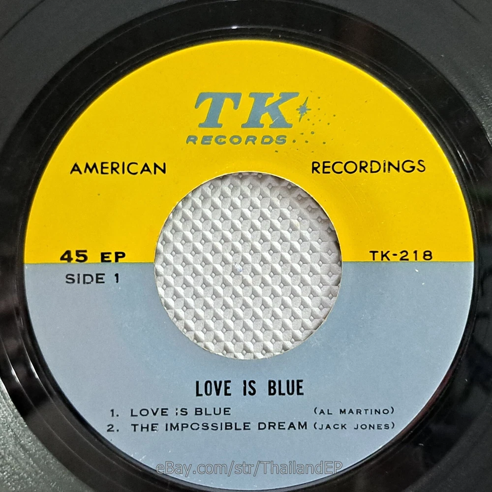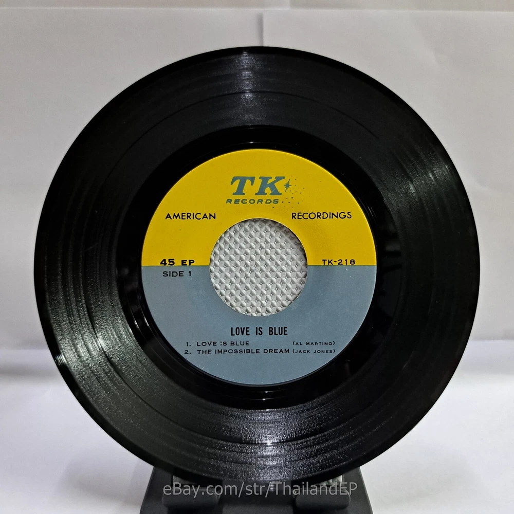 Welcome to The World of ""Thailand Vinyl Records"".Very rare and beutiful picture of cover. Check everyday . This item is for a true 7" single collector. It was printed and sold locally as limited EP back in the early 70's. Only few copies were spread outside Thailand. Most professional record collectors know that it is scarce nowadays and is absolutely a collector's item. If you know a UK magazine called RECORD COLLECTOR then you must have read many articles mentioning THAILAND EP and this is it !!! Here is your chance to own one-of-a-kind piece of Asian's 7" single history. Description Records !!! DETAIL SONG and ARTIST !!! Side A: A1 = Al Martino - Love Is Blue / A2 = Jack Jones - The Impossible Dream Side B: B1 = Claudine Longet - Love Is Blue / B2 = Claudine Longet - Harpy Talk Label&Catalogue number : : TK218 Country of release : THAILAND Condition (Sleeve/Disc) : Poor / VG+ and pls see picture too. Shipping I am seller in Thailand not USA.So I can not ship 4$ as policy pls understand this real rate from oversea . Price for shipping(Airmail )&Packaging to worldwide only US 14.99 USD .Except Asia and JAPAN only 14.99 USD. You can save cost for combine shipping only 3 USD$ per each. 2xEP=17.99 USD$ , 3xEP=20.99 USD$ . My package very safety by big cardboard don't worry about your's EP/PS/LP. Time delivered 21-45 days . ***All item : have tracking system no need add money*** **For normal shipping (Airmail).Time delivery to ITALY maybe use 1-2 Months, France use 1-2 Months.But Don't worry item will arrived to you sure!!.For fastest and High value you can use Express Mail Service cost for1 EP =39 USD.EP will arrived to you within 5-7 Days. ***All shipment have fully tracking system *** Payment PAYMENT : I accept the follow payment by eBay managed , . My ID eBay provide by eBay .Account will be provide at the end auction.Charges to be covered by winner. If you have question pls email to me anytime i can answer immediatly. I have many EP,PS 7" Thailand Pls Click => View seller's other items Check my feedback , I care and honest all customer.I welcome 0 feedback but contact me first if you will bidding. Good Luck !!!! and Enjoy . 45 RPM / EP/ LP Grading Scale: Mint /NM/ Excellent(VG++) /VG+/ VG /G+ /Good(G) / Fair / Poor / Bad (According Record Collector Magazine (UK)) LOT150-08TK218