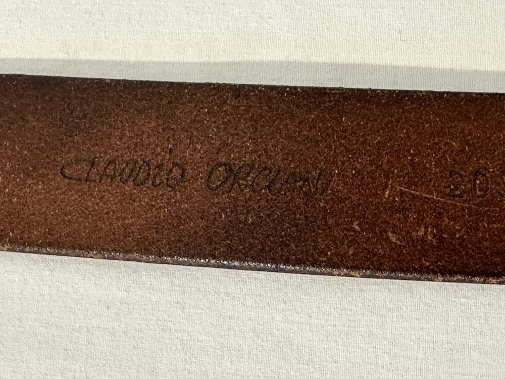 Claudio Orciani Brown Leather Belt Leather Wooden Buckle Italy 2031 43” Good Normal Wear Light Scuffs One Water Mark Lines On Leather From Buckle SEE PICTURES FOR CONDITION Measures 43”