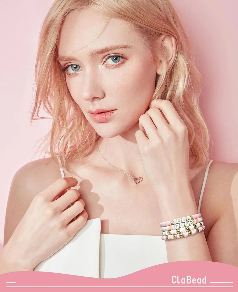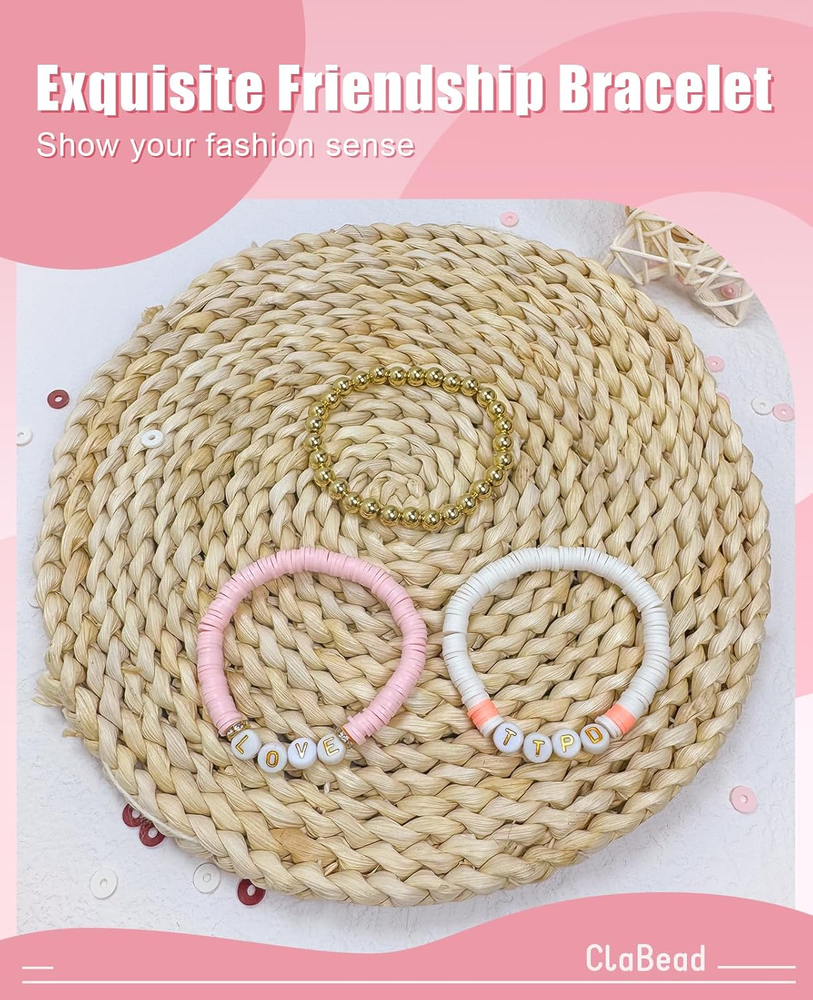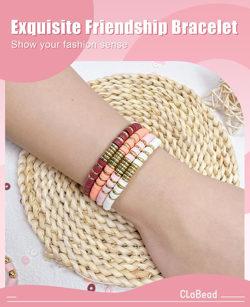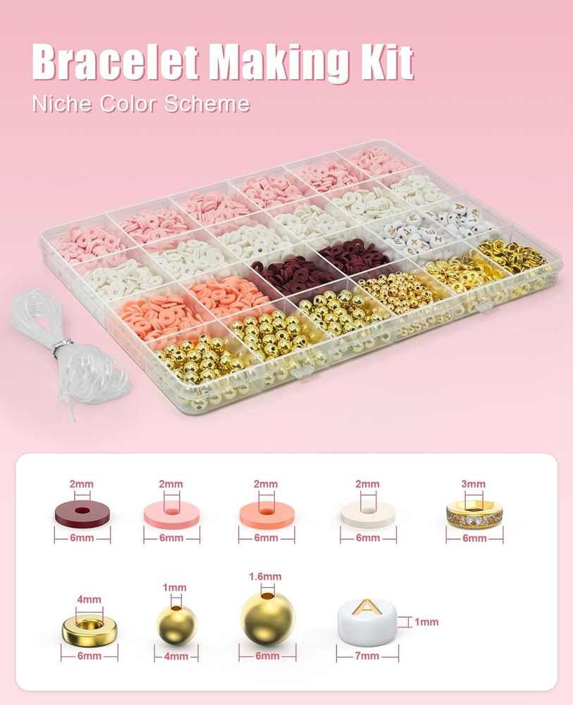 Clay Beads Bracelet Making Kit: Light Pink Clay Beads + White Clay Beads + Orange Clay Beads + Rose Red Clay Beads + Letter Beads + 6mm Gold Beads + 4mm Gold Beads + Gold Spacers , all packed neatly in a handy storage case with compartments. Lots of light pink and white beads can be used to create neutral bracelets, while a few orange/rose/gold toned beads can make friendship bracelets more interesting Niche Color Scheme: Carefully select niche and fashionable colors and match them with gold beads to create a unique sense of fashion and show independent personality Unleash Your Creativity: This bracelet bead kit can be used to create friendship bracelets, necklaces, anklets and more. Wear these bracelets of your own design to show off your own style and express your own emotions Fun Family Activity: This clay bead bracelet kit is suitable for the whole family to play together, keeping children away from video games and establishing a warm parent-child relationship. Not for children under 4 years. Cute DIY Craft Gift: This friendship bracelet kit not only improves girls' crafting skills, but is also a way to have fun with self-expression. This is a great arts and crafts gift for your daughter, granddaughter, or yourself Product Description Unleash Your Endless Creativity With thousands of clay beads and various charm accessories, you can make bracelets in different styles to match your style, outfit, or both! So Many Options Perfect for DIY crafts like jewelry making, bracelets, necklaces, earrings, anklets, keychains, and any ornaments. Ideal Gift for Girls This bracelet-making kit perfect for holiday playtime. A thoughtful and joyful gift for birthdays, Christmas, Thanksgiving, Mother’s Day, and more!