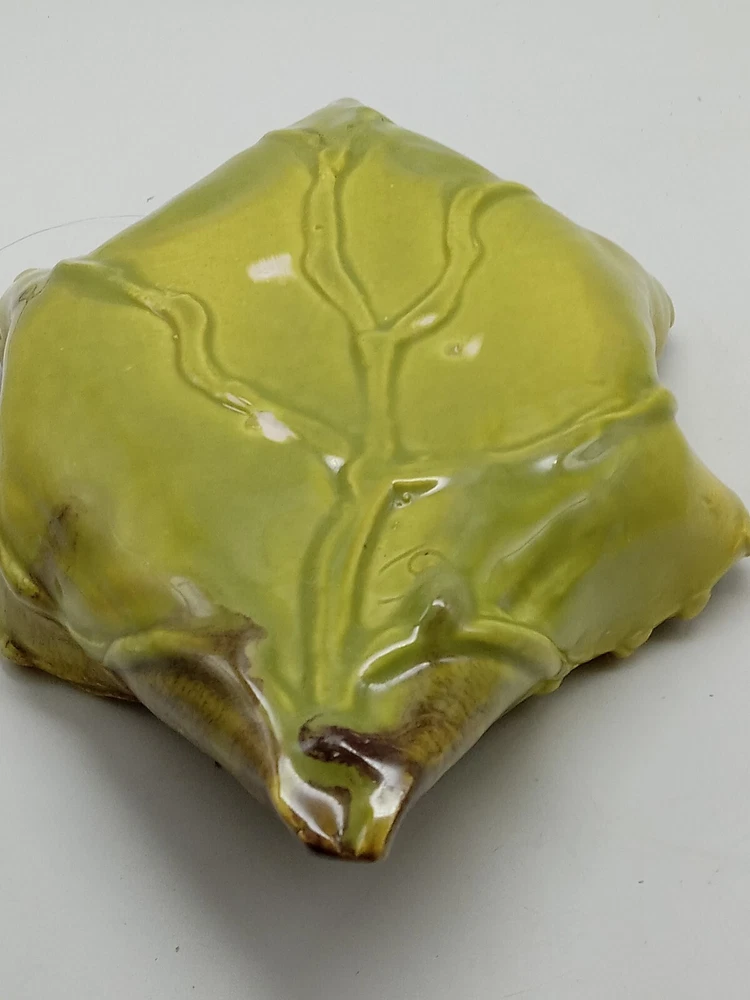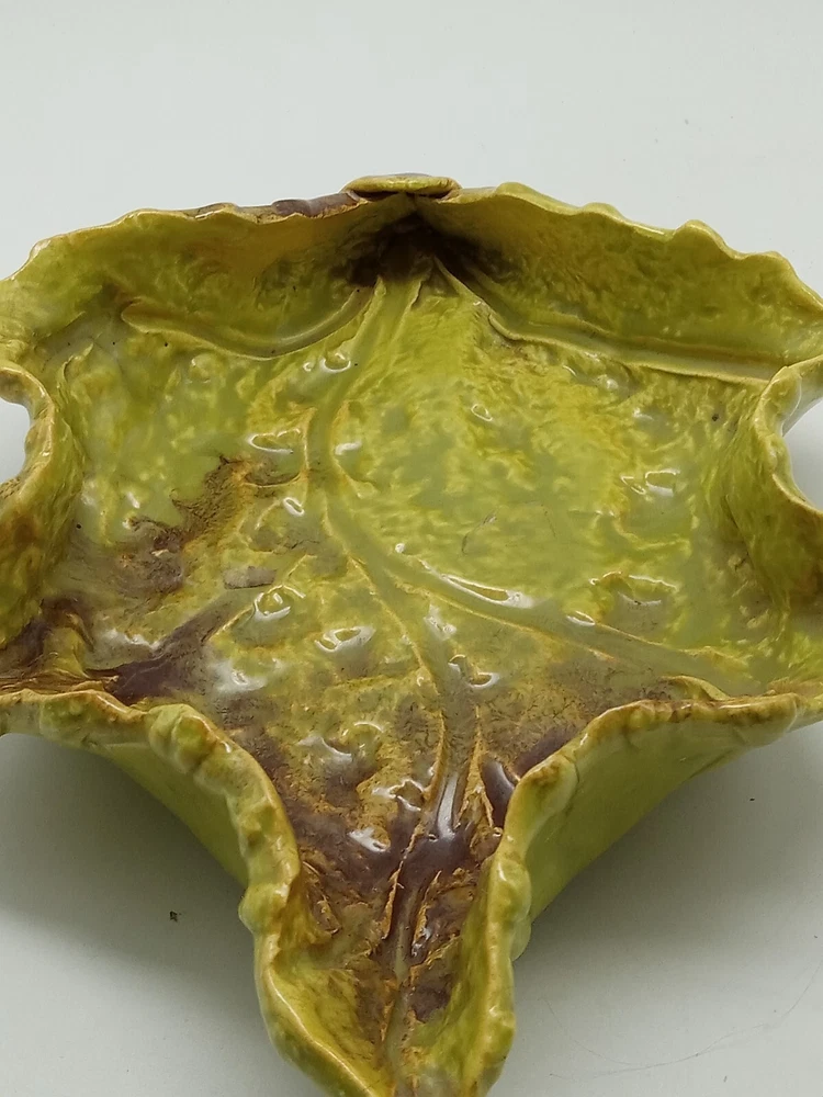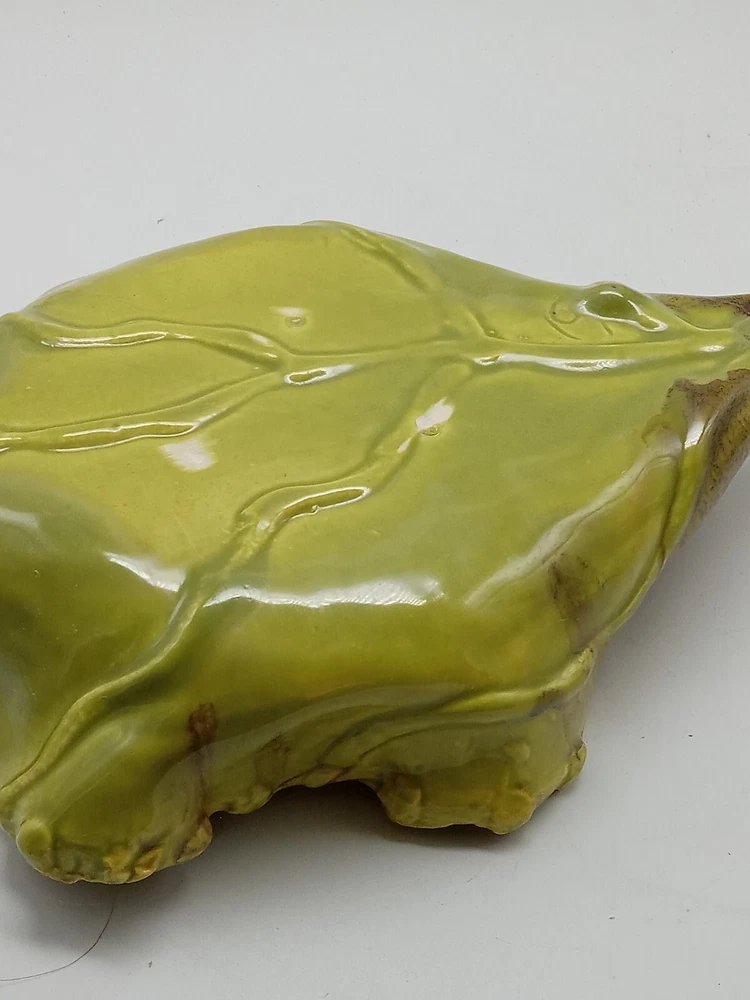 This beautiful decorative bowl features a leaf pattern on its surface, with realistic browns and greens. The bowl is made of clay and has a nice glaze. It's perfect for storing small trinkets, candy, or nuts, and would be a great addition to any collection. The bowl is unmarked and its origin is unknown, but its handmade production style and pottery technique give it a unique character. The set includes one bowl and its backstamp reads 61 or 19 (unclear). Don't miss the chance to own this beautiful piece of art pottery, which will add a touch of natural beauty to any space. 10.5 inch long 7 inch wide 2 inch deep Unique