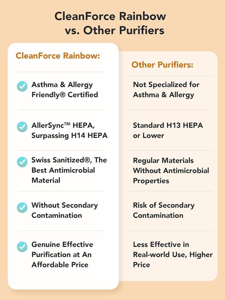 LARGE PERFORMANCE: Experience fresh air in minutes with CleanForce air purifier, featuring a 550 CADR HEPA filter that effortlessly purifies up to 2,550 sq ft per hour. Outperforming traditional small room models, ideal for dorms, offices, and basements TRIPLE-FILTER TECHNOLOGY: Enjoy cleaner air with a three-stage filtration system that efficiently removes pollutants. CleanForce air purifier captures larger particles like hair, pollen, and pet dander with a pre-filter; H13 True HEPA filter removes up to 99.97% of dust, bacteria, and viruses; iMACT activated carbon filter absorbs wildfire smoke, cooking odors, and VOCs HIGH-TECH CONTROL: Easy operation with app remote and voice control. Features a 12-hour timer, three fan speeds, and filter replacement reminders, while the HD LED display monitors air quality in real time, making it an ideal choice for home air purifiers WHISPER-QUIET OPERATION: Fall asleep quickly with a peaceful environment of 29dB. CleanForce room air purifier provides a relaxing experience, especially at the lowest fan setting, effectively eliminating noise. Perfect for bedrooms, living rooms, it ensures effective purification for restful moments LONG-LASTING: Running day and night for continuous purification. Exceptional durability and a clog-resistant design combine with advanced filtration technology to ensure high energy efficiency and superior indoor air quality. Our HEPA air purifier creates a healthier living environment for you SAFETY CERTIFIED: CleanForce air purifier is equipped with high-quality, replaceable filters for optimal performance. Home purifiers are ETL Listed, FCC Certified, California air resources board (CARB), CA PROP 65 compliant, RoHS compliant OUTSTANDING CUSTOMER SUPPORT: With 24/7 local support in Chino. California, Rainbow air purifier ensures high customer satisfaction and reliable assistance for your air purifier needs